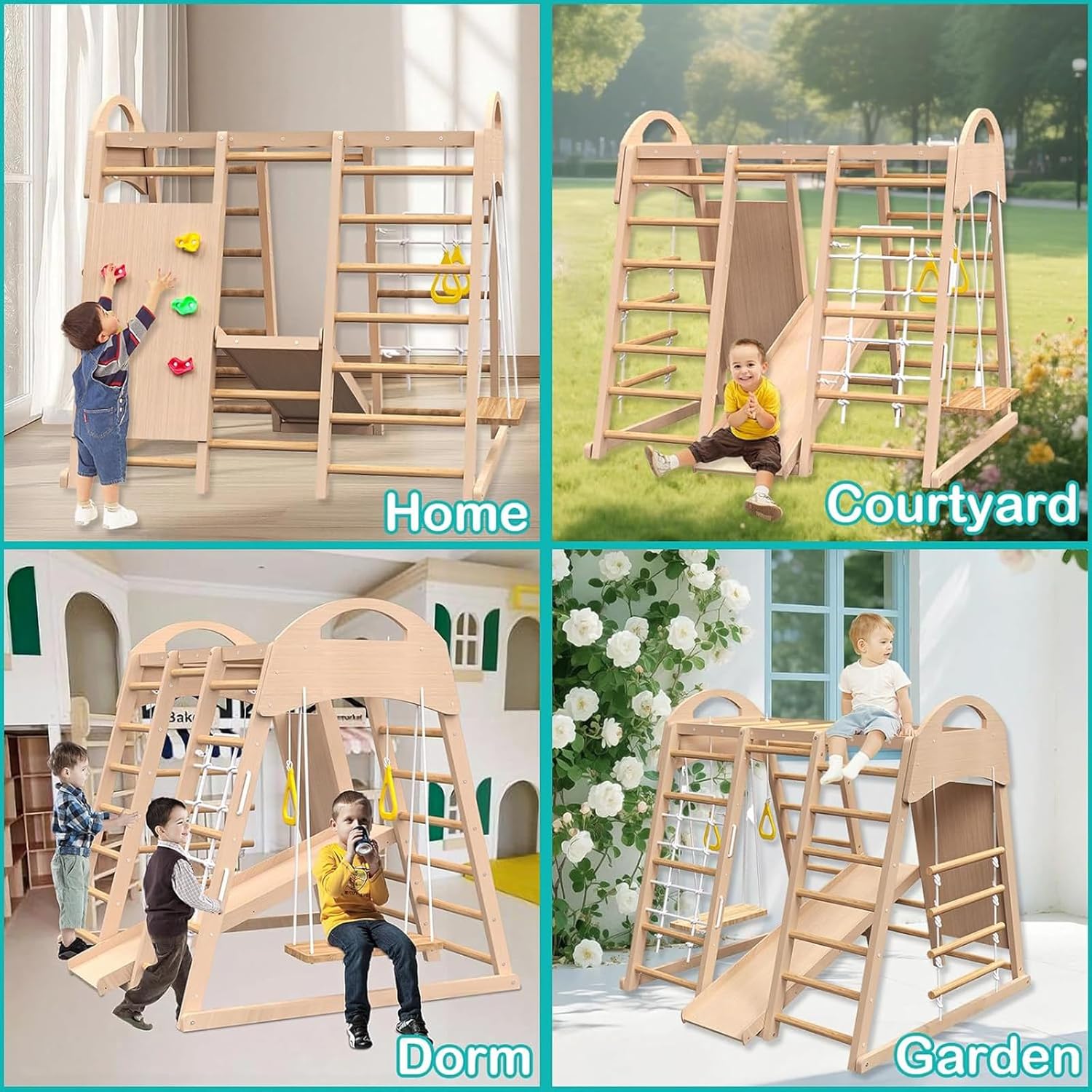 【Set di giochi 7 in 1】: Questa palestra da gioco in legno per interni include un'altalena, un paio di anelli per altalena, una scaletta da arrampicata, una struttura da arrampicata, una rete da arrampicata, uno scivolo e la possibilità di fissare un tappetino sotto il treppiede da utilizzare come tenda. Di conseguenza, i bambini vivranno ore di divertenti avventure. 【Scivolo allungato con protezione】A differenza di altri scivoli, questo presenta un design con protezione per proteggere i bambini da arresti improvvisi. Lo scivolo allungato, che comprende una zona di accelerazione, una zona di decelerazione e una zona di protezione, garantisce la sicurezza dei bambini. 【Struttura robusta e stabile】: Realizzata in legno di pino di alta qualità, robusta e durevole. La nostra palestra da gioco Montessori garantisce sicurezza con barre lisce e arrotondate e offre un'esperienza di scivolamento piacevole grazie alla sua leggera pendenza. Capacità di carico 50 kg. 【Set da gioco in legno per bambini】: Questo set da gioco 7 in 1 in legno per interni è un regalo perfetto per bambini dai 2 ai 6 anni, maschietti e femminucce, per compleanni, Natale e festività speciali. Trasforma facilmente il tuo spazio abitativo in un parco giochi. 【Facile da montare】: I nostri prodotti sono forniti con istruzioni per il montaggio. L'intero set non richiede fori su pareti o pavimenti e offre un'ottima stabilità. Si consiglia di posizionare un tappeto sotto il parco giochi per ammortizzare eventuali cadute accidentali del bambino.