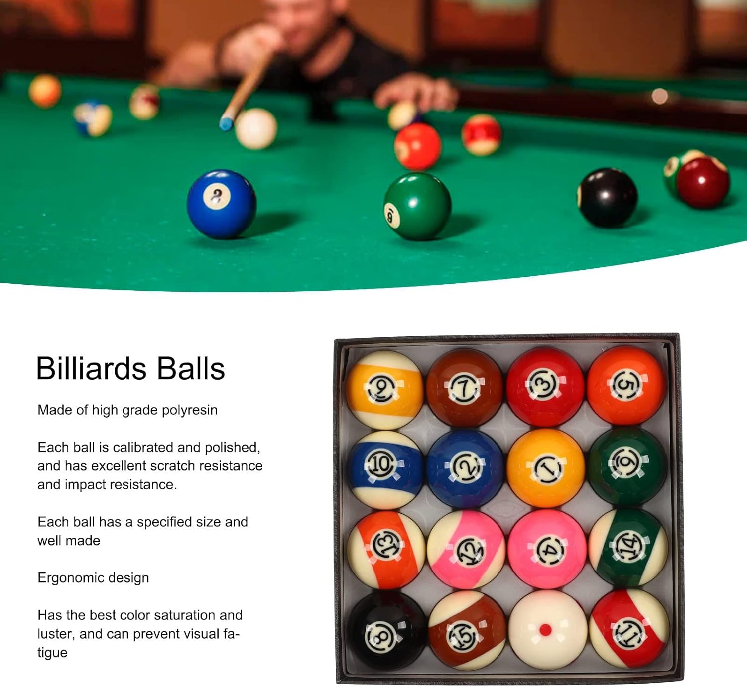 【Materiale in resina】 - Prova un tocco premium con le nostre palline da biliardo realizzate in poliresina. Ogni pallina è attentamente calibrata e lucidata, garantendo un'eccellente resistenza ai graffi e agli urti. La finitura squisita garantisce durata nel tempo, rendendo ogni gioco utile. 【Set completo】 - Con noi, ottieni più di quanto ti sei registrato. Il nostro set da biliardo per palline da biliardo è disponibile in un set completo di 16 palline, di cui 15 solide e una stecca. Un set da biliardo dal design classico, promette di migliorare la coerenza del gioco. 【Progettazione ergonomica】 - Le nostre bolas de billar adottano elementi essenziali di design ergonomico per il massimo comfort. Vanta la saturazione e la lucentezza del colore ideali, prevenendo l'affaticamento visivo durante le lunghe ore di gioco. 【Compatto e maneggevole】 - Mantieni il controllo del tuo gioco ovunque tu vada con le nostre palline da biliardo compatte. Di dimensioni adeguate per un facile trasporto e stoccaggio, le nostre palline offrono prestazioni superiori e sono progettate per la comodità. 【Conforme ai criteri】 - Rimanendo fedeli alla fonte, le nostre palle da biliardo hanno dimensioni designate con una maestria senza rivali. Abilmente realizzati, sostituiscono senza sforzo quelli vecchi garantendo una durata di vita prolungata.