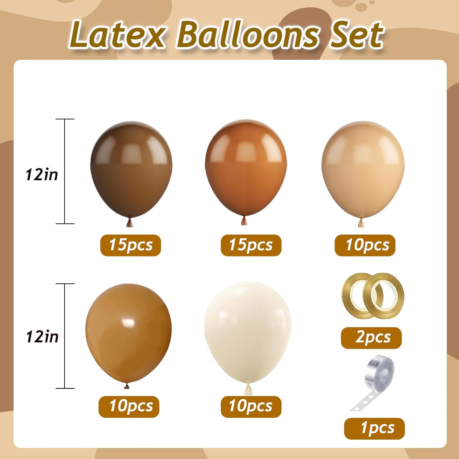 Palloncini beige marroni: riceverete 60 palloncini beige e marroni: 15 palloncini marroni, 15 palloncini marroni, 10 palloncini marroni, 10 palloncini marroni, 2 palloncini, 10 palloncini bianchi sabbia, 10 palloncini color albicocca, 2 nastri e 1 ghirlanda di palloncini. Può essere utilizzato su temi e feste, decorazioni di compleanno, decorazioni per feste. razioni, decorazioni per matrimoni e decorazioni per feste. Materiali eccellenti: i nostri palloncini beige marroni di alta qualità sono realizzati in lattice naturale atossico. Sono super elastici, durevoli, non si deformano, non si rompono o si leccano, sono riutilizzabili, luminosi e colorati, leggeri e portatili. Puoi gonfiare la decorazione con aria da solo o riempire con gas di elio al volume desiderato per arrondare con stile la tua festa. Vi auguriamo una grande festa! Palloncini beige marroni: questi palloncini possono essere riempiti con aria, elio o idrogeno. Puoi legare questi bellissimi palloncini ovunque tu voglia decorare. La sua lucentezza dorata cromata conferisce alla vostra festa – all'aperto o in spazi chiusi – un'atmosfera elegante e romantica e crea così un'atmosfera festosa. 【Multiuso】: puoi usare questi 60 palloncini per creare ghirlande e dare libero sfogo alla tua creatività. Sono adatti per la decorazione di qualsiasi luogo e possono essere facilmente organizzati in una stanza, soggiorno, parco o giardino. Adatto per compleanni, matrimoni, San Valentino, anniversari, baby shower, Capodanno e Natale. Avvertenze di sicurezza: questo prodotto viene utilizzato principalmente per la decorazione di case o eventi e viene acquistato e arredato da adulti, non come oggetto da gioco per bambini. Se avete domande sull'uso, vi preghiamo di contattarci.