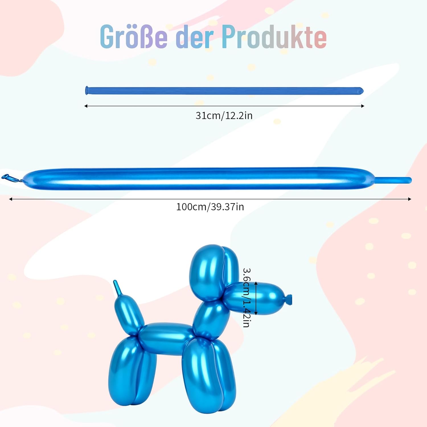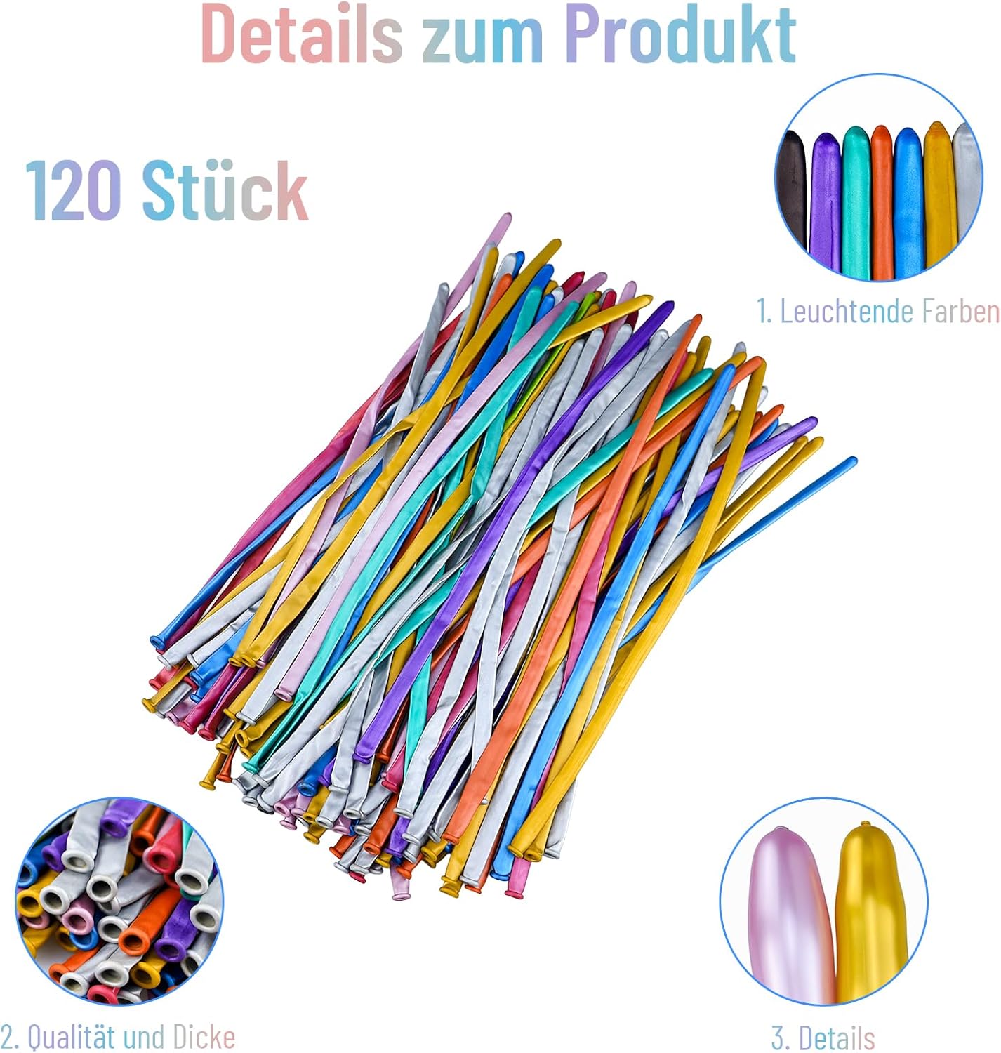 Materiale di alta qualità: questo palloncino lungo colorato è realizzato esclusivamente in lattice naturale di alta qualità, atossico e biodegradabile al 100%. Si forma facilmente e non si gonfia troppo spesso. Sicuro, ecologico, inodore, robusto, durevole e molto flessibile. La superficie del palloncino è ricoperta con una piccola quantità di borotalco per evitare che i palloncini si attacchino. Non macchia. Nota: evitare la luce solare diretta, il surriscaldamento, oggetti appuntiti e attriti eccessivi. Facile da usare: con una pompa ad aria i palloncini metallici colorati possono essere gonfiati rapidamente e facilmente. Risparmia tempo e fatica. Nota: per evitare che i palloncini scoppino, non gonfiarli troppo (massimo 80% della quantità di riempimento). Promuove la creatività dei bambini: i nostri palloncini colorati si allungano bene. Puoi gonfiare facilmente i palloncini lunghi senza gonfiarti troppo, quindi piegarli facilmente in diverse forme, B. Per cani con palloncini, farfalle, a forma di cuore, cani di piccola taglia o fiori. Ampie applicazioni: questi palloncini lunghi sono versatili e perfetti per feste, compleanni, matrimoni, vacanze, anniversari, lauree, addii al nubilato, decorazioni di carnevale e altre occasioni. Contenuto della confezione: riceverete 120 palloncini lunghi in diversi colori. La quantità e la selezione del colore sono sufficienti per soddisfare le tue esigenze, quindi non devi preoccuparti.