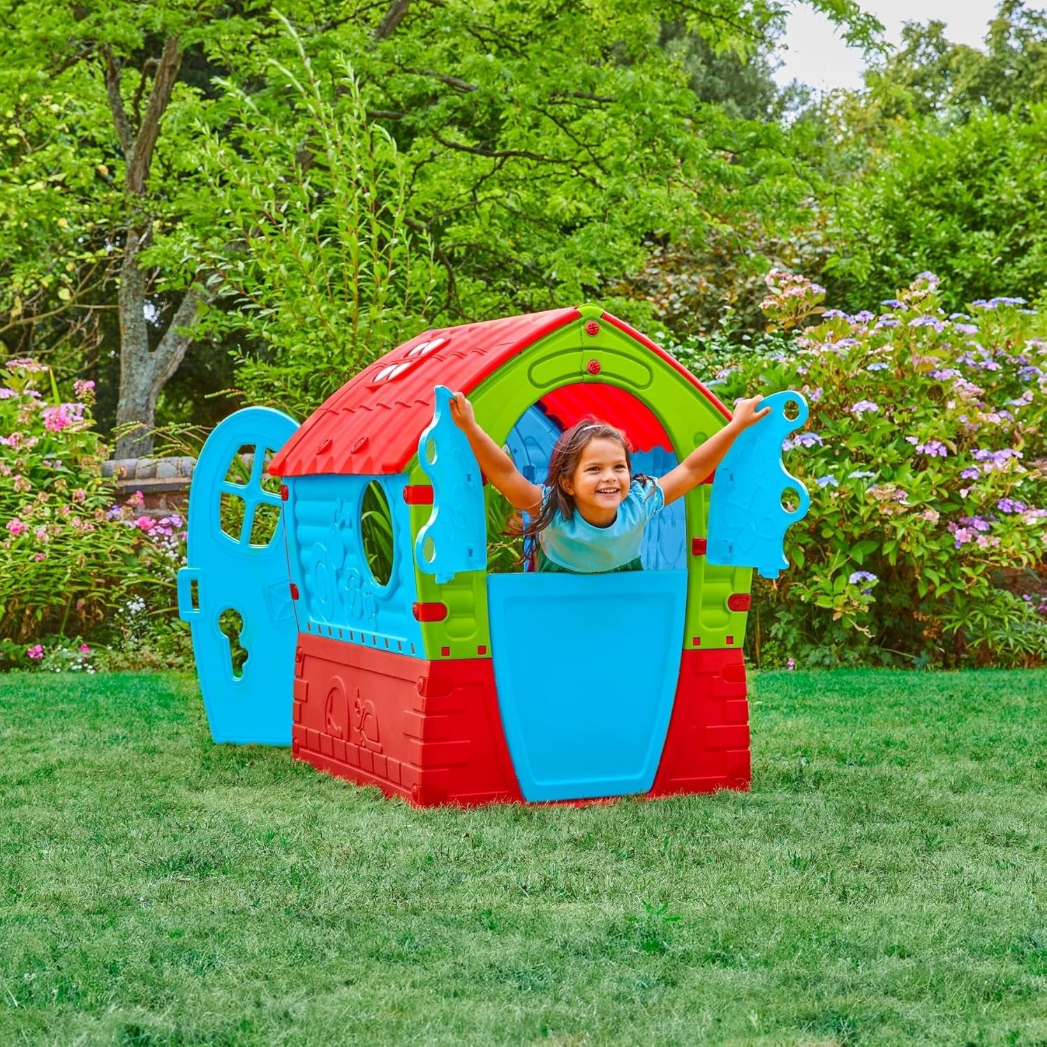 Realizzato con materie prime durevoli e di alta qualità resistenti ai raggi UV Presenta un tettuccio apribile per far entrare la luce naturale, finestrini posteriori che si aprono e chiudono facilmente e spioncini su entrambi i lati per consentire ai bambini curiosi di guardare dentro La porta facile da aprire e chiudere è dotata di una serratura magica attraverso la quale i più piccoli possono sbirciare