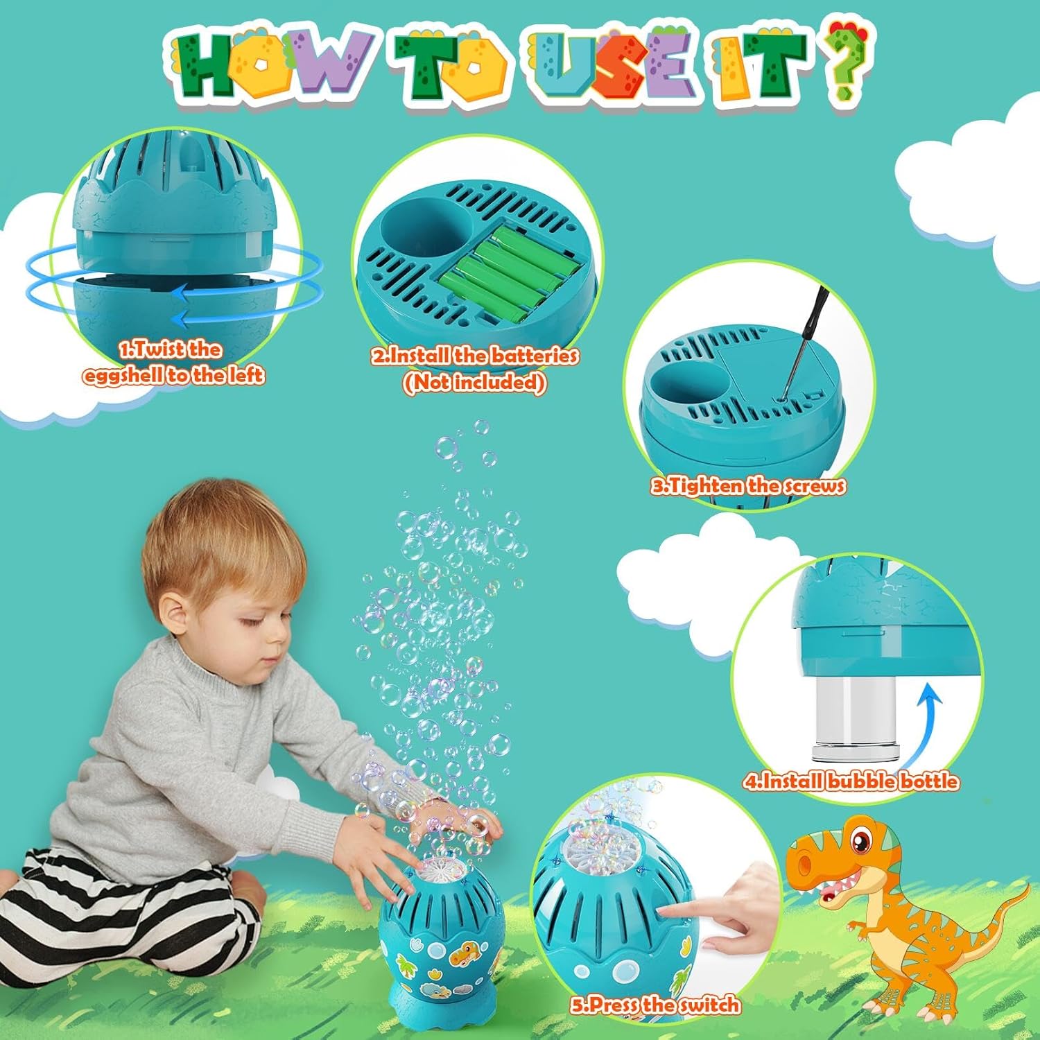 - 🦖 Look uova di dinosauro: il nostro design è ispirato alle uova di dinosauro. Quando decine di migliaia di bolle esplodono dalle magiche uova di dinosauro, per i tuoi bambini viene creato un mondo di bolle pieno di divertimento e fantasia, regalando loro sorprese ed emozioni senza precedenti. - 🦖Funzionamento con un solo pulsante: basta premere l'interruttore per avviare un flusso continuo di bolle. Anche i bambini piccoli possono usarlo senza problemi. - 🦖Bubble Ocean: con 13 fori per bolle e un potente motore, la macchina per bolle può sparare continuamente più di 10.000 bolle al minuto. Può aggiungere un'atmosfera bella e allegra a qualsiasi celebrazione, comprese feste di compleanno, matrimoni, giardino/patio/spiaggia/giochi in piscina/campeggio ecc. - 🦖Decorazione di Pasqua: una macchina per bolle a forma di uovo di dinosauro è perfetta per la caccia alle uova di Pasqua e un'ottima decorazione per i cestini pasquali. Porta divertimento e sorpresa in più ed è il compagno ideale per la caccia alle uova di Pasqua dei bambini! - 🦖Scelta del regalo perfetto: cerchi un regalo unico e divertente per i bambini? Non cercare oltre! La nostra macchina per le bolle è l'opzione ideale perché nessun bambino può resistere a un uovo di dinosauro che gorgoglia. Che bel regalo! - 🦖Set macchina per fare le bolle: puoi ottenere una macchina per fare le bolle per uova di dinosauro, una bottiglia di acqua per fare bolle e adesivi di dinosauro fai-da-te. Se acquisti adesso, riceverai anche un porta-guscio d'uovo per bambini!