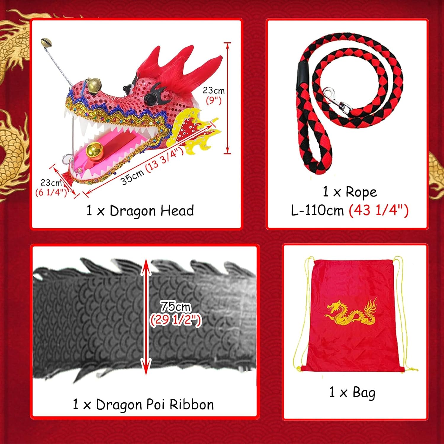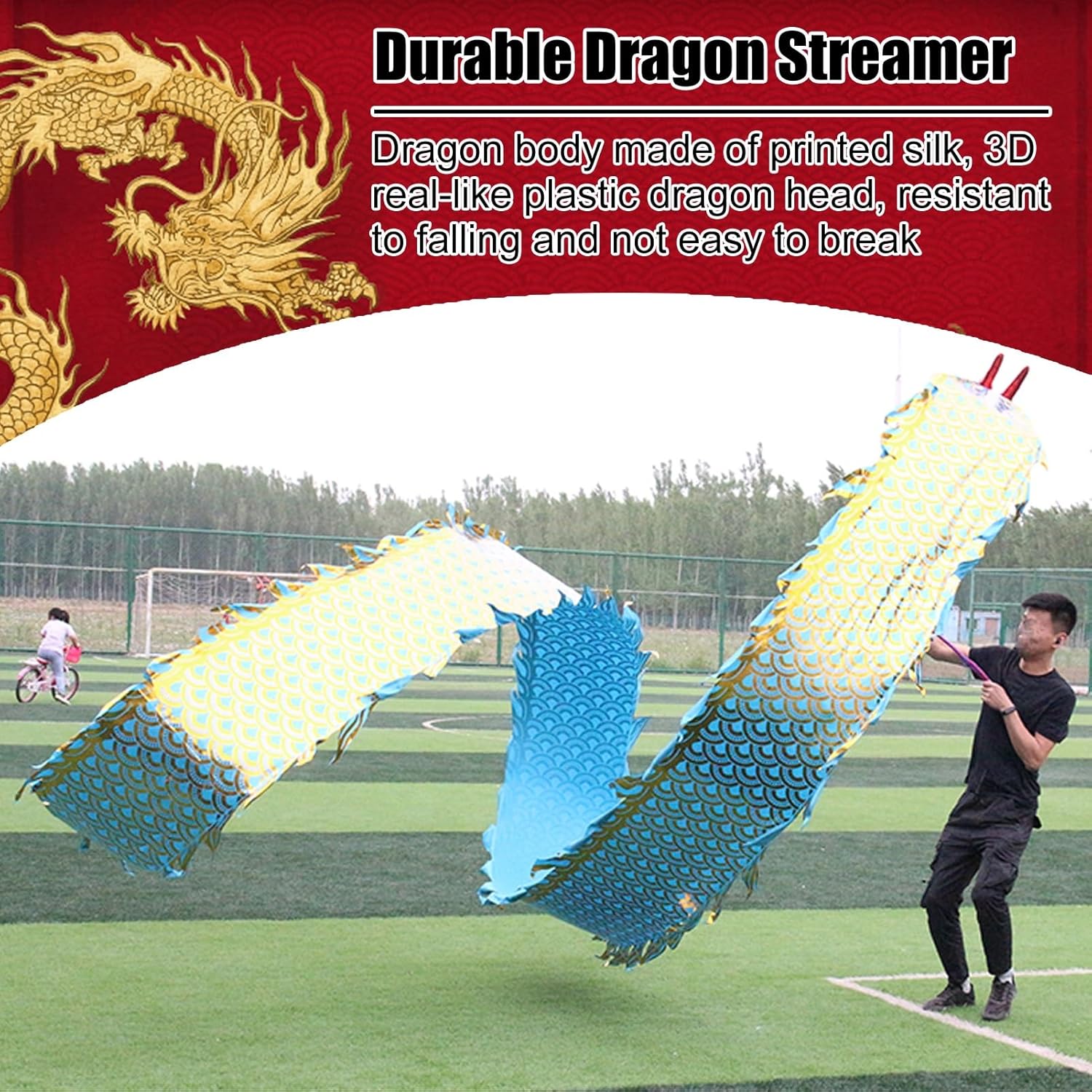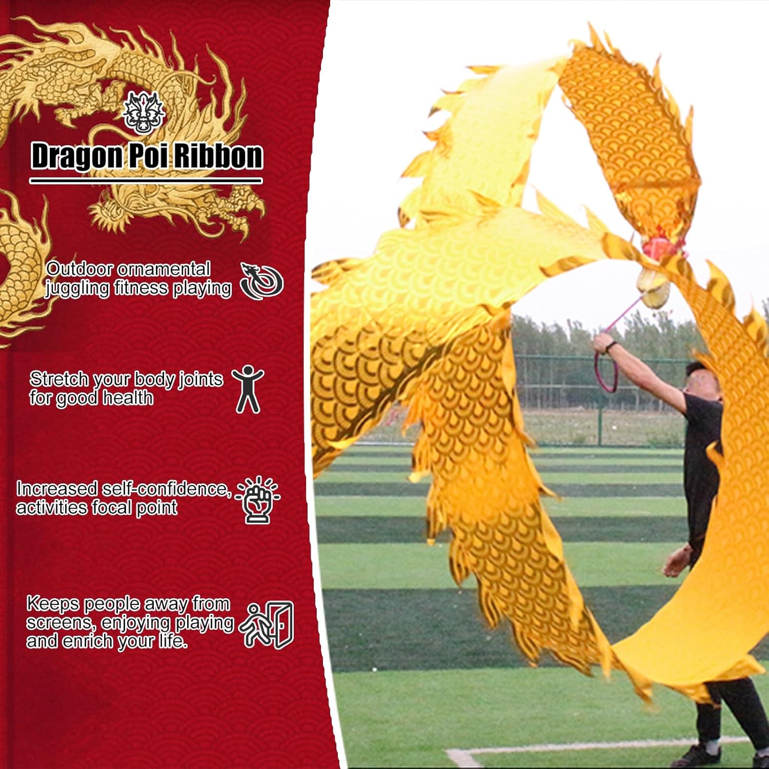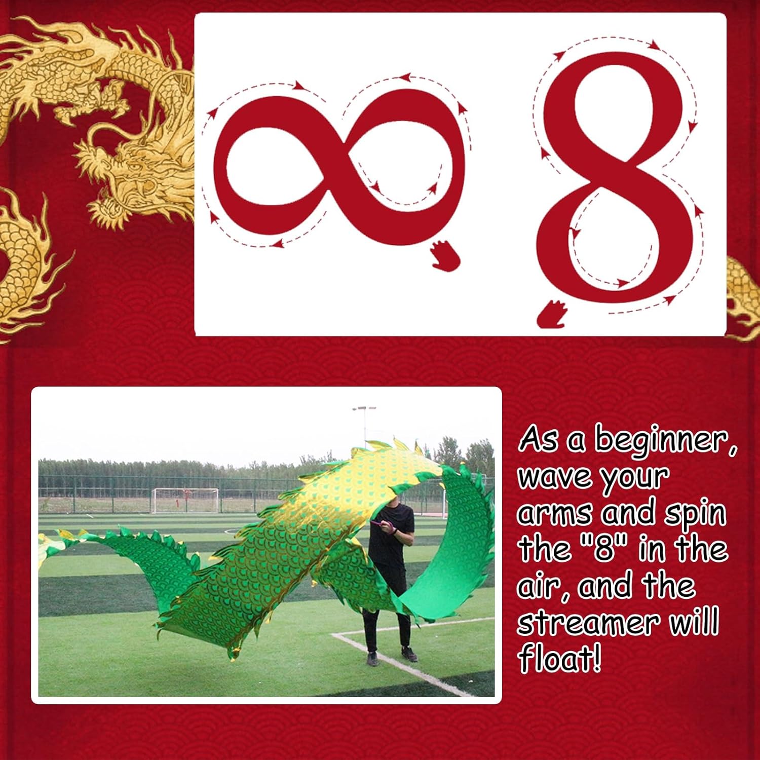 ☑️【Dragon Poi Band Dance】La danza del drago è un intrattenimento tradizionale cinese, le stelle filanti fluenti sono molto decorative. Può portare molto divertimento alla tua famiglia. Tiene le persone lontane dagli schermi, rende il gioco divertente e arricchisce la tua vita. ☑️【Drago Streamer Colorato e Resistente】Corpo del drago realizzato in tessuto goffrato, non consigliato per il lavaggio, testa di drago 3D in vera plastica, anticaduta e non facile da rompere, robusta corda lunga e zaino portatile. ☑️【Danzatrice di nastri per fitness all'aperto】Far oscillare i nastri della danza del drago può allungare il tuo corpo. Allena le spalle, il collo e la colonna lombare, migliora la mobilità articolare e allevia lo stress e l'ansia. ☑️ 【Regalo creativo e artistico】 I nastri da danza del drago sono il regalo perfetto per bambini, adolescenti, adulti e anziani che amano i draghi cinesi! Puoi fare esercizi di fitness, ballare, fare giochi di destrezza ed esibirti in spettacoli di talento in cortili, parchi, spiagge e altre vaste aree. ☑️ 【Facile da montare e utilizzare】 Collega la corda alla testa del drago, quindi unisci insieme la testa del drago e la fascia del drago e infine stringi la corda attorno al drago. Come principiante, muovi le braccia e ruota l'"8" in aria e lo streamer galleggerà!