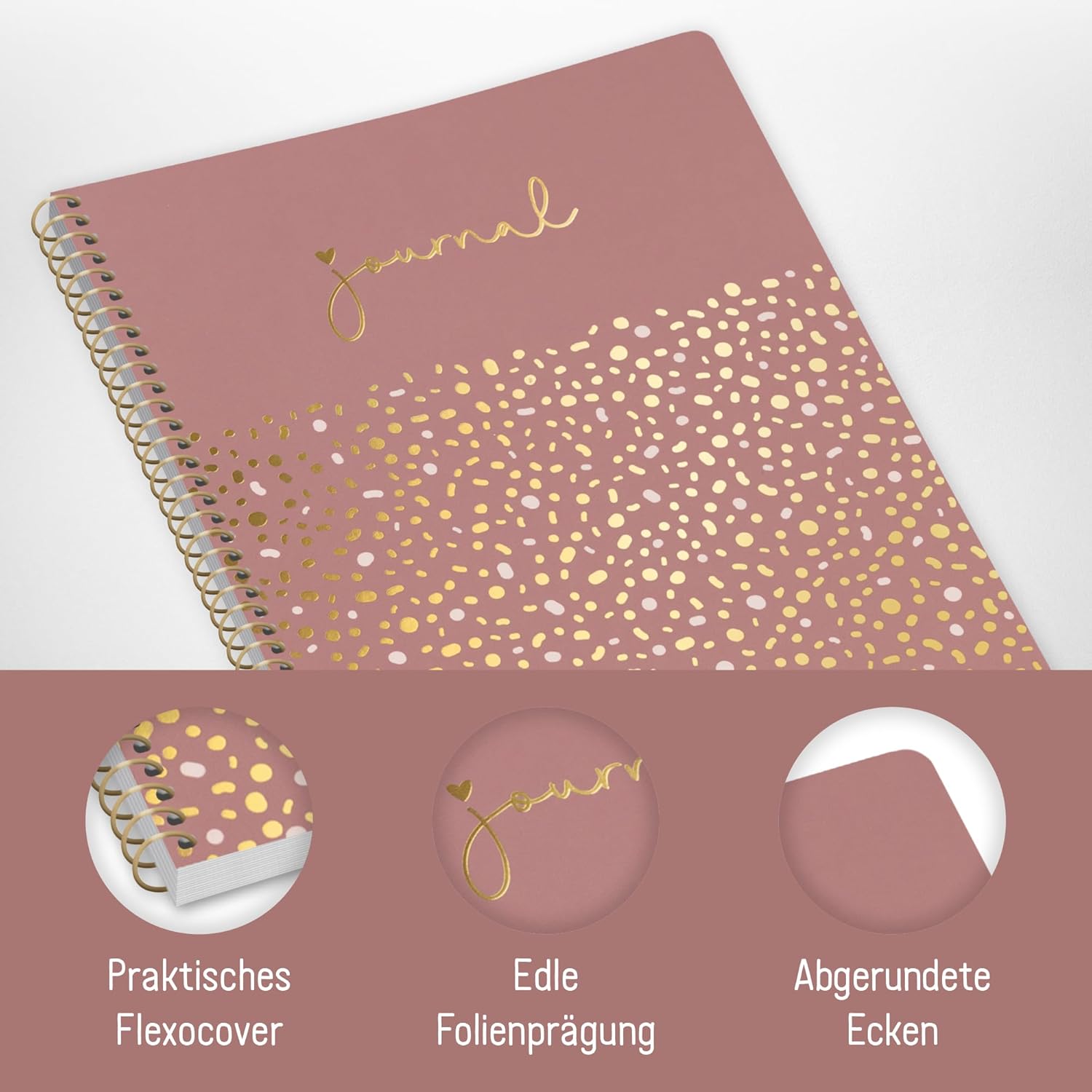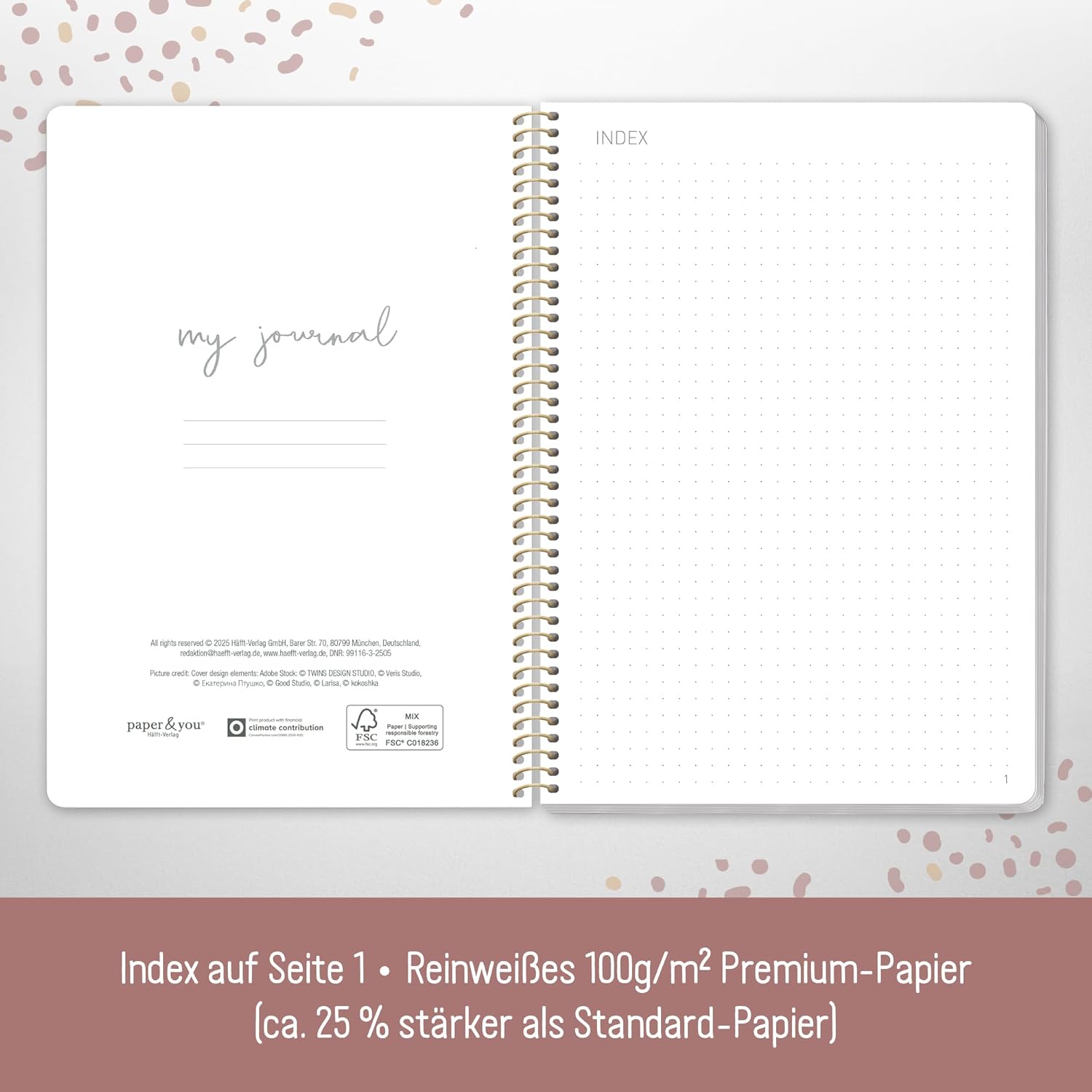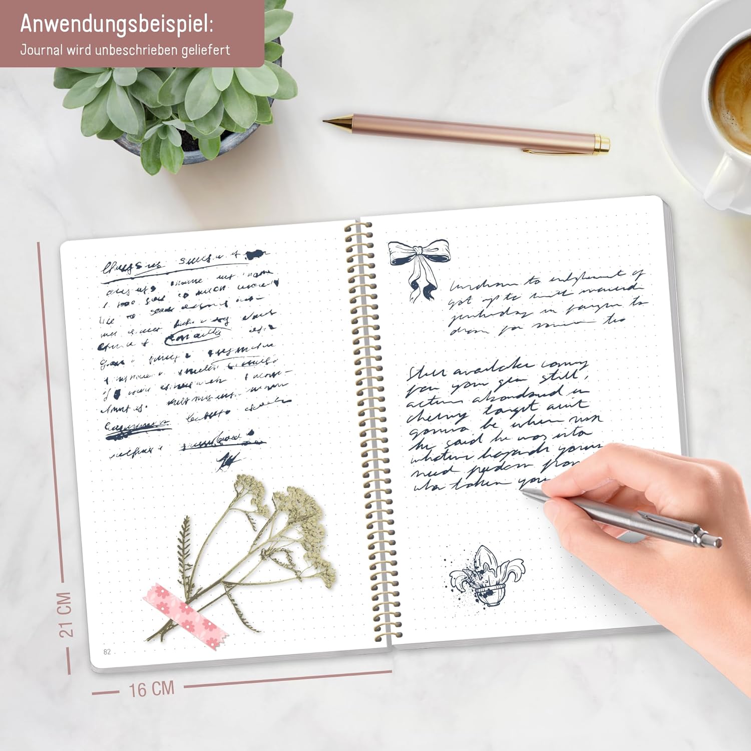 IL TUO NUOVO DIARIO A5 A PUNTI - Dalla casa editrice Häfft-Verlag con attraente stampa a caldo, copertina morbida con nobile superficie opaca e rilegatura a spirale: per bullet journaling, scritte a mano, schizzi, agende, pensieri, obiettivi o semplicemente i tuoi appunti quotidiani :-) POSIZIONAMENTO PERFETTO GRAZIE ALLA SPIRALE - La pratica rilegatura a spirale consente di aprire il taccuino a 360°. Aperto o piegato, rimane piatto e offre quindi una piacevole esperienza di scrittura in tutte le posizioni. FAI UN REGALO A TE STESSO E AI GLI ALTRI - Ideale per i principianti o come regalo carino - mettiamo volentieri da parte il nostro smartphone per tirare fuori le nostre matite per questo diario chic! La carta da 100 g/m² è adatta a molti tipi di penne. TANTI MODELLI DIVERSI - ce n'è per tutti i gusti e bello da collezionare: diario con 160 pagine numerate / 80 fogli nel pratico formato A5 (16 x 21,1 cm), distanza tra i punti: 0,5 cm SOSTENIBILE E RISPETTOSO DEL CLIMA - Sii creativo quanto vuoi pur avendo la coscienza a posto: per amore dell'ambiente, la nostra carta premium da 100 g/m² è certificata FSC (FSC N004440) e stampato in modo rispettoso del clima.