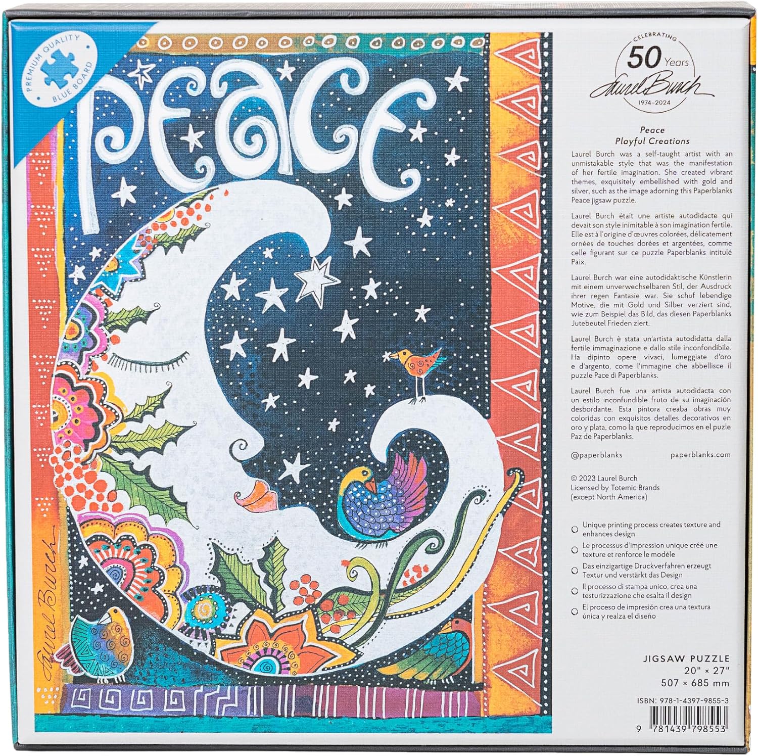 Size: Width: 507mm (20") x Height: 685mm (27")Interior: 1000 pieceColour: Multi-colourPremium quality blue board (specially formulated cardboard)1000 jigsaw piecesComplex imageryDecorative printed and textured paper (similar to our hardcover journals) Laurel Burch was a self-taught artist who relied on her intuition and passion to create vibrant and moving themes with paint and paper. Her goal was to create artworks (such as the one reproduced here) that were reminders of our personal, spiritual inner worlds.