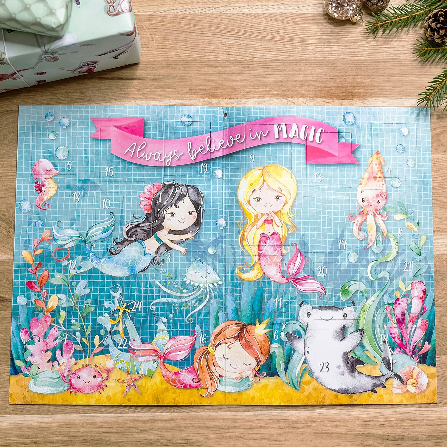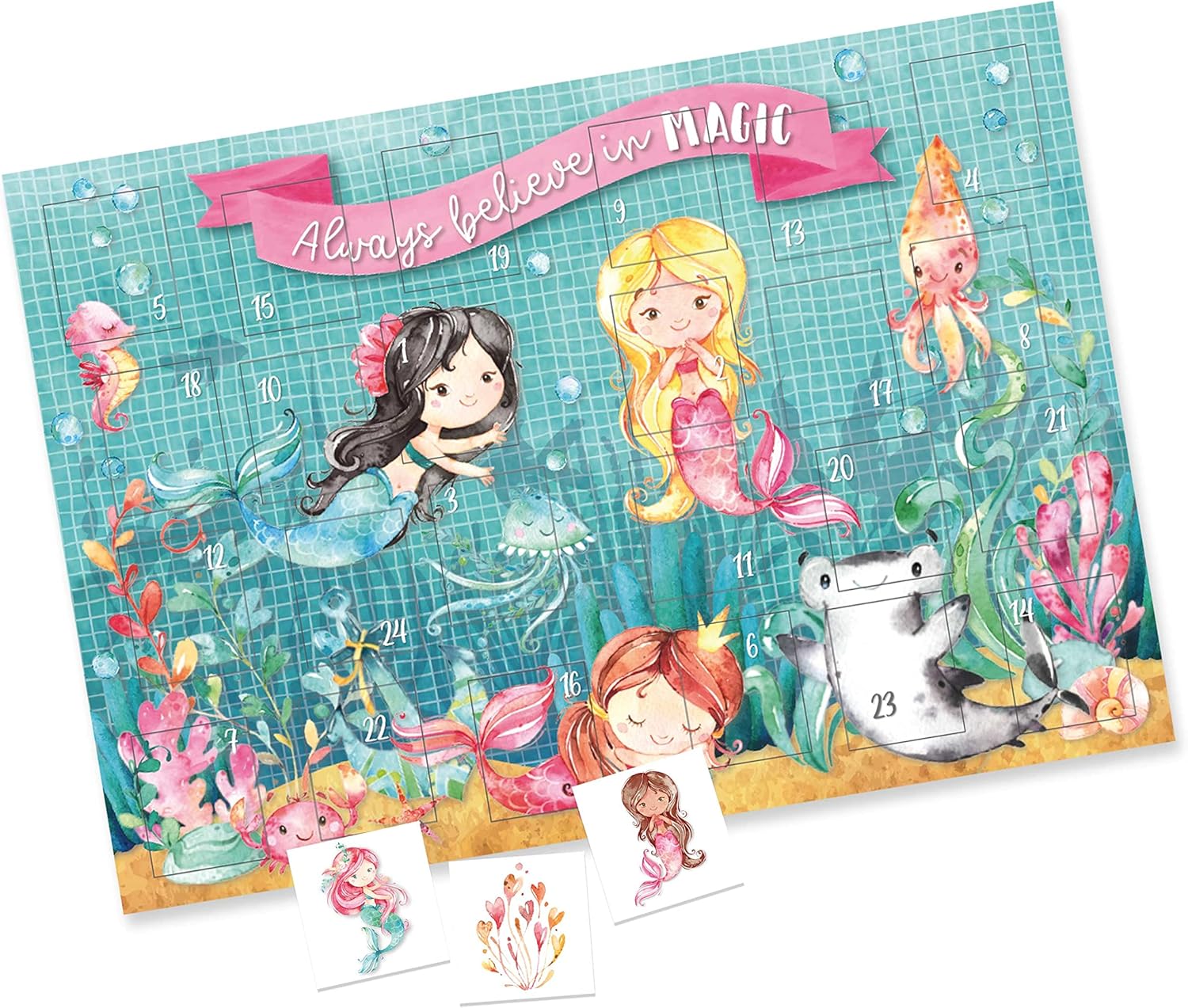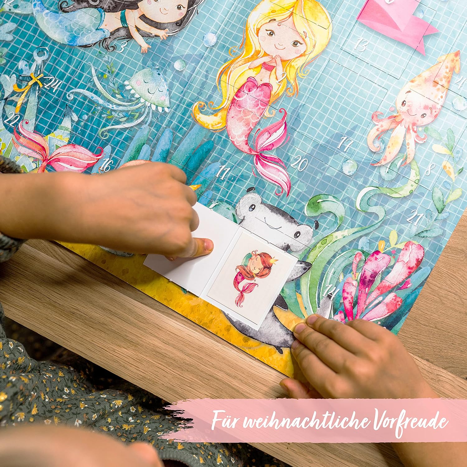 SICURO E AFFIDABILE: tutti i tatuaggi temporanei presenti in questo calendario dell'Avvento sono completamente atossici e assolutamente sicuri per i bambini. Diamo la massima importanza alla qualità dei nostri materiali - prodotto e stampato garantito in Germania - Dermatest: ottimo 24 PORTE - Dietro ogni porta c'è un adorabile tatuaggio - motivo sirena LUNGA DURATA E RESISTENZA ALL'ACQUA: Applicare i tatuaggi è un gioco da ragazzi - basta rimuovere la pellicola protettiva, posizionare il disegno nella posizione desiderata e premere delicatamente la carta protettiva per 30 secondi con un panno umido. La durata è quindi di 6 giorni al massimo, a seconda della frequenza con cui il tatuaggio viene lavato con acqua e sapone. Per rimuoverlo completamente, consigliamo l'olio per bambini. PIÙ SCELTA: Nel nostro negozio troverai sicuramente il calendario dell'Avvento perfetto. Offriamo anche borse in tessuto, calendari da parete, calendari per tatuaggi, calendari con cartoline per i tuoi amici e kit fai-da-te completi: renne, gufi e molto altro! Dai un'occhiata allo store MADE IN GERMANY: Questo articolo è prodotto in Germania con l'aiuto di un laboratorio per disabili. I materiali selezionati e di alta qualità garantiscono ancora più divertimento nel fare un regalo.