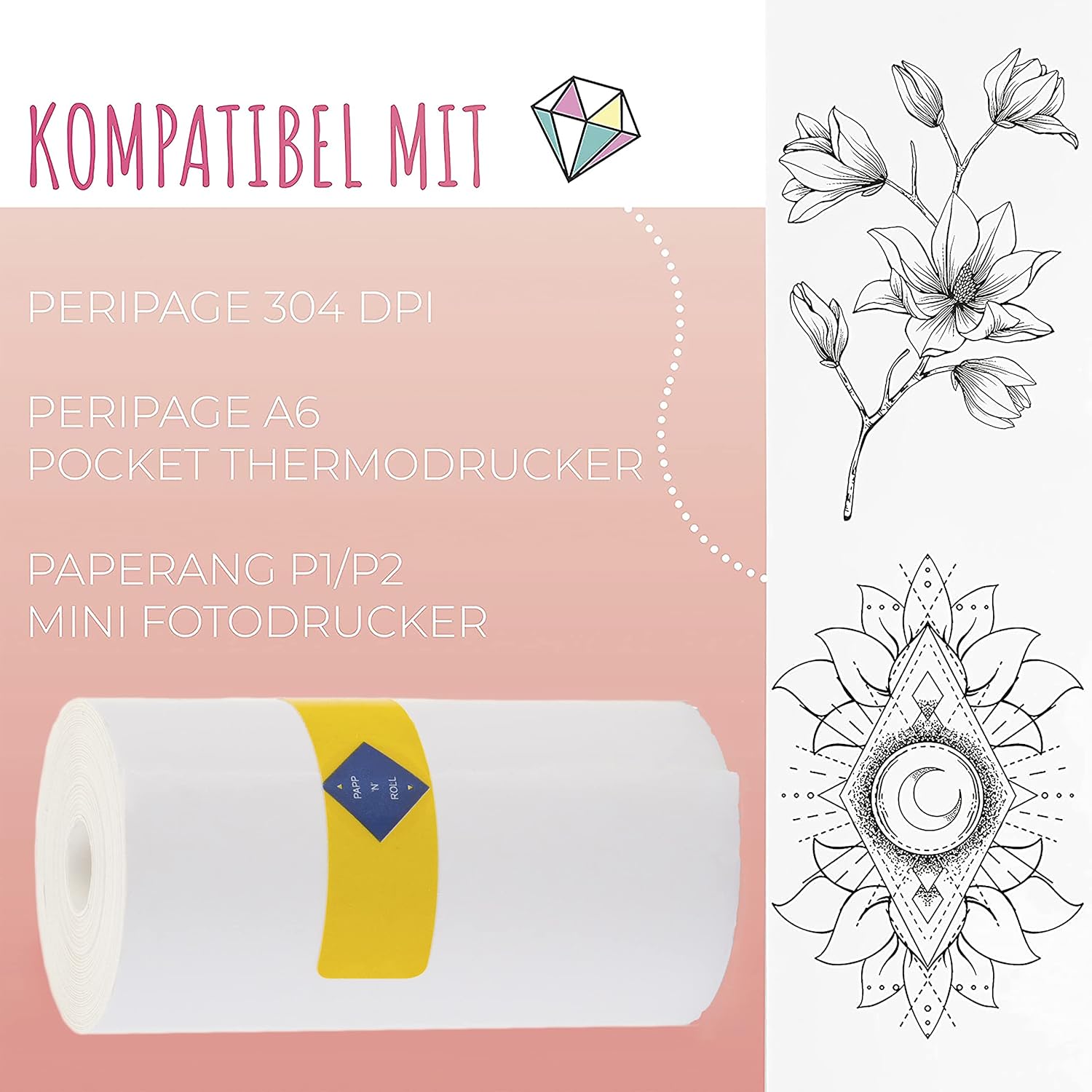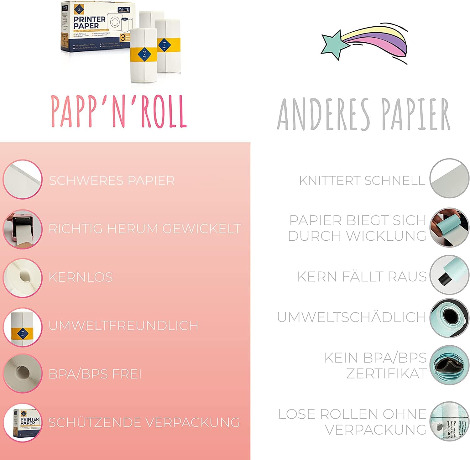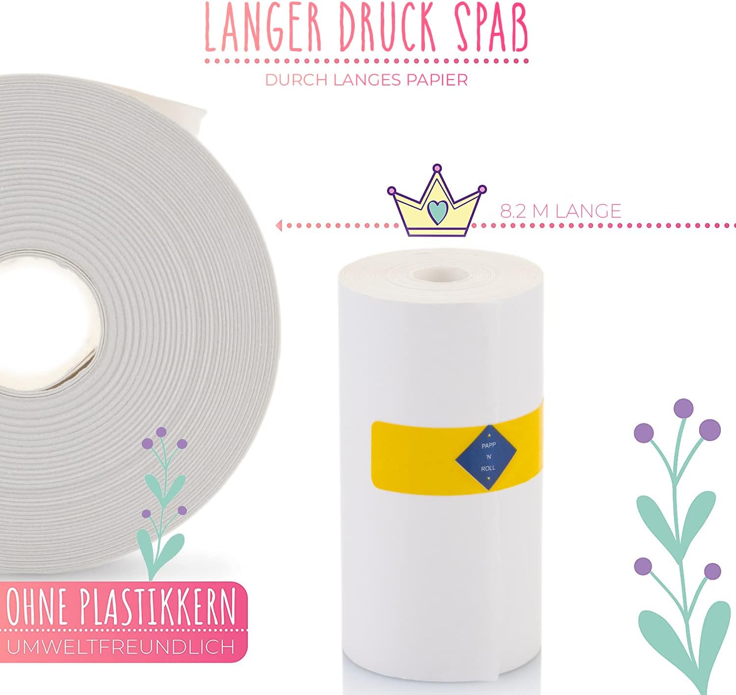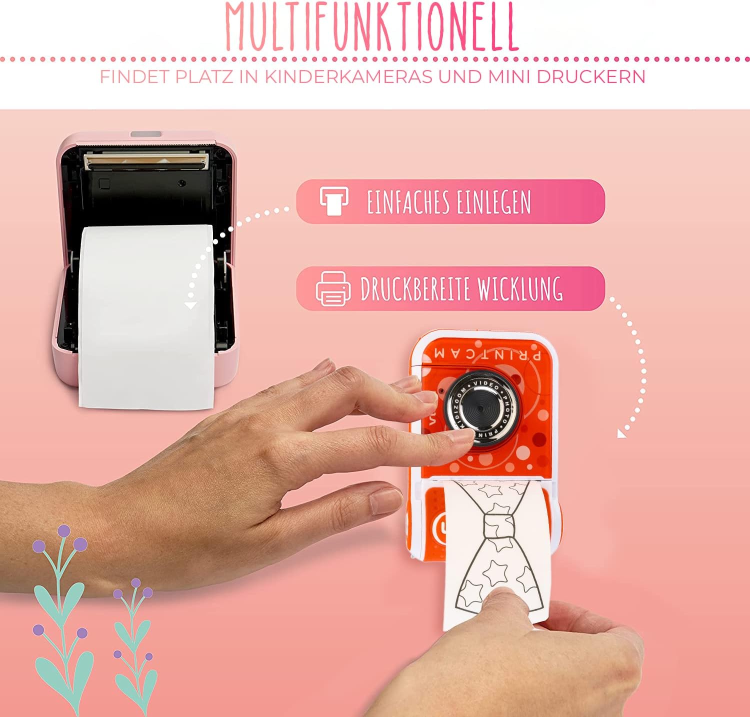 Imballaggio corretto come hanno previsto i produttori di stampanti Ecologico grazie all'assenza di un nucleo in plastica nel mezzo. Non può più rompersi o cadere. Compatibile con tutte le fotocamere per bambini come KidiZoom o Minibear Compatibile con tutte le stampanti termiche che consentono carta da 57 x 30 mm come Peripage A6 o 304 DPI o Paperang P1/P2 Senza BPA/BPS