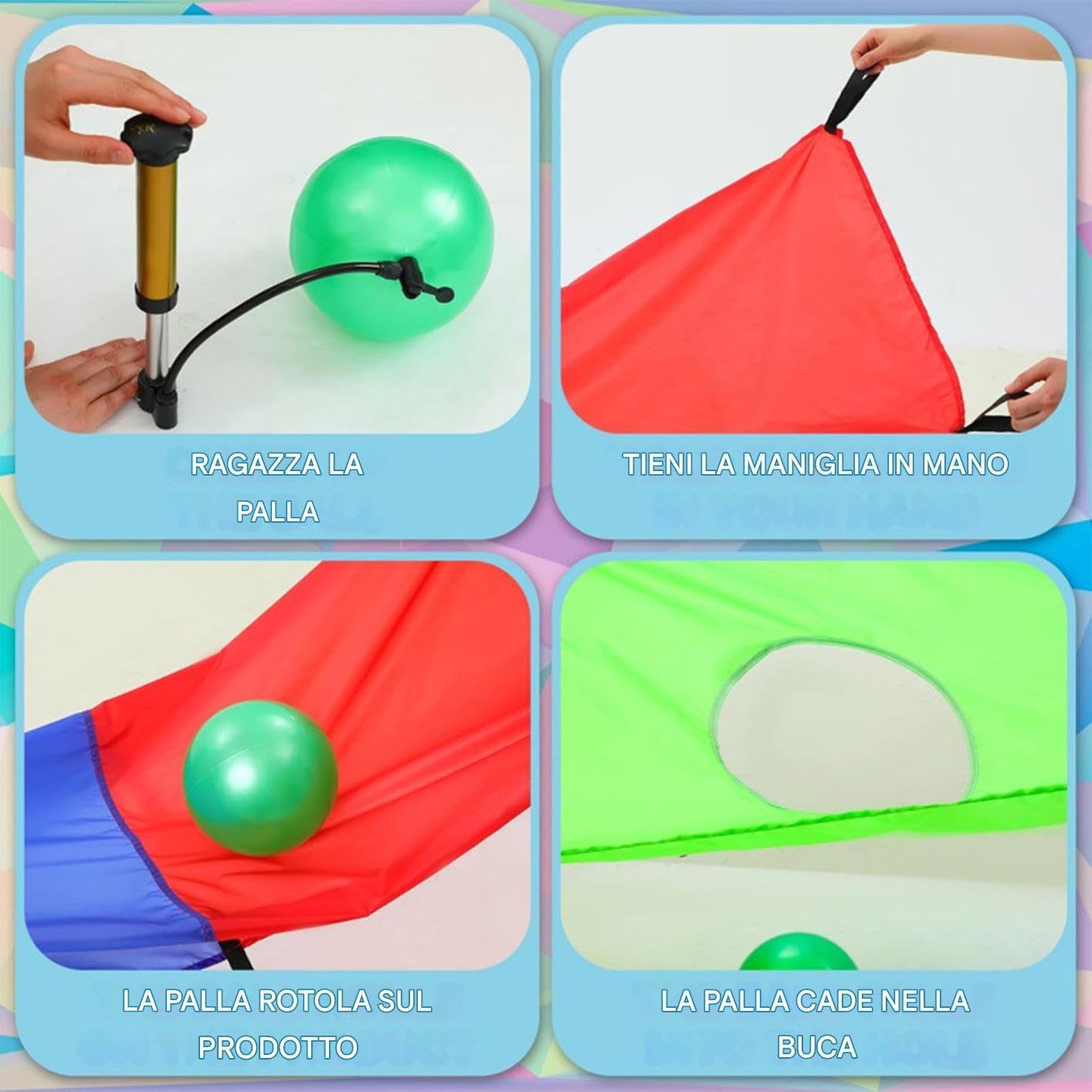Attrezzatura Gioco Esterni Affidabile: Grazie a manici e fibre antistrappo, il paracadute utilizza tessuto Oxford ad alta densità con design impermeabile per resistere costantemente a usi ripetuti e condizioni di gioco outdoor impegnative. Design Colorato: Tema brillante abbinato a 16 maniglie supporta la concentrazione e accende la creatività, offrendo divertimento versatile grazie all'esclusiva struttura a doppio foro per attività ricreative. Adatto all'Esterno: Progettato per uso esterno durante attività scolastiche ed eventi sportivi, questo paracadute per bambini incoraggia interazioni attive divertenti, rafndo le capacità di lavoro di tra bambini e famiglie Abilità Motorie Avanzate:Aumenta la della parte superiore del corpo, allena la velocità di reazione integrando azioni di passaggio della palla nelle attività con il paracadute. Sviluppa abilità di pensiero strategico tramite interazioni di gruppo collaborative e coinvolgenti. Sviluppo interattivo: Attraverso movimenti dinamici di lancio e passaggio, questo paracadute verde intensifica l'interazione tra più partecipanti, incoraggiando dinamiche di lavoro di per un divertimento collaborativo durante attività ricreative collettive