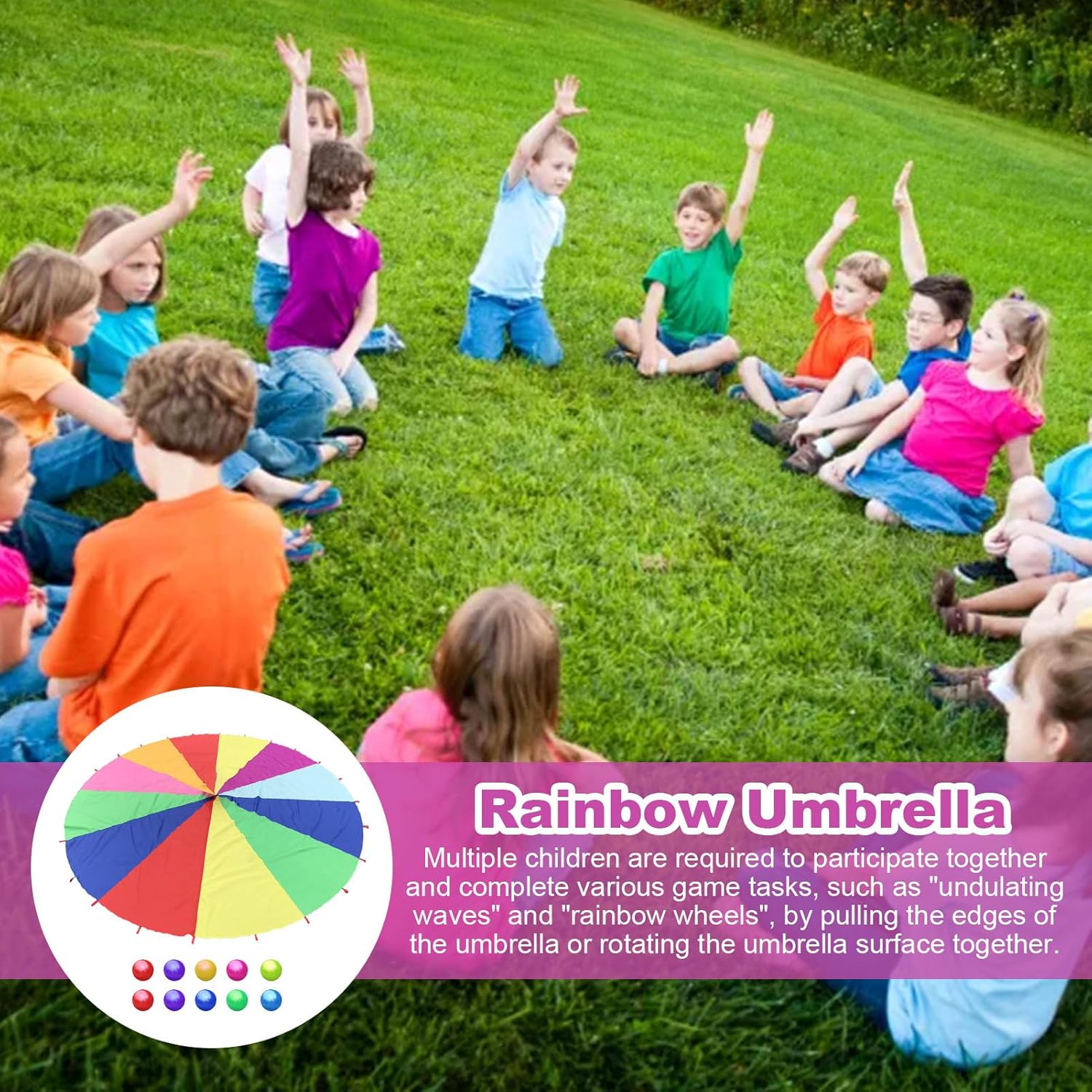 Design multicolore: prova una gioia infinita con il nostro paracadute da , progettato nei vivaci colori ' per formare una gigantesca cupola colorata per il interattivo. Stimolatore dello spirito del lavoro di : il paracadute per bambini incoraggia i bambini a comunicare e collaborare, completare insieme le attività di e costruire un senso di . Promuove il lavoro di attraverso attività divertenti ed emozionanti. Sviluppo della coordinazione fisica: promuovi lo sviluppo fisico e la coordinazione di figlio con il nostro paracadute per bambini. Il giocattolo per migliorare l'equilibrio, la coordinazione corporea e la consapevolezza spaziale stimolando i sensi e incoraggiando il attivo. Materiale sicuro: questo paracadute per bambini è realizzato in materiale morbido ad alta resistenza, garantendo sicurezza e protezione ottimali durante il . La speciale lavorazione dei bordi previene abrasioni o tagli e garantisce un divertimento senza preoccupazioni. Ampia gamma di usi: si trasforma perfettamente da strumento didattico vibrante ed educativo in una tenda protettiva, garantendo un uso multifunzionale e un maggiore divertimento.