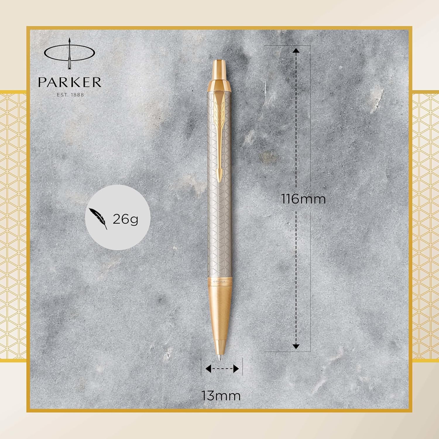 Design affermati, lucidi ed eleganti si fondono alle moderne forme affusolate Corpo in alluminio opaco sabbiato dalla lucentezza argentata, inciso con intricati motivi moderni, arricchito da dettagli in oro e dall'iconica clip a freccia di PARKER La punta a clic e l'affidabile inchiostro Quinkflow garantiscono tratti fluidi e costanti ovunque tu scriva Forme ergonomiche e confortevoli si associano all'eccellente qualità artigiana di PARKER per evocare la rinomata tradizione del marchio Questa penna stilografica, un regalo sofisticato e al tempo stesso accessibile, si presenta in una confezione regalo PARKER