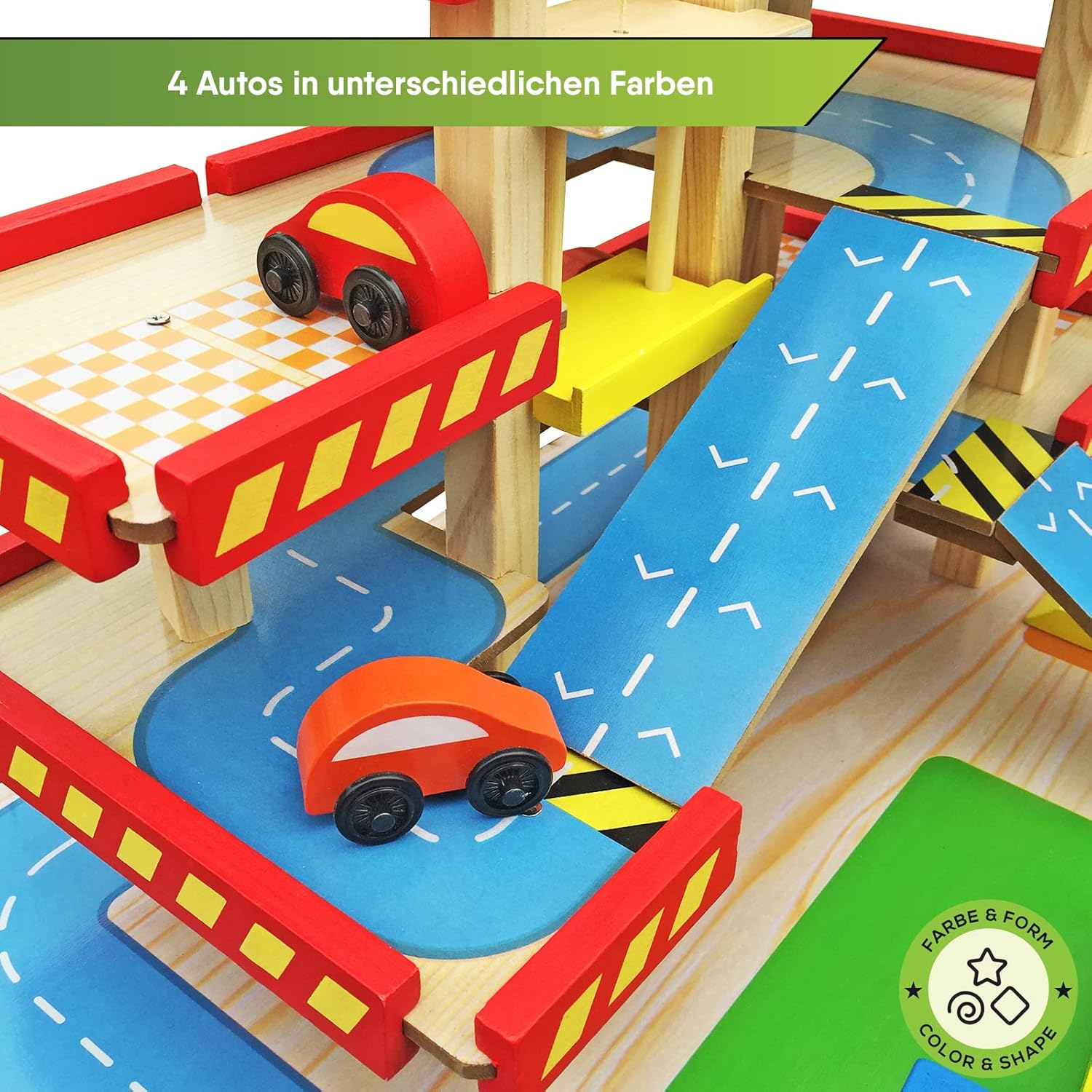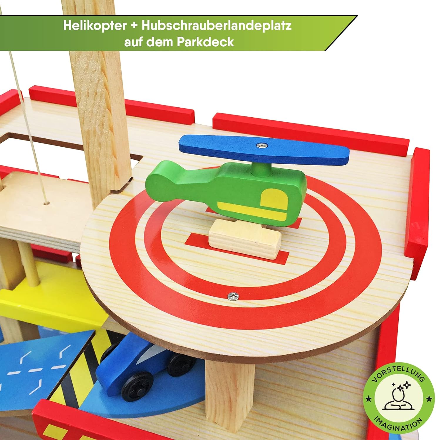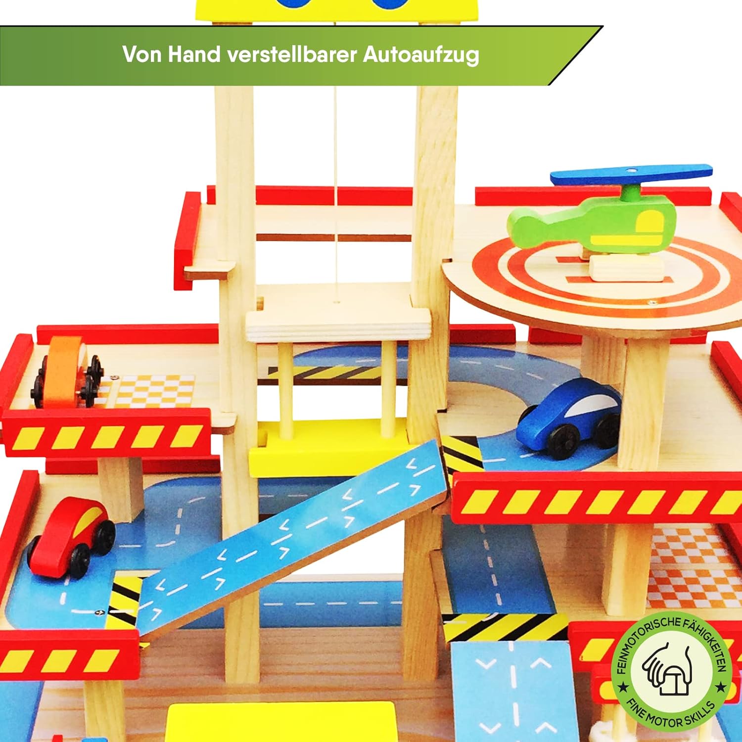 Divertimento puro: il parcheggio multipiano BALINCO offre un gioco versatile su 3 piani. Dalla biglietteria con barriera di parcheggio regolabile alla piattaforma di atterraggio per elicotteri sul ponte di parcheggio. Attiva i sensi e stimola la curiosità: I piani del parcheggio sono collegati da rampe, ma se le cose devono essere più veloci, le auto possono anche essere trasportate rapidamente a ogni piano grazie all'ascensore regolabile manualmente. Promuove creatività e responsabilità: le auto devono essere rifornite di carburante prima o poi e hanno bisogno di un autolavaggio ogni tanto. Non può quindi mancare una stazione di servizio e un autolavaggio integrato con spazzole orizzontali e verticali. Tutto incluso nel set: Sono incluse 4 macchinine di colori diversi e un coloratissimo elicottero con rotore mobile. Un'ottima idea regalo: regalate al vostro bambino un gioco educativo in legno di BALINCO.