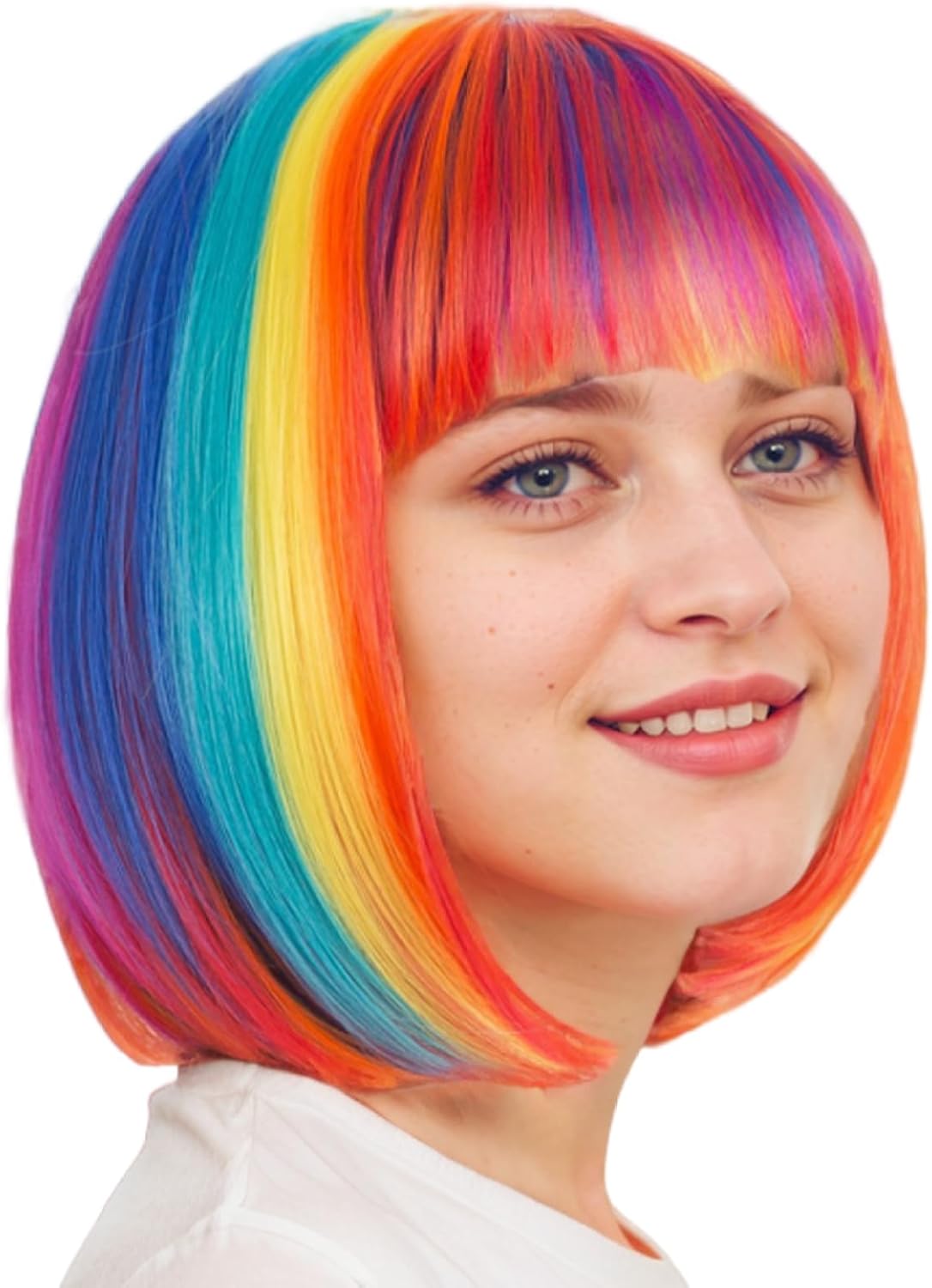 Conforzo e traspirante: a base di fibre chimiche, questa parrucca colorata è traspirante e leggero, rendendo comodo da indossare per periodi prolungati senza causare disagio o irritazione. Parrucca di rainbow parrucca colorata Short ed elegante con la frangia: la lunghezza di 12 pollici offre un aspetto chic e moderno che è facile da mantenere, mentre i colpi aggiungono un tocco giocoso al tuo stile, perfetto per una dichiarazione di moda audace..Parrucche colorate parrucche colorate Vibranti colori arcobaleno: questa parrucca arcobaleno presenta un sorprendente mix di tonalità arcobaleno, tra cui sfumature di rosso, blu, verde, giallo e viola, per creare un look divertente e accattivante che sicuramente gireranno la testa..Parrucche colorate parrucca colorata Adattamento regolabile: la parrucca arcobaleno è dotata di un cappuccio regolabile per garantire una vestibilità sicura e confortevole per la maggior parte delle dimensioni della testa, in modo da poterlo indossare facilmente senza preoccuparti di scivolare via..Parrucche colorate parrucche divertenti per la festa Perfetto per ogni occasione: sia che tu stia partecipando a una festa, celebrate un festival o che stai cercando un nuovo aspetto divertente, questa parrucca colorata è l'accessorio ideale per ogni occasione..Parrucche divertenti per parrucca per feste di festa