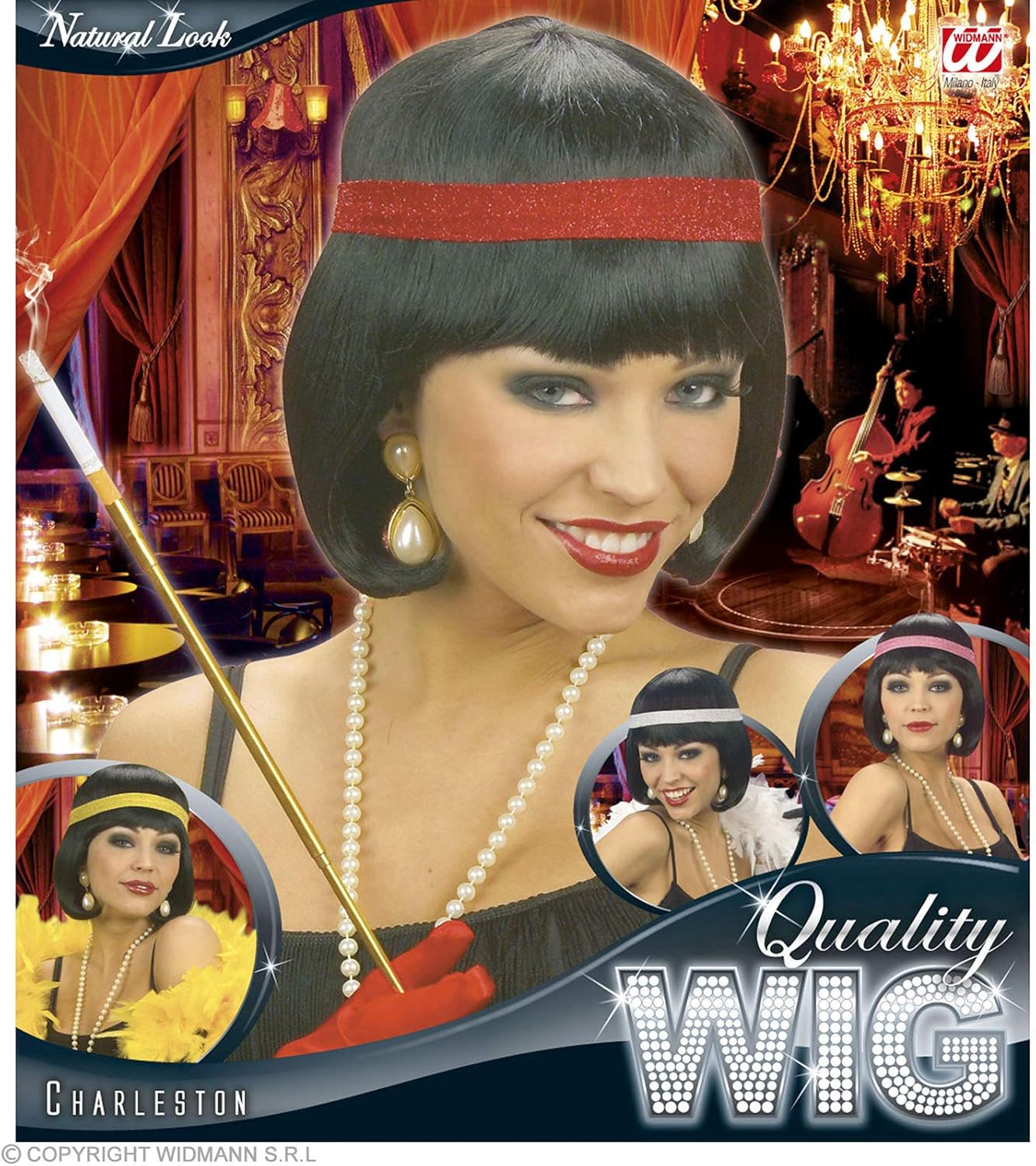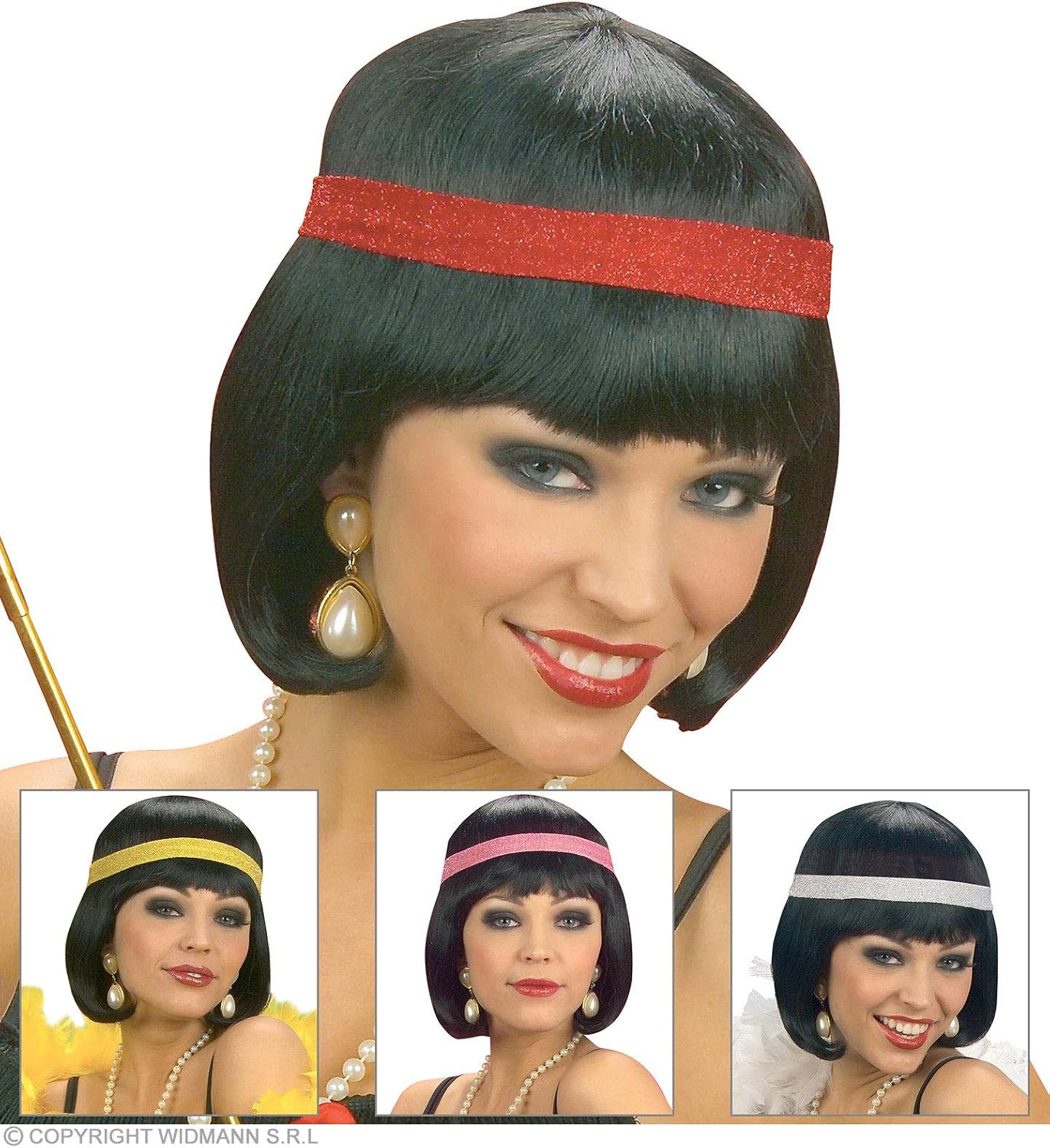 Capelli lisci, neri, a caschetto con una fascia. Protetto da rete da rimuovere prima dell'uso. Presentato in una scatola che consente la conservazione e il riutilizzo.