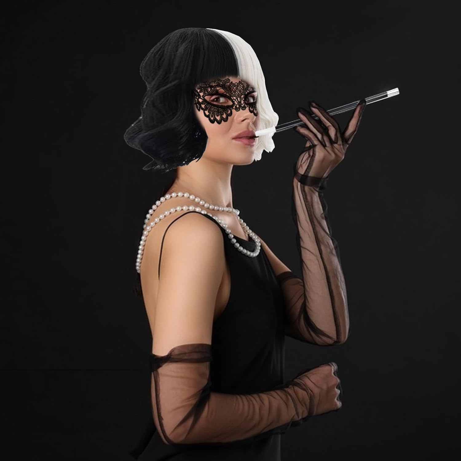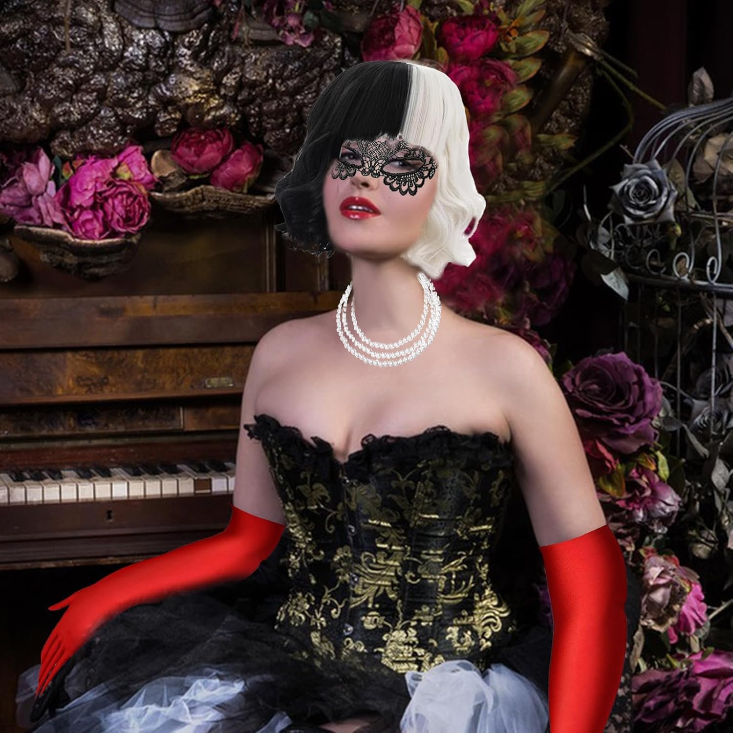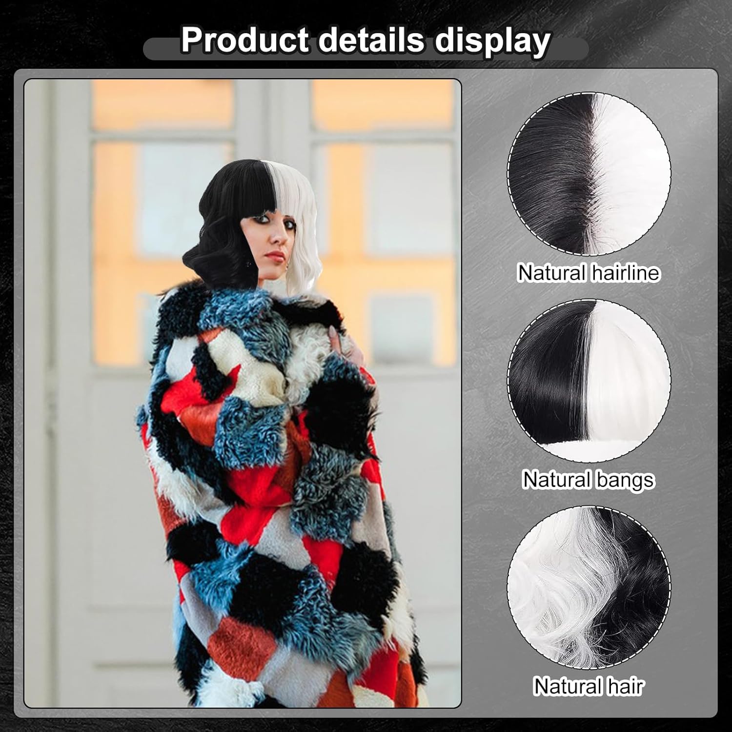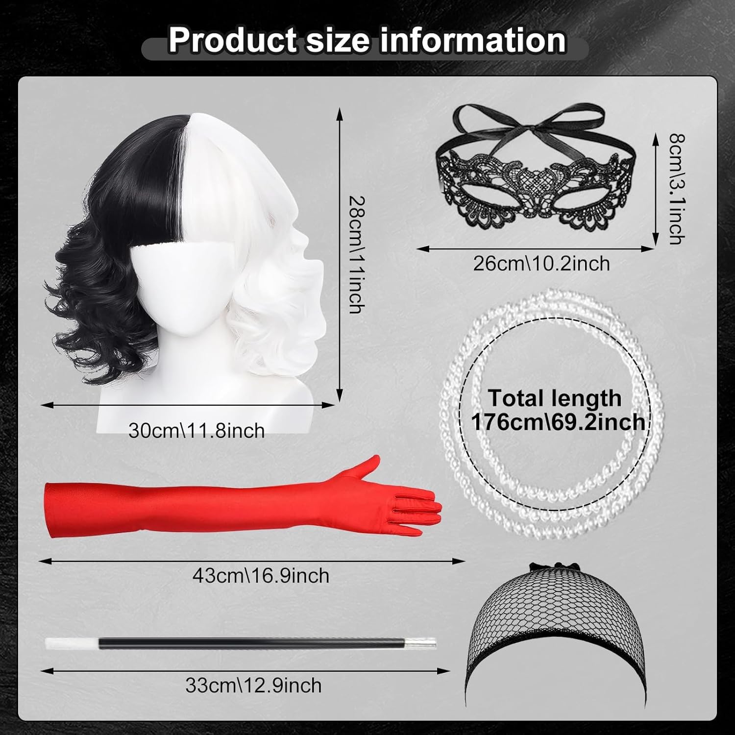 Parrucca corta in bianco e nero: la parrucca corta in bianco e nero contiene una parrucca bianca e nera, una collana di perle, una maschera in pizzo, una retina per capelli, guanti rossi e una bacchetta magica, quindi un totale di sei accessori. Questa variegata combinazione ti darà un aspetto unico e perfetto e ti consente di immergerti completamente nel ruolo che giochi. Morbida e soffice: la parrucca corta per carnevale è realizzata in seta sintetica resistente al calore ad alta temperatura con caratteristiche morbide e lisce. Grazie alla rete traspirante per capelli, è comodo da indossare e non si deforma facilmente. I ricci divisi al centro possono essere discretamente adattati alla forma del viso per ottenere un effetto naturale. È normale che una piccola quantità di peli fluenti si stacchi quando si indossa per la prima volta. Design regolabile: il design regolabile è adatto per teste e code di 40-55 cm. Può essere comodamente regolato in base alle esigenze individuali per facilitare il trasporto e non essere troppo stretto. Allo stesso tempo, si può ottenere un effetto liscio e solido, che offre un'esperienza di utilizzo più confortevole. 【 Ampia gamma di accessori: il set viene fornito con una varietà di accessori, come collana di perle, maschera per occhi in pizzo, rete per capelli, guanti rossi, bacchetta magica e così via. Questo accessorio ti offre un'esperienza unica e crea un effetto realistico e naturale che ti farà sembrare più sicuro e affascinante tra la folla o ad una festa. Misteriosa e glamour: il set di parrucche in bianco e nero con parrucca in bianco e nero, una maschera sexy in pizzo e una collana in pizzo ti daranno un tocco di mistero. Il design raffinato del vestito ti farà risaltare su balli in maschera ed eventi di carnevale e ti darà un'immagine glamour che ti farà risaltare in tutte le occasioni.