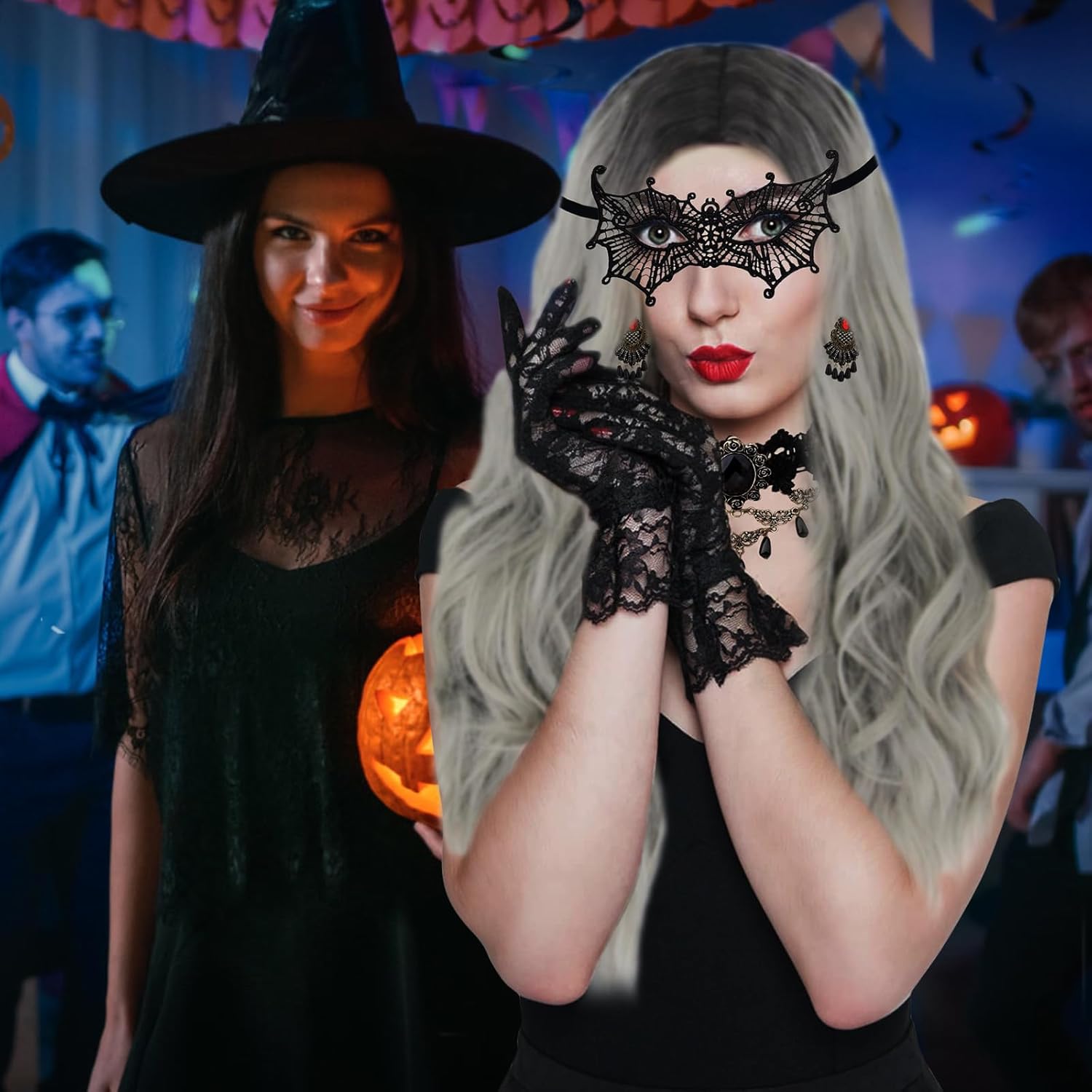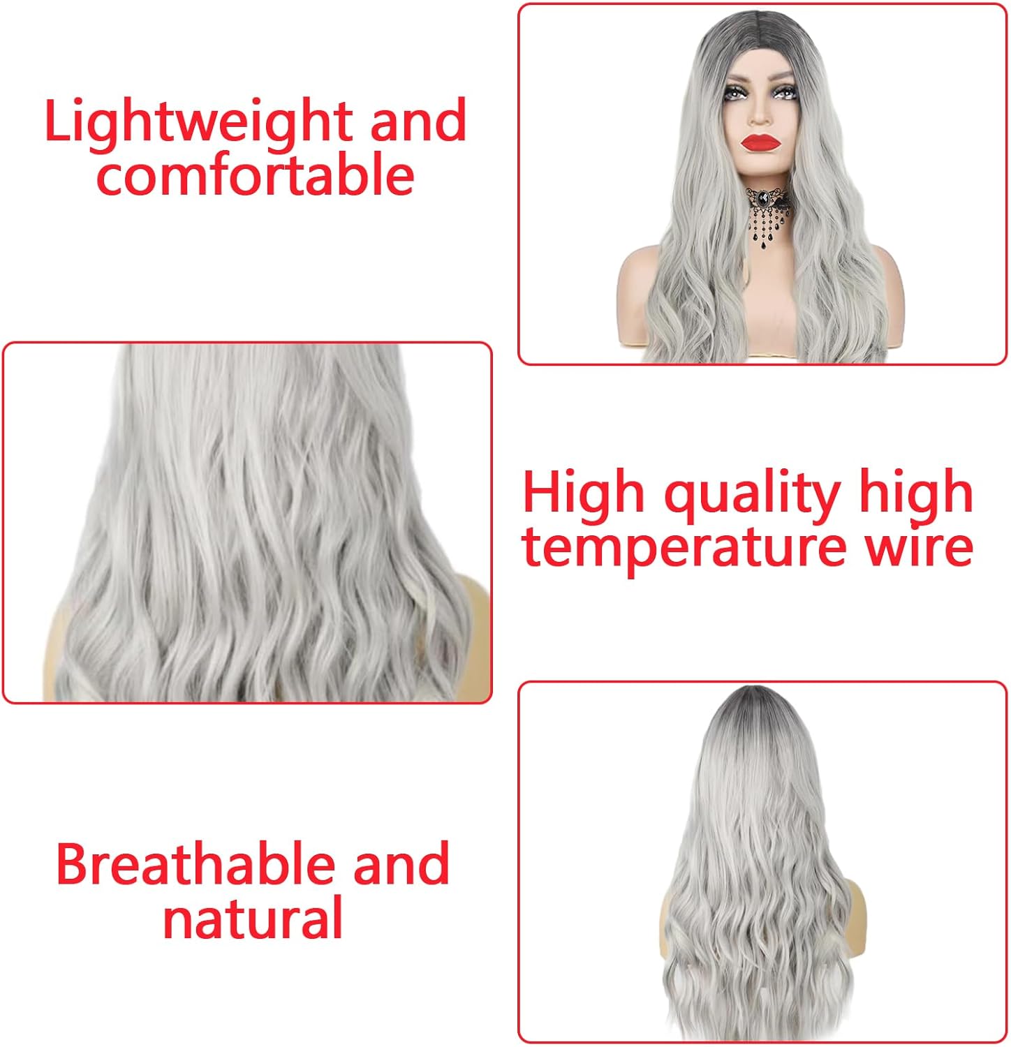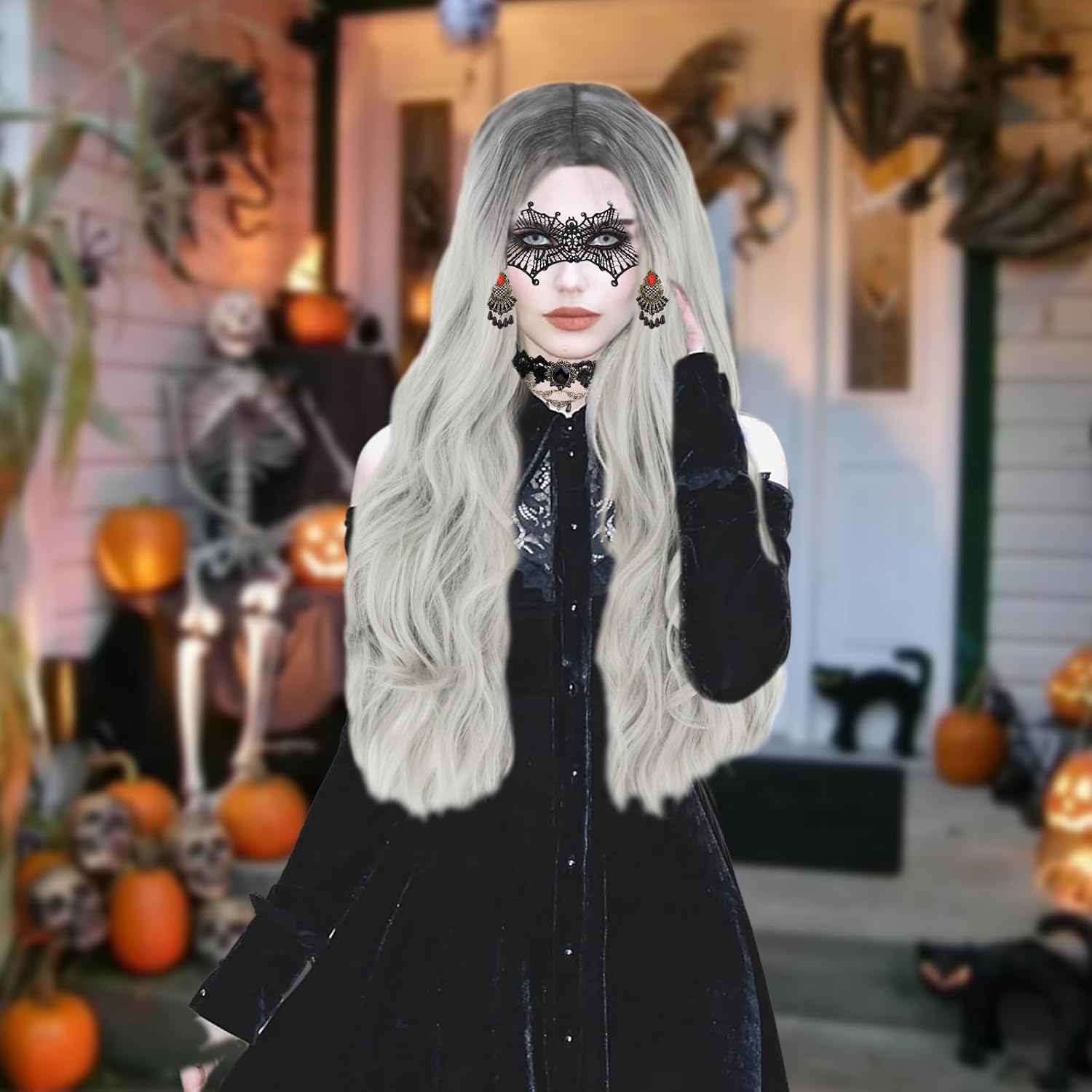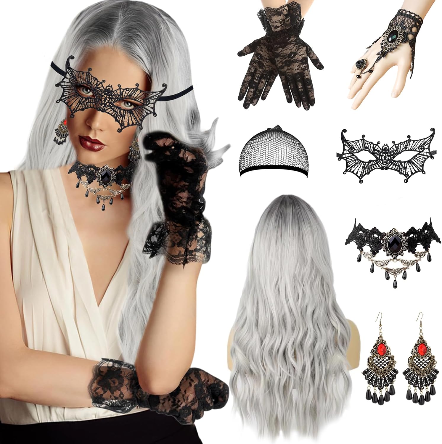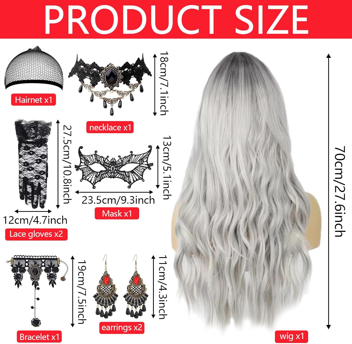 Set di parrucche: riceverete 1 parrucca da donna grigio argento da 70 cm, 1 rete per parrucca, 1 collana gotica, 1 bracciale, 1 paio di guanti in pizzo, 1 maschera per occhi in pizzo, accessori che si abbinano perfettamente al vostro costume di Halloween. La rete per parrucca garantisce una presa sicura e comfort. Materiali della parrucca: le nostre parrucche in argento sono realizzate in fibre sintetiche di alta qualità con una lunga parrucca da donna, per un aspetto realistico e un piacevole comfort. Filato a rete traspirante, misura della cuffia regolabile in base alla circonferenza della testa. Set di gioielli: set di parrucche da donna per Halloween, con pizzo nero e gioielli gotici, perfetti per Halloween, erba mardi, mascherata e molto altro ancora. Porta più segreto alla tua festa. Facile manutenzione: basta usare un pettine per lisciare la parrucca di Halloween dopo l'uso e appenderla, è anche possibile utilizzare lo shampoo per lavare la parrucca, proprio come si lavano i capelli, basta asciugare l'umidità sulla parrucca e appenderla in un luogo ventilato per asciugare naturalmente. Occasioni applicabili: la nostra parrucca per Halloween può essere indossata in ogni occasione, come feste di Halloween, eventi di carnevale, feste in costume, cosplay, eventi scolastici o altri eventi. Con questa parrucca sarete accattivanti.