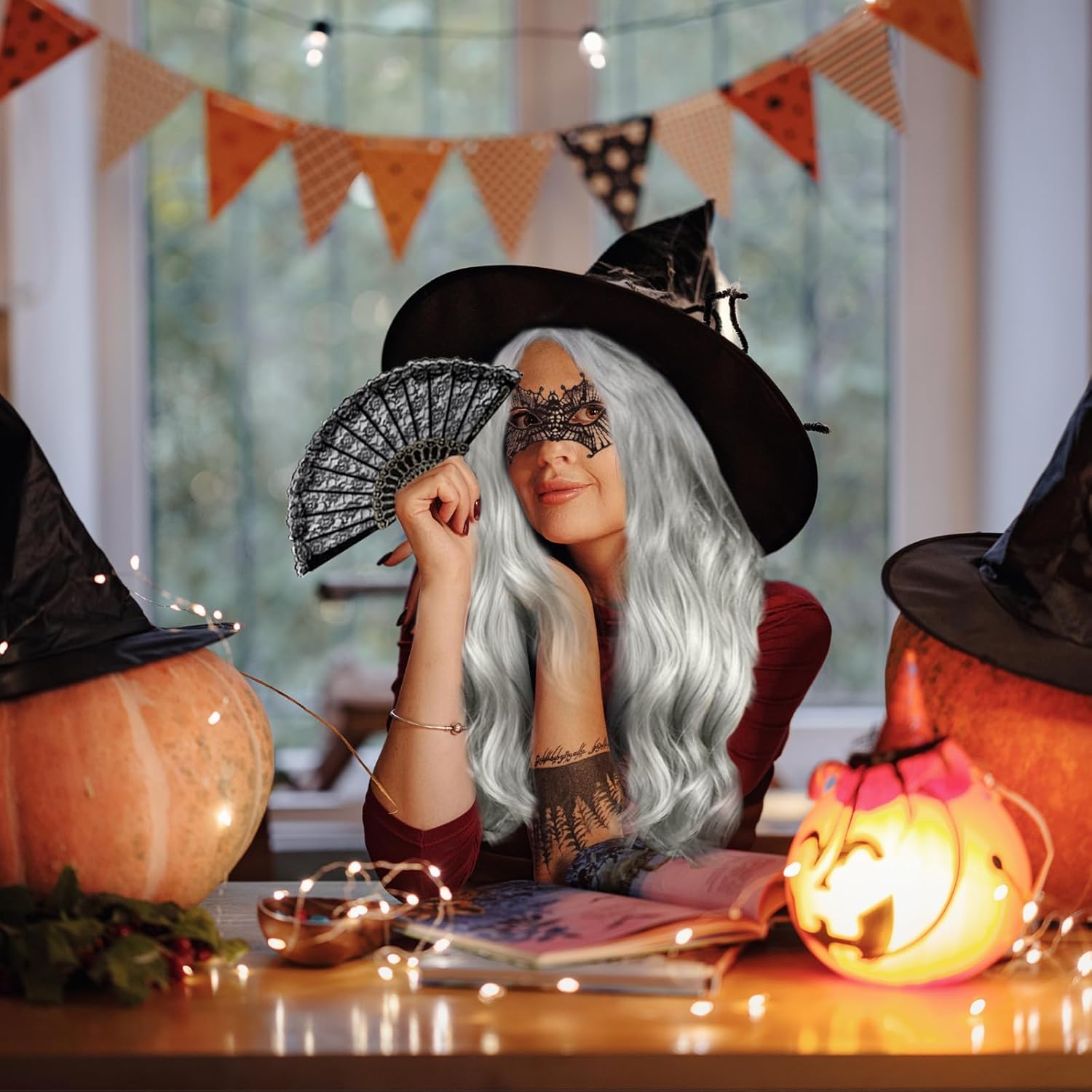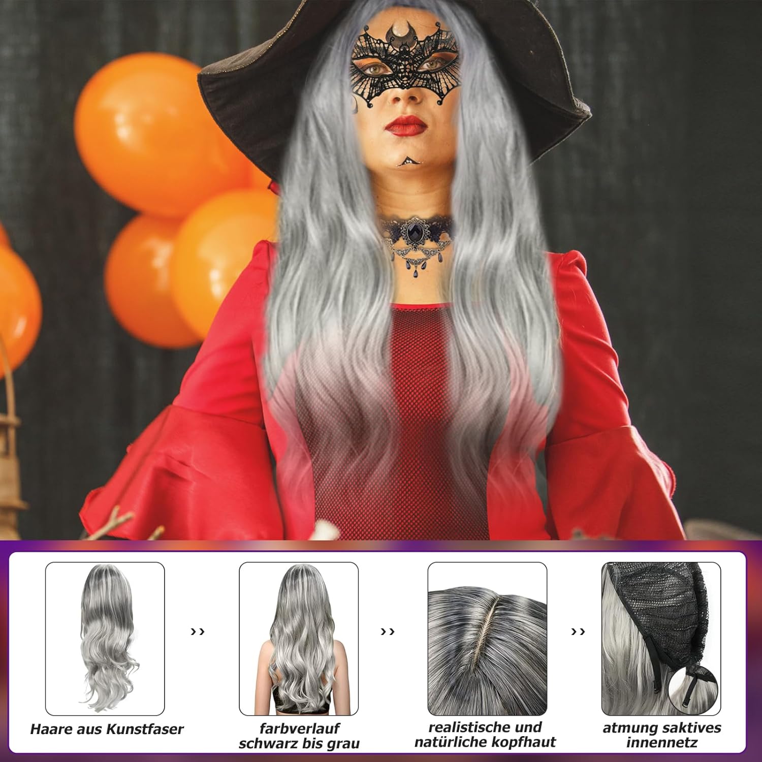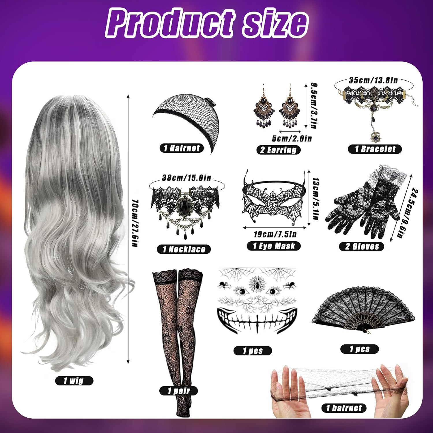 【Set Parrucca Halloween】 Consegna Parrucca Halloween Donna Contenuto 1 pezzo di parrucca halloween donna (70cm), 1 pezzo di rete parrucca (che rende la parrucca comoda da indossare), 2 pezzi di collana di pizzo gotico, 1 x calze di pizzo nero, 1 x adesivo tatuaggio di Halloween, 1 paio di orecchini gotici, 1 pezzo di pizzo ventaglio mano, 1 paio di guanti di pizzo, 1 pezzo di maschera viso gotico. È possibile indossare la parrucca in alcuni balli in costume o nella vita quotidiana, e può essere tagliata o rifinita in qualsiasi stile si desideri. 【Set di parrucche e maschere di alta qualità】HuaMuDM è realizzato con parrucche in fibra sintetica 100% di alta qualità ad alta temperatura, resistenti al calore, stile onda sciolta, sembra naturale e si sente liscio e morbido. Il cappuccio a rete elastico regolabile incorporato rende la parrucca adatta alla maggior parte delle dimensioni della testa. Attraverso la sterilizzazione ad alta temperatura, sana, non danneggia il cuoio capelluto. 【Gioielli gotici】Confezione di set di gioielli gotici, adatti per donne e ragazze, maschera sexy di pizzo nero in maschera, collane, orecchini e guanti per la festa di Halloween, festa di carnevale in maschera gotica, festa di carnevale in costume cosplay. Lo speciale stile gotico ti dà un tocco di mistero e ti fa sembrare più affascinante e attraente. 【Indosso realistico e naturale】 Grey Long Wavy Curly Hair un look realistico e naturale, è facile da indossare e togliere e si adatta perfettamente alla forma della testa. e può essere pettinato normalmente dopo aver indossato e si abbina perfettamente a diverse tonalità di pelle. 【Occasioni applicabili】 Il costume di Halloween è durevole e adatto all'uso a lungo termine. Le parrucche da donna di Halloween sono perfette per Halloween, carnevale, cosplay, feste in costume, concerti e altro ancora. Porta più personalità e divertimento alla tua festa.