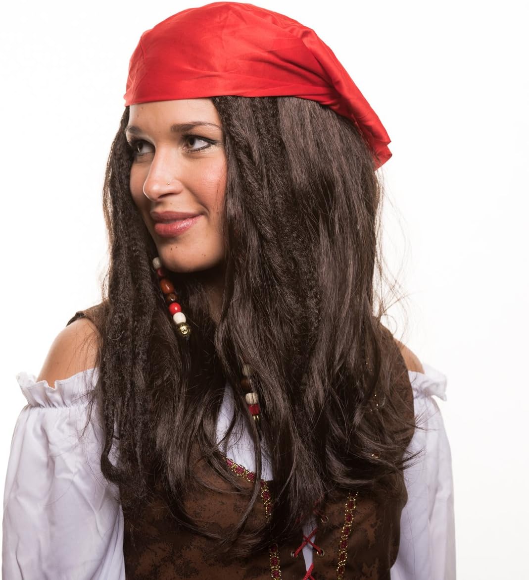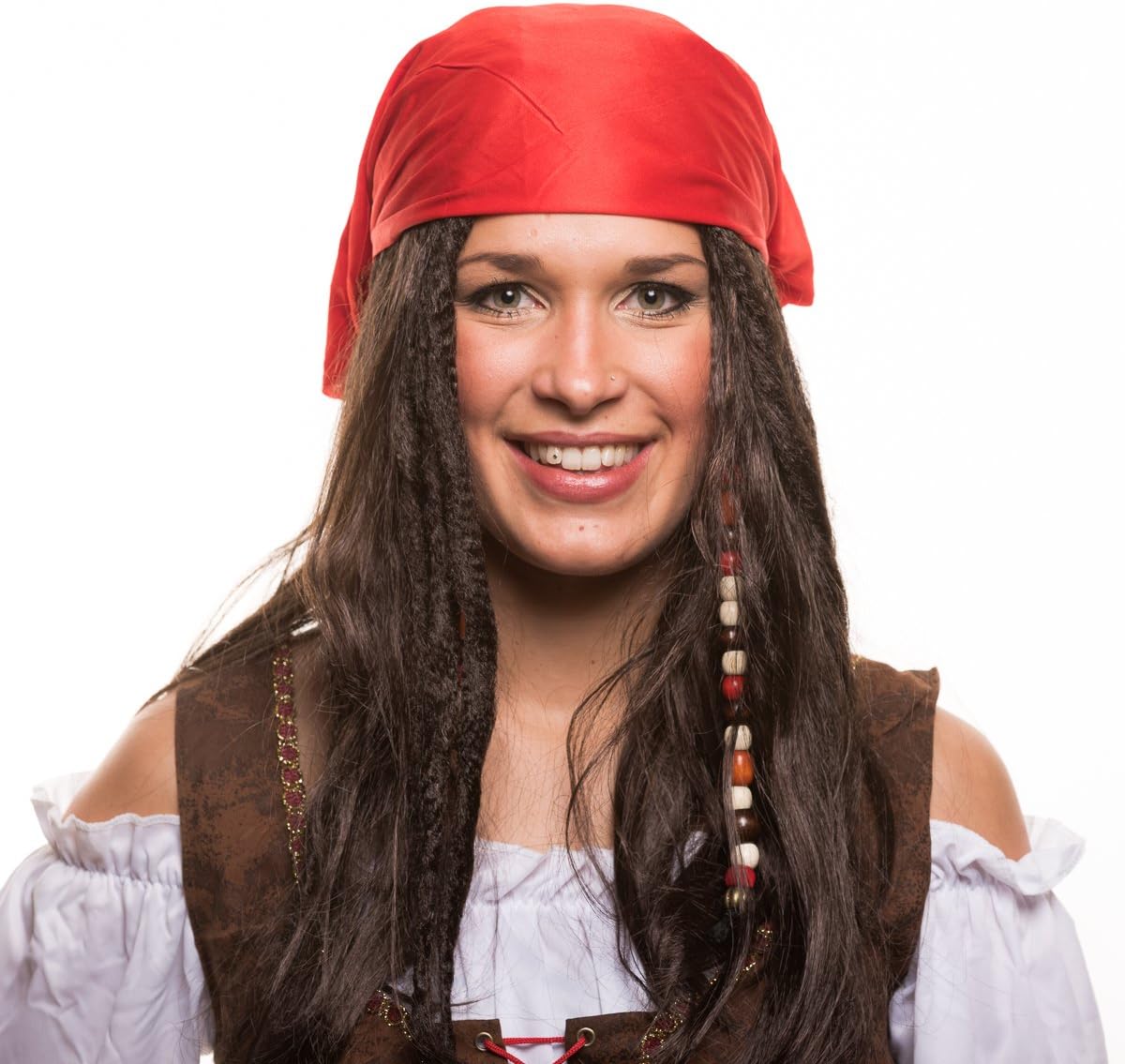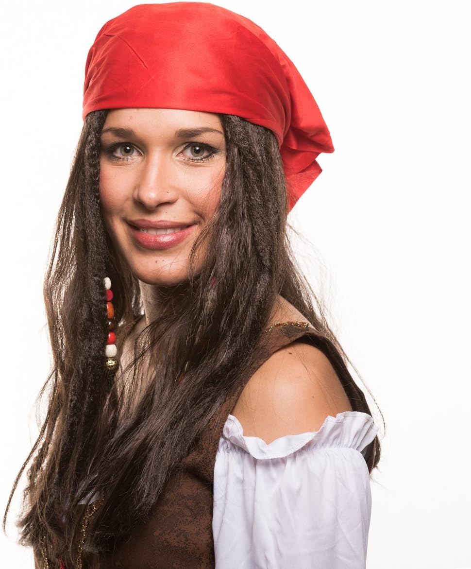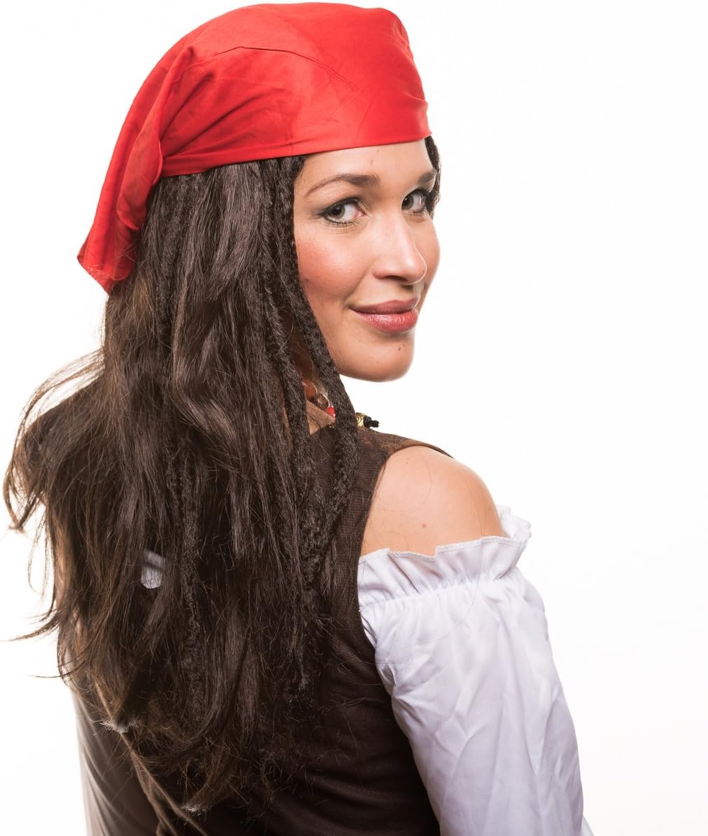 Per un autentico look da pirata, con perle e foulard Parrucca da donna pirata, per un travestimento all'altezza del mare Ideale per feste di carnevale e in maschera, feste di addio al celibato, feste in maschera e feste a tema Materiale: parrucca + foulard 100% poliestere / perline di legno, retina per capelli integrata Contenuto della fornitura: parrucca da pirata con fili di perle + foulard rosso + baffi + barba al mento con perle