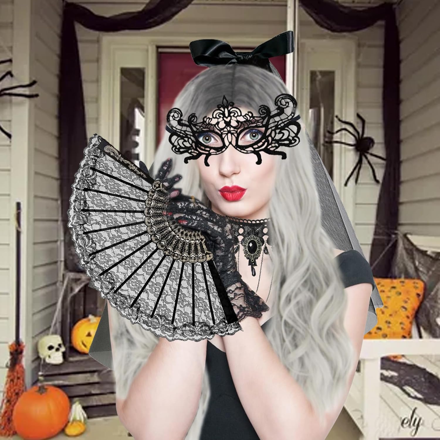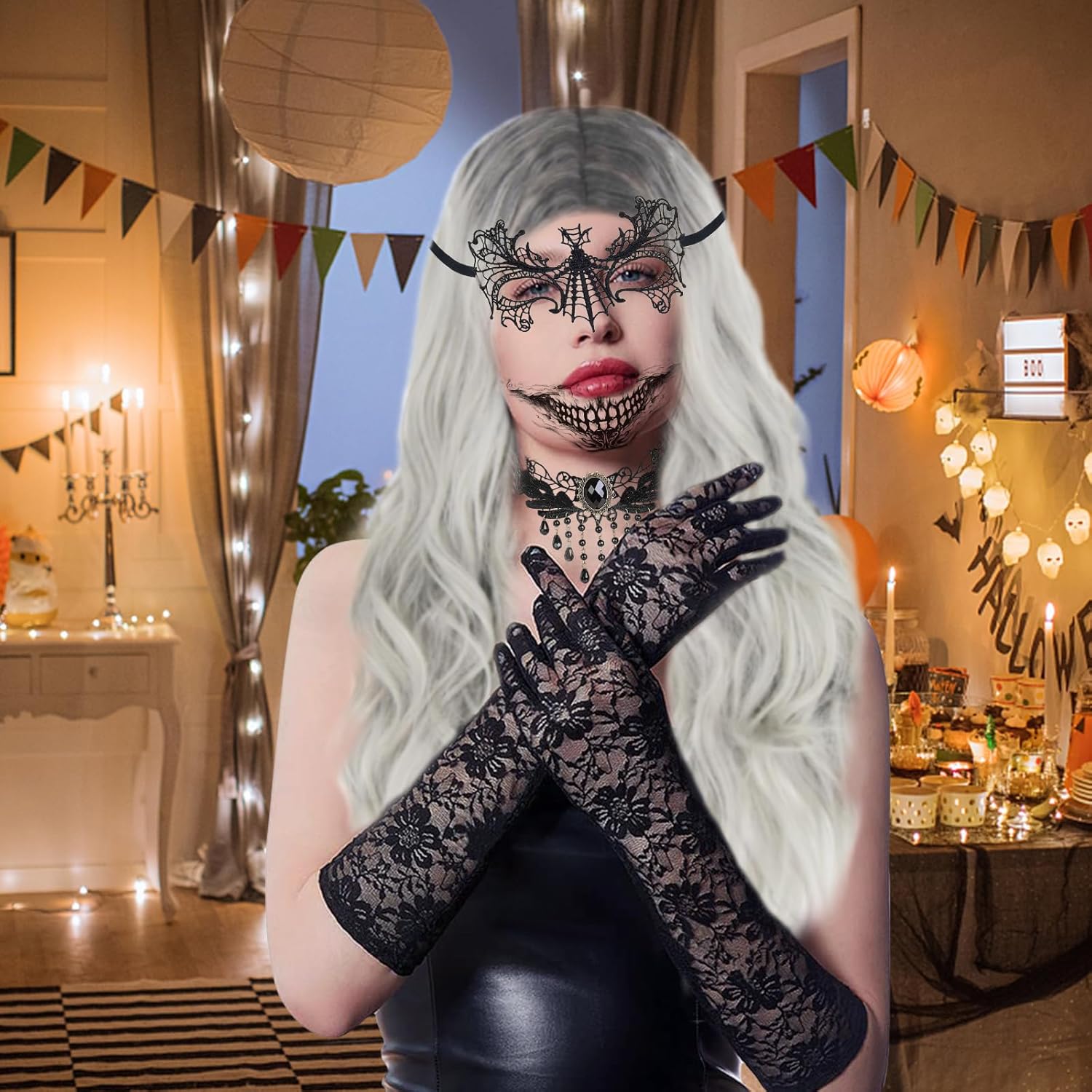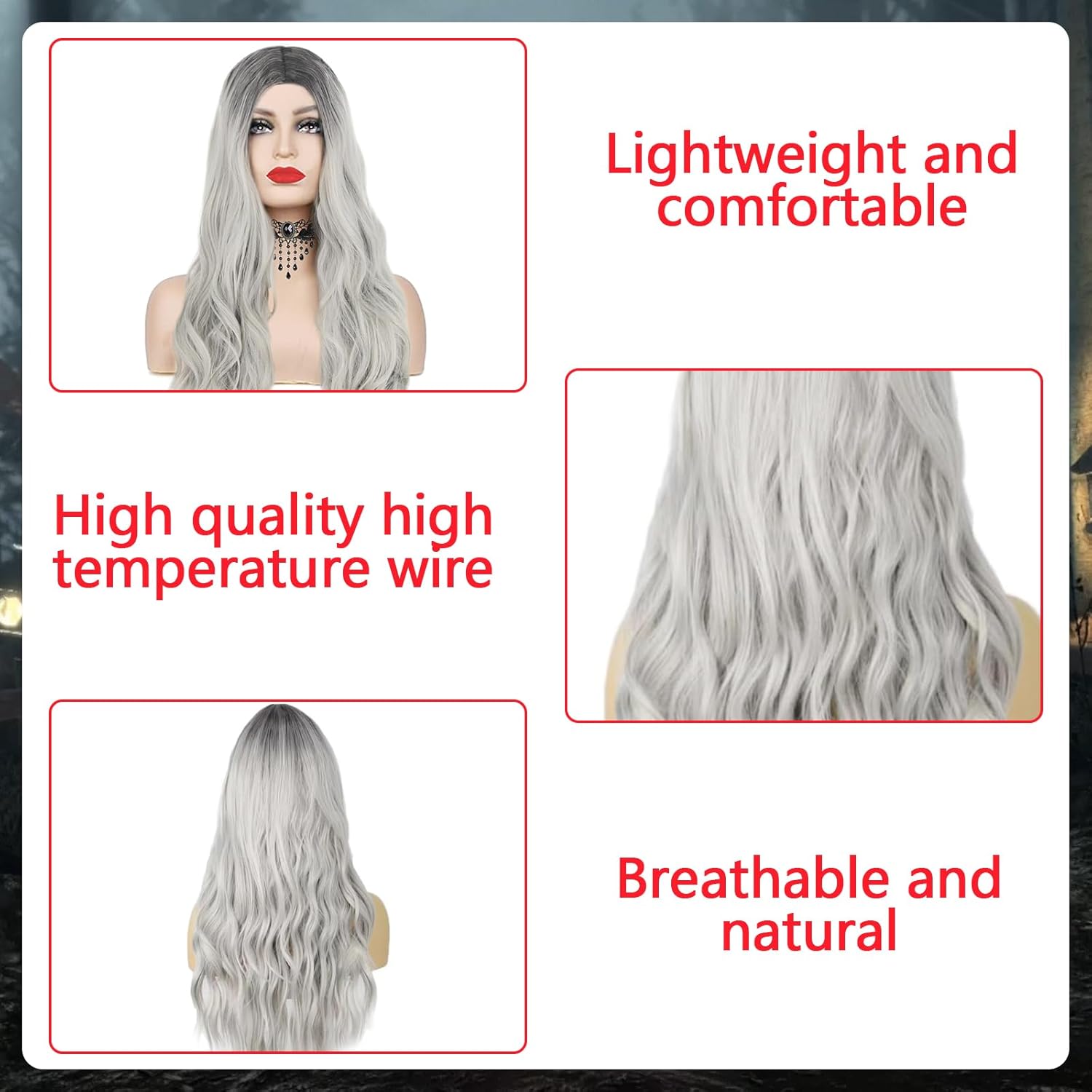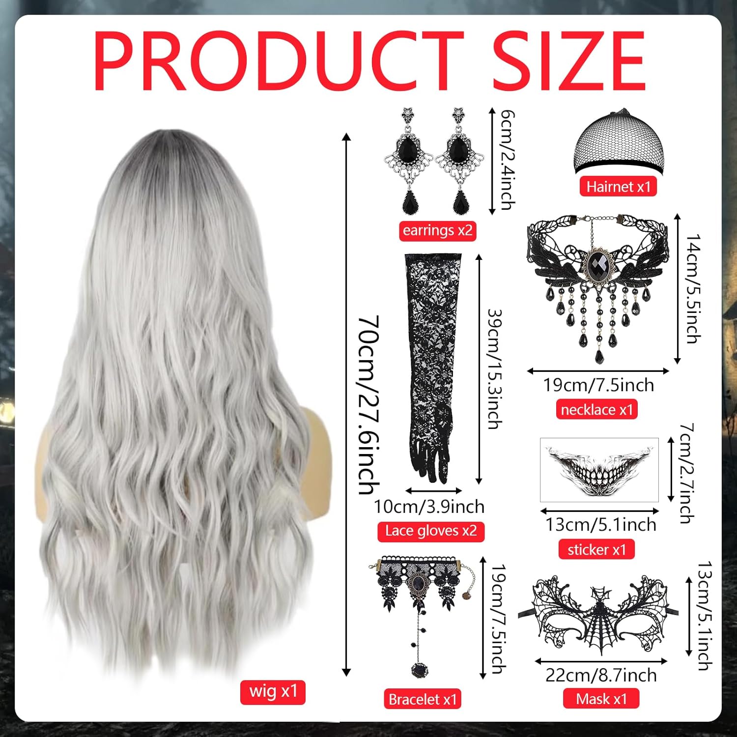 Set di Parrucca Halloween Donna: Il set di Parrucca da Donna per Halloween include 1 Parrucche Lunghe Grigio + 1 rete per parrucca, 1 collana, 1 bracciale, 1 maschera per occhi ricamata, 1 adesivo tatuaggio per Halloween, 1 paio di orecchini, 1 paio di guanti in pizzo, accessori che si combinano perfettamente con il tuo costume per Halloween Materiale di alta qualità: Le Parrucche Halloween argentate sono realizzate con fibre sintetiche di alta qualità e ricche di riccioli naturali grigi per un aspetto realistico e un comfort di portaggio gradevole. Sembrano naturali, sono morbide al tatto, facili da pettinare e meno inclini a cadere e a incepparsi Portaggio realistico e naturale: I Parrucche Lunghe Grigio offrono un look realistico e naturale, si indossano e si tolgono facilmente e si adattano perfettamente alla forma della tua testa. Possono essere pettinati normalmente dopo l'uso e si adattano perfettamente a diversi colori della pelle Indossare la parrucca: Questa Parrucca Grigia Da Donna è adatta alla maggior parte delle persone, adatta all'uso durante tutto l'anno, il set di parrucche per Halloween con punta nera e gioielli gotici, perfetto per Halloween, Mardi Gras, mascherate e altro ancora Ambito di applicazione: L'effetto di portaggio della Parrucca Grigia Da Donna è molto adatto alla vita quotidiana ed è appariscente, è perfetta per carnevali, feste a tema, matrimoni, appuntamenti, feste di moda, cosplay di costumi e Halloween, mascherate, eventi a tema e altro ancora