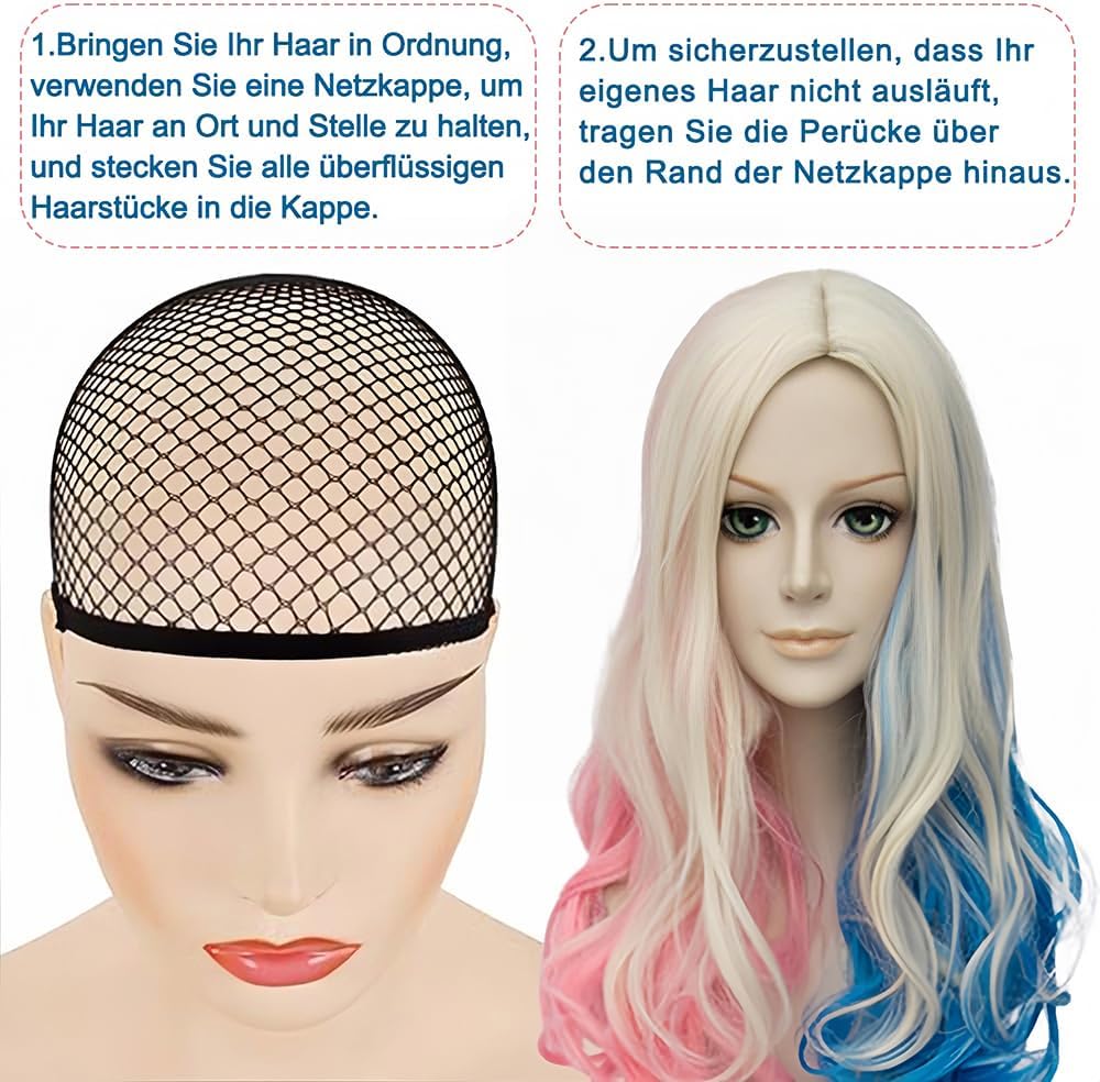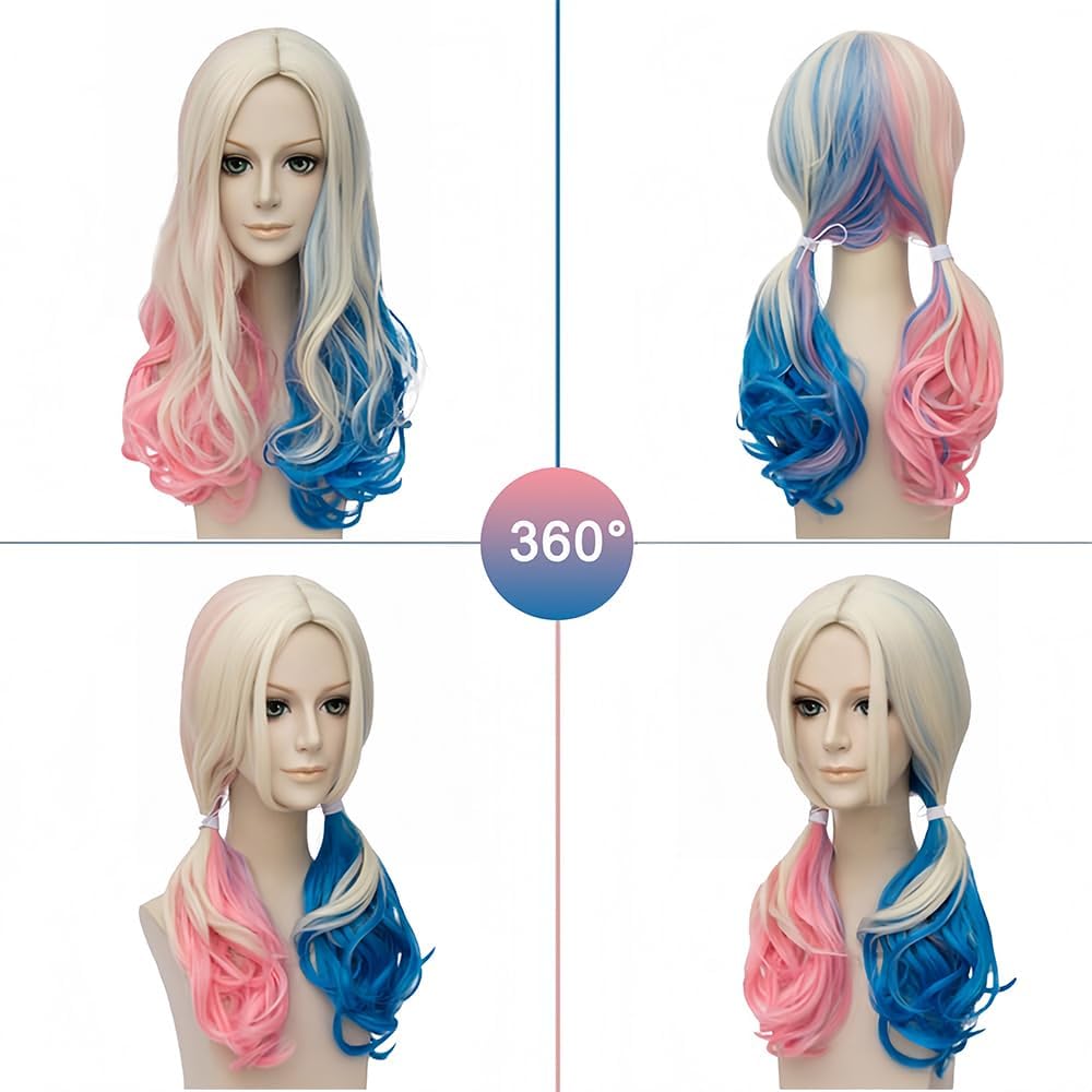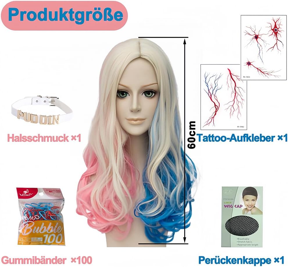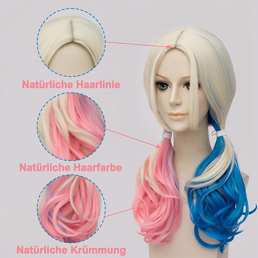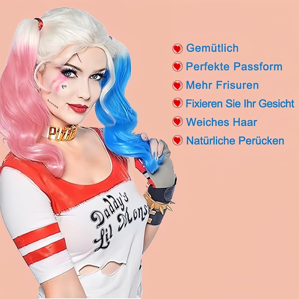 👩🏻🦰【Accessori per cosplay di Harley Quinn】1 parrucca rosa e blu per cosplay + 2 tatuaggi di Halloween a forma di vaso sanguigno + 1 girocollo in pelle bianca + 100 elastici colorati per capelli + 1 retina per parrucca. Questa parrucca per donne con attaccatura dei capelli naturale ti dona più sicurezza e glamour. Indossarla ti farà sentire come se fossi nuova di zecca. 👩🏻🦰【Materiali di alta qualità】Le parrucche da donna sono realizzate in fibra di alta qualità resistente al calore, delicata sulla pelle, setosa, morbida e naturale. Leggere, facili da indossare e con un nuovo stile che fa risparmiare tempo. Questa parrucca ti regalerà sicuramente un'esperienza visiva completamente nuova e i complimenti e la sicurezza che suscita ti sorprenderanno. 👩🏻🦰【Adatto a tutte le persone】Robusto, comodo da indossare e dalla vestibilità perfetta. Questa parrucca mista riccia è morbida al tatto e comoda da indossare. La parrucca è flessibile e quindi si adatta a qualsiasi testa. Ci sono due elastici regolabili all'interno della parrucca. La taglia può essere regolata in base alla forma della testa, garantendo una vestibilità perfetta ed è adatta alla maggior parte delle persone. 👩🏻🦰【Design Cosplay di Quinn】: La parrucca presenta una consistenza morbida, una bellissima acconciatura a doppia coda, una densità di capelli molto piena, un colore naturale, è molto simile ai veri capelli umani ed è perfetta per un costume da clown di carnevale. 👩🏻🦰【Ampiamente usato】: Non solo è un'ottima scelta come costume di carnevale e Martedì Grasso, puoi usarla per Halloween, feste a tema, Comic-Con, costumi anime, eventi cosplay, carnevali o semplicemente per divertimento. Ideale per molte occasioni festive.