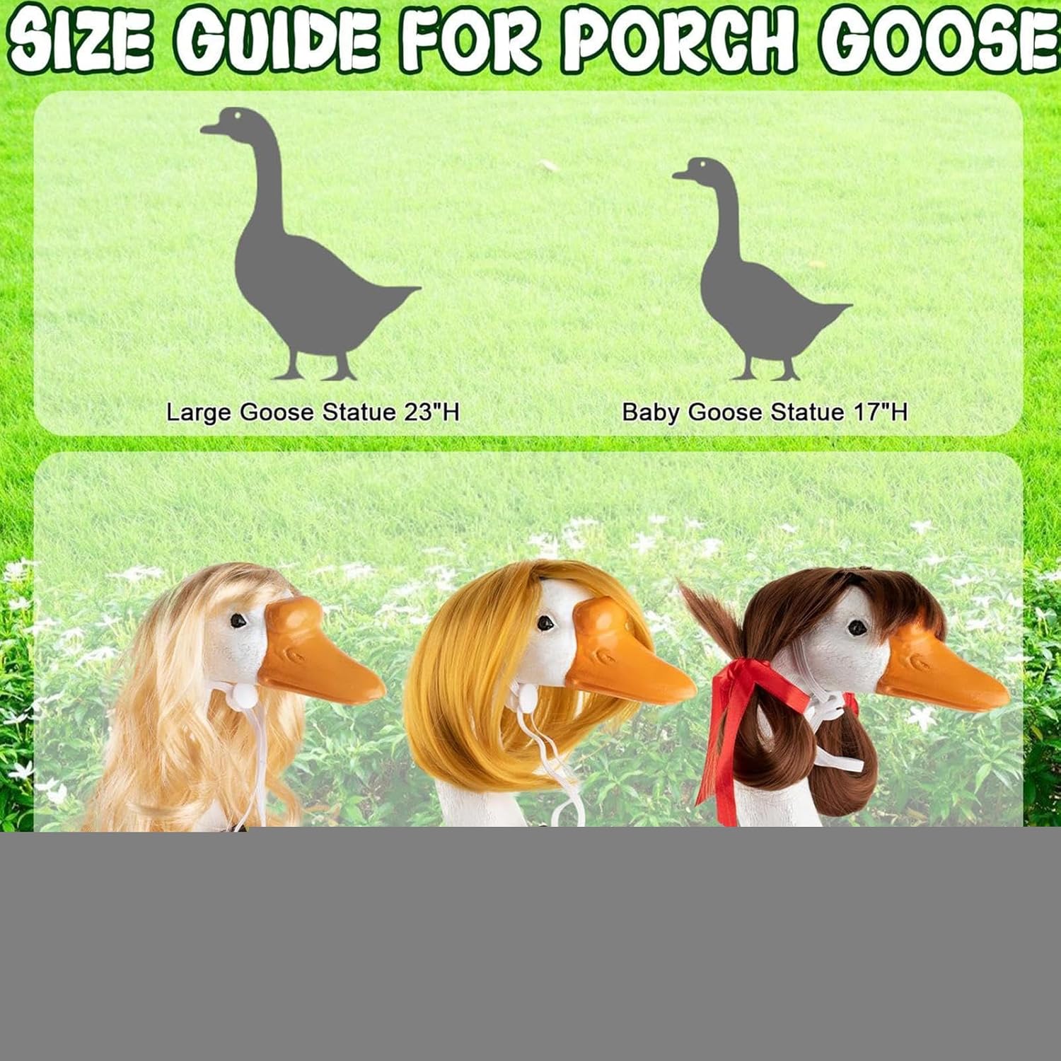 Parrucche di arredamento stagionale: progettato come parrucche di arredamento stagionale, questo set da 3 pezzi include stili di bob ondulati, fornendo opzioni di stile versatili per sollevare accessori per le vacanze e celebrazioni a tema con fascino senza sforzo Materiale di buona qualità: con colori a prova di dissolvenza e materiale resistente ai raggi UV, questa parrucca resistente alle intemperie è costruita con una robusta fibra sintetica, fornendo un'opzione di decorazione esterna resiliente che prospera in diverse impostazioni ambientali Centrotavola di cantiere Appeal: adorna la statua oche portico con accenti di prua, creando un delizioso fulcro cortile e migliorando gli spazi all'aperto attraverso decorazioni creative parrucca che affascina i visitatori Accessorio Fit Fit Secure: con cinturini per parrucche regolabili e un design non slip, questa WIG Accessorio statue oche garantisce un facile di installazione con stabilità costante per una presentazione ottimale Applicazioni versatili: porta la vita nel tuo giardino usando questo come accessorio per cantiere festivo, o divertente pezzo di styling all'aperto, ideale per l'arredamento delle feste natalizie, feste in piscina e esigenze di accessorio in costume di Pasqua