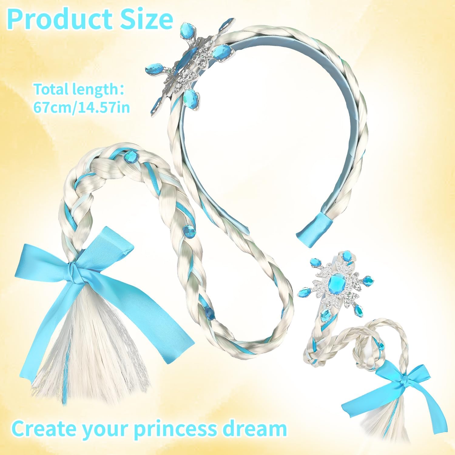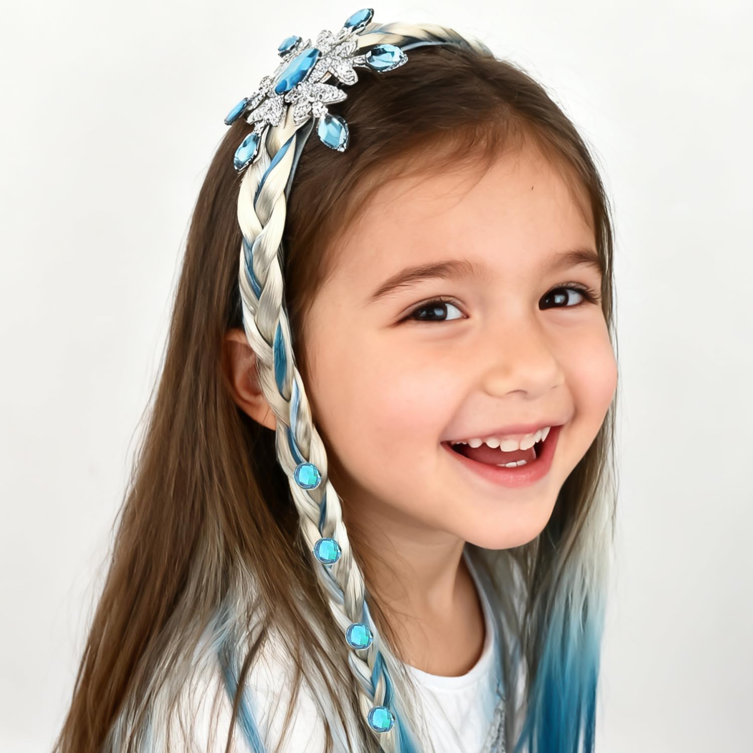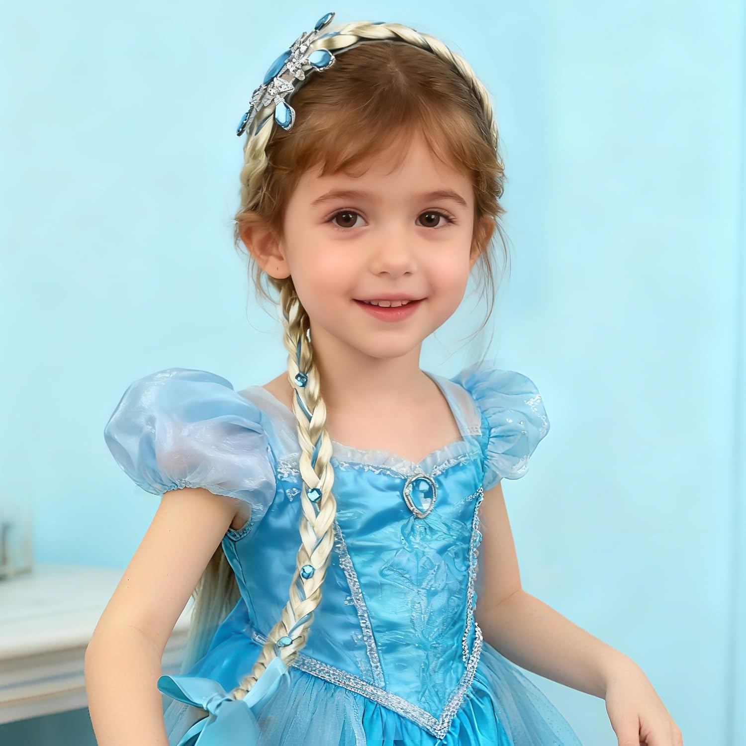 [Design elegante da principessa]: Trasformati in un personaggio da fiaba con questa parrucca lunga intrecciata, decorata con un raffinato fiocco blu, una corona piumata e una fascia impreziosita da cristalli a forma di fiocco di neve. [Capelli sintetici di qualità]: Realizzata in morbide fibre sintetiche di alta qualità intrecciate in una treccia resistente con nastro blu, garantendo comfort e un aspetto magico duraturo per eventi in costume. [Dettagli cristallini brillanti]: Presenta un design con cristalli blu a forma di fiocco di neve che riflettono la luce da ogni angolazione, aggiungendo un tocco scintillante e magico a feste a tema e occasioni speciali. [Vestibilità regolabile e confortevole]: Dotata di una fascia regolabile che garantisce una vestibilità sicura e comoda, ideale per ore di gioco in costume senza disagio o scivolamenti. [Uso versatile per costumi]: Perfetto per feste a tema, eventi in maschera e occasioni speciali. Adatto a bambini dai 3 anni in su per creare look incantevoli da principessa, fata o personaggio invernale.