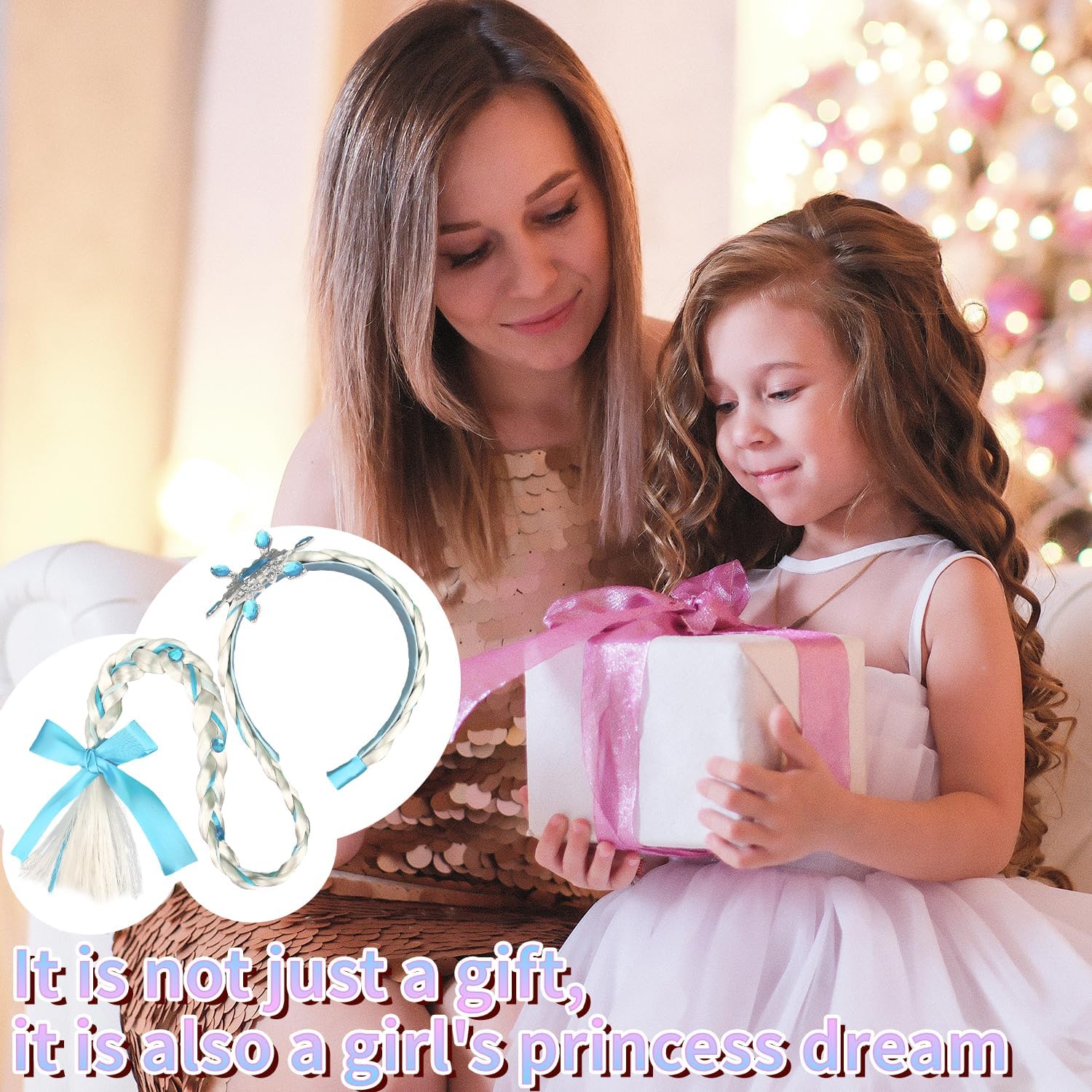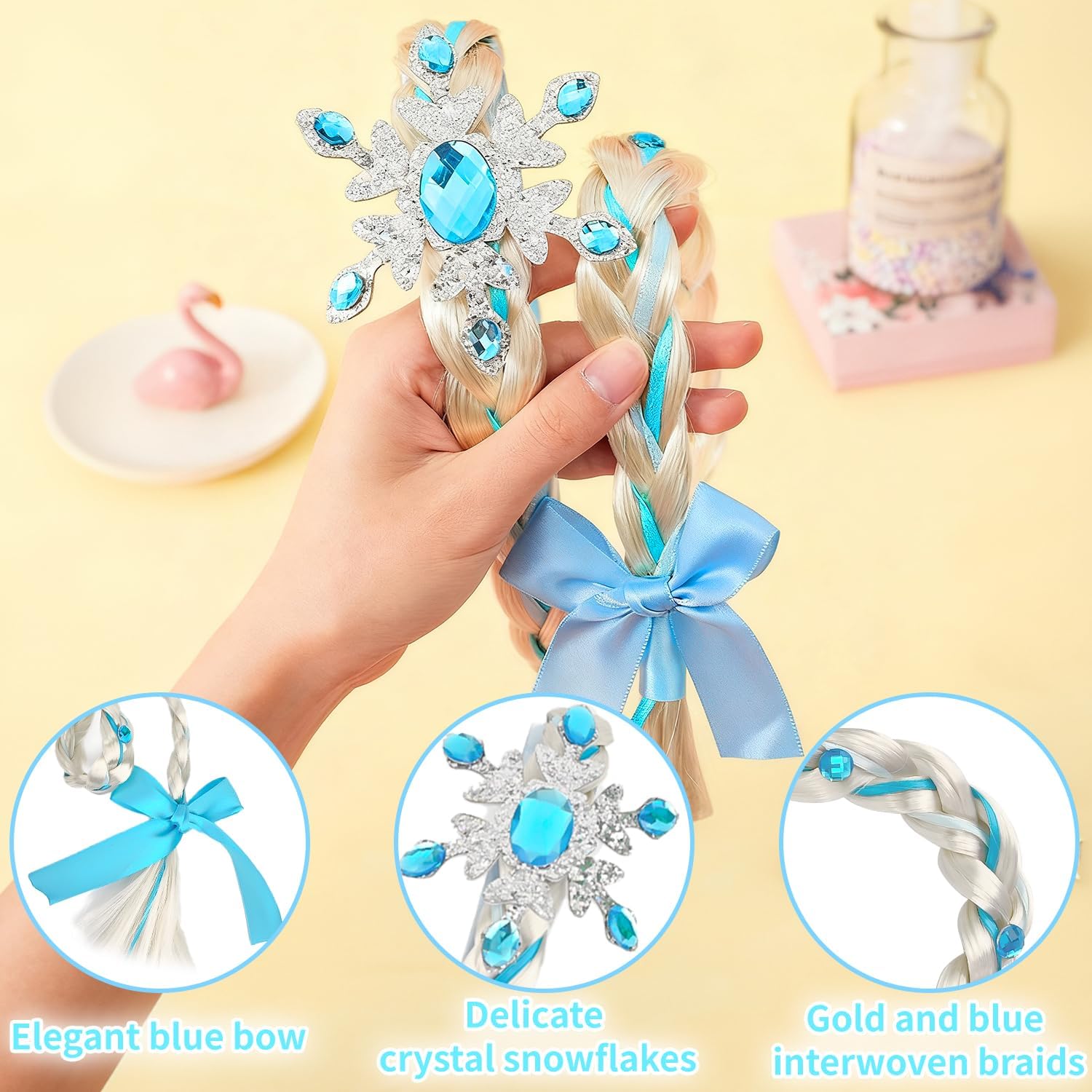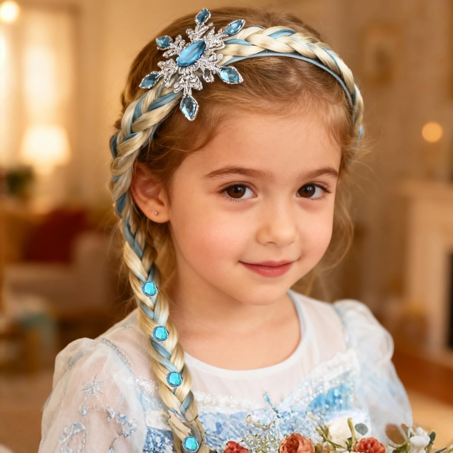 [Design elegante da principessa]: Trasformati in un personaggio da fiaba con questa parrucca lunga intrecciata, decorata con un raffinato fiocco blu, una corona piumata e una fascia impreziosita da cristalli a forma di fiocco di neve. [Capelli sintetici di qualità]: Realizzata in morbide fibre sintetiche di alta qualità intrecciate in una treccia resistente con nastro blu, garantendo comfort e un aspetto magico duraturo per eventi in costume. [Dettagli cristallini brillanti]: Presenta un design con cristalli blu a forma di fiocco di neve che riflettono la luce da ogni angolazione, aggiungendo un tocco scintillante e magico a feste a tema e occasioni speciali. [Vestibilità regolabile e confortevole]: Dotata di una fascia regolabile che garantisce una vestibilità sicura e comoda, ideale per ore di gioco in costume senza disagio o scivolamenti. [Uso versatile per costumi]: Perfetto per feste a tema, eventi in maschera e occasioni speciali. Adatto a bambini dai 3 anni in su per creare look incantevoli da principessa, fata o personaggio invernale.