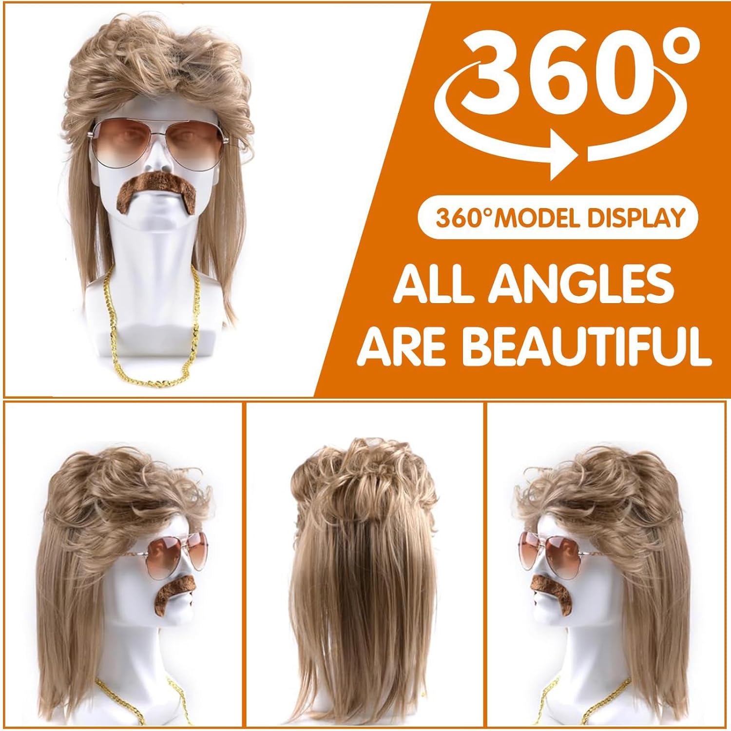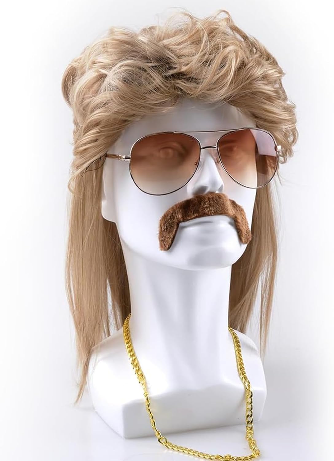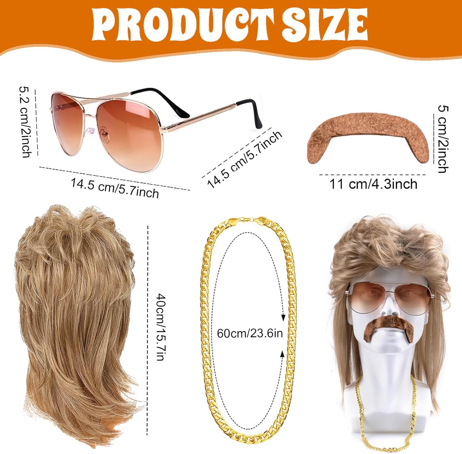 Accessori per costume da uomo anni '80: il set di accessori per costume da uomo include 1 parrucca bionda Vokuhila, 1 grande catena d'oro, 1 paio di occhiali da sole e 1 baffi finti. Molto classico! MATERIALE RESISTENTE Gli accessori da uomo anni '80 e '90 sono realizzati in materiale di alta qualità, che garantisce sicurezza e stabilità Parrucca di Carnevale: questa parrucca Vokuhila è naturalmente bella, morbida al tatto e resistente. Può essere tagliato o tagliato a piacimento. Inoltre, la parrucca ha una testiera regolabile in rete per il massimo comfort. Stile retrò: occhiali da sole marroni e collane grandi con molta personalità erano articoli di moda popolari negli anni '80. Da indossare per creare un look retrò 【Applicazioni】Perfetto per l'uso quotidiano, carnevale, concerti, feste a tema o altre occasioni. Regalo perfetto per famiglie e amici.