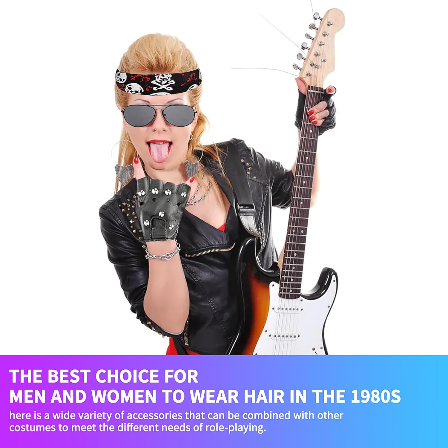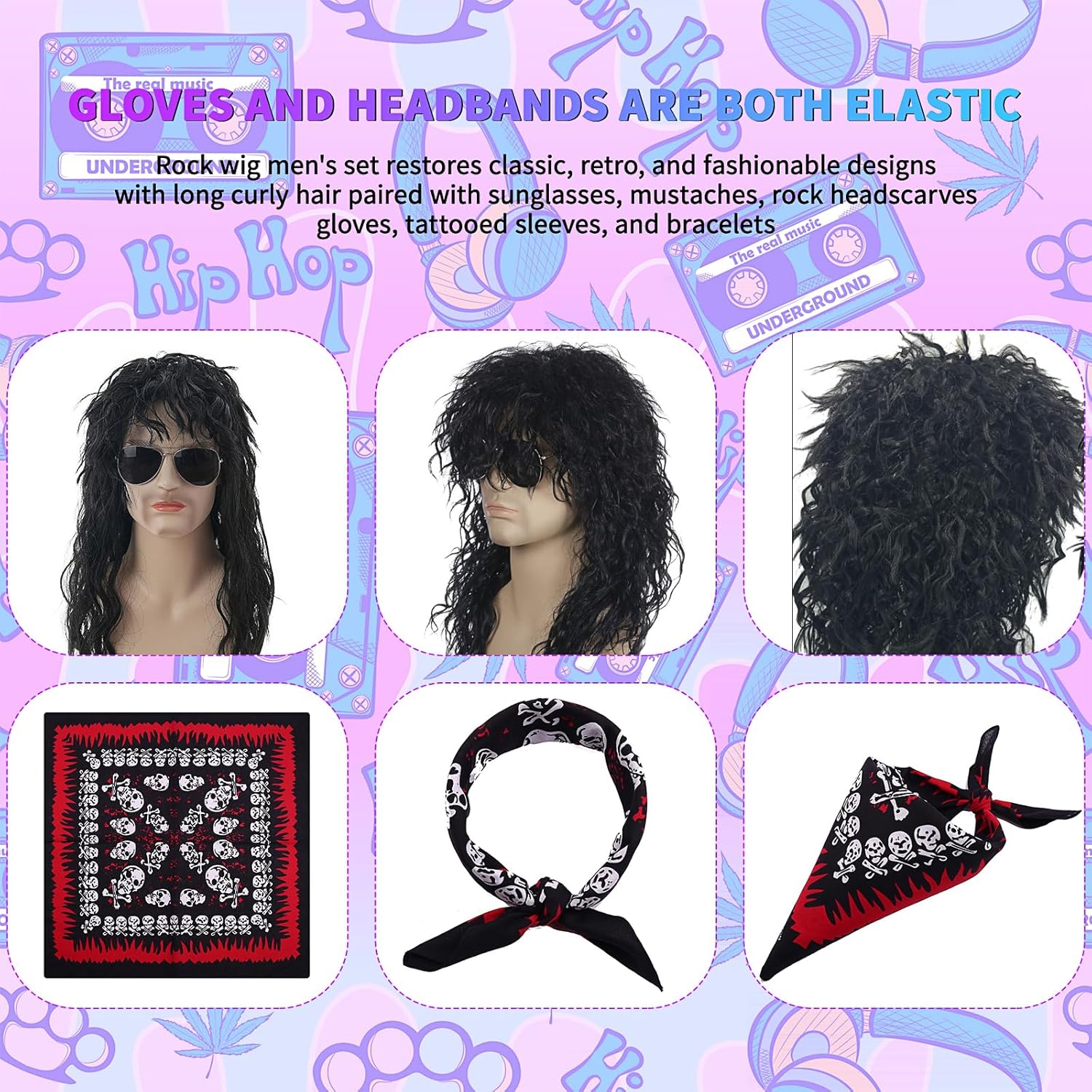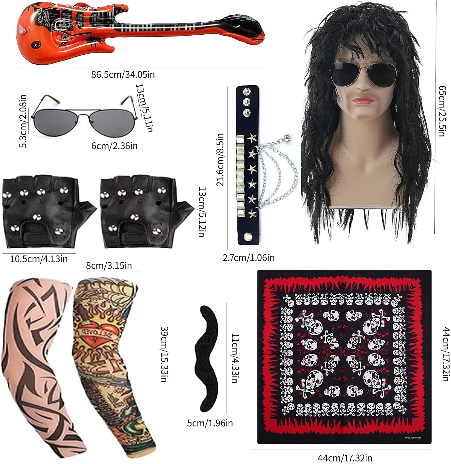 【Set Rock and Roll】Il pacchetto di parrucche rock da uomo include 1 capello lungo nero riccio, 1 paio di occhiali da sole, 1 paio di baffi, 1 bandana, 1 paio di guanti borchiati, 1 paio di guanti da tatuaggio, 1 chitarra gonfiabile e un braccialetto di stelle. 【Materiale di alta qualità】Il Parrucca Uomo Costumi Set è realizzato in nylon e poliestere, la dimensione può essere regolata per adattarsi alla maggior parte degli adulti. Le maniche, i guanti e le fasce sono tutti elasticizzati, quindi non c'è bisogno di preoccuparsi della differenza di dimensioni. 【Stile vintage】Parrucca rock da uomo per ricreare il design classico, retrò e alla moda, capelli lunghi e ricci con occhiali da sole, baffi, bandana rock, guanti, maniche e braccialetti tatuati e una chitarra a portata di mano per farti notare alla festa. 【Un'abbondanza di accessori】La scelta migliore per gli outfit 80s da uomo, con una vasta gamma di accessori che possono essere combinati con altri outfit per soddisfare le diverse esigenze del gioco di ruolo. 【Occasioni applicabili】Set di Accessori hippy per travestirsi per il rock, il punk, la discoteca, adatto anche per i vestiti in maschera, il carnevale, Halloween, il Natale, le feste hippie, i festival musicali e altri eventi.