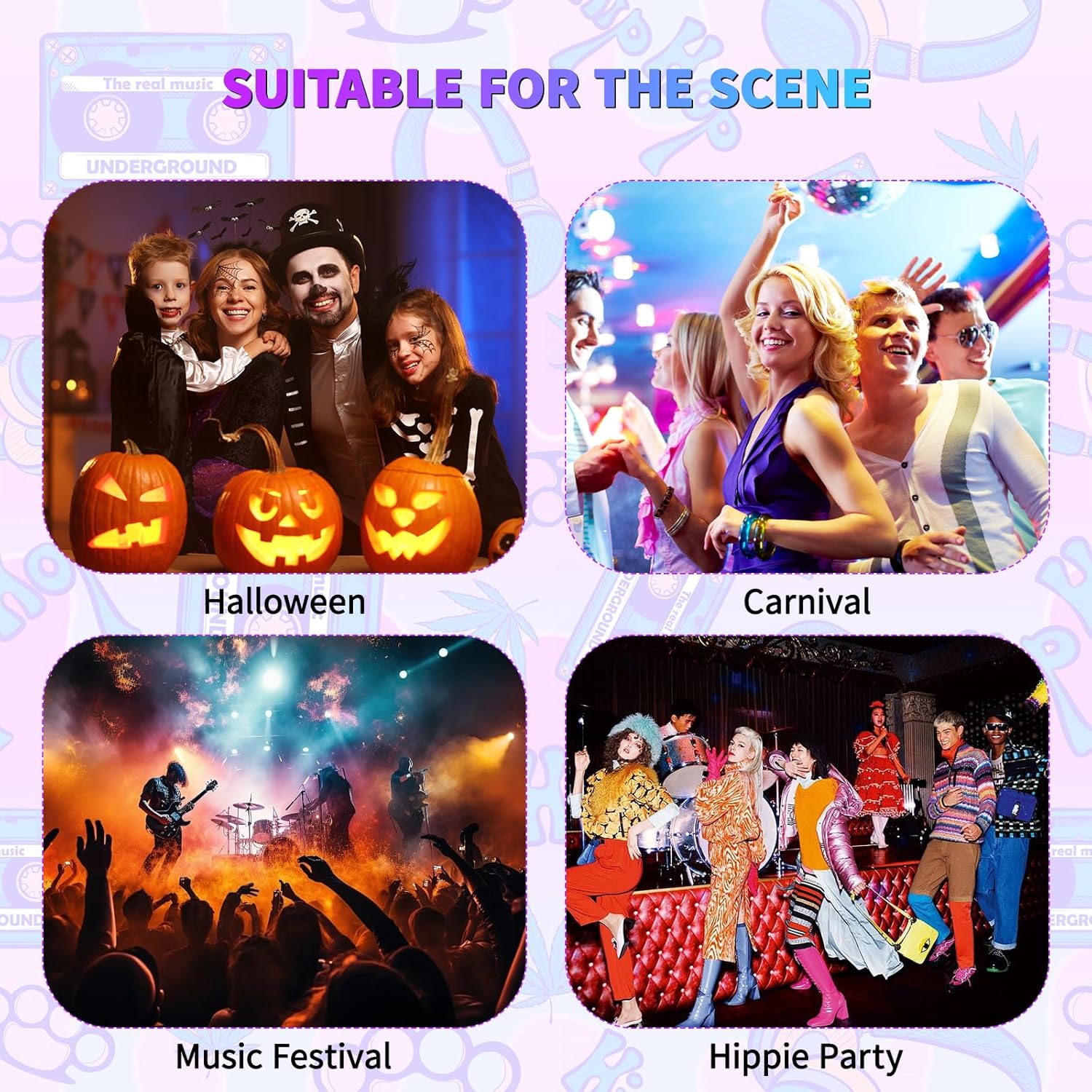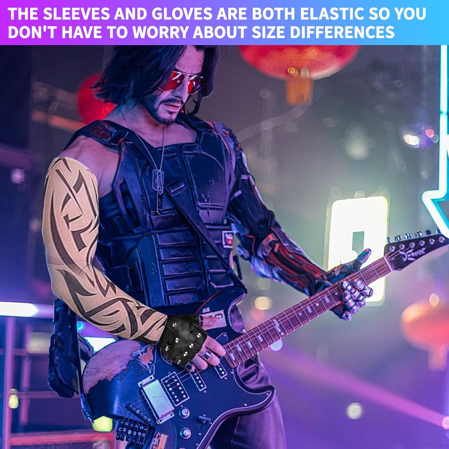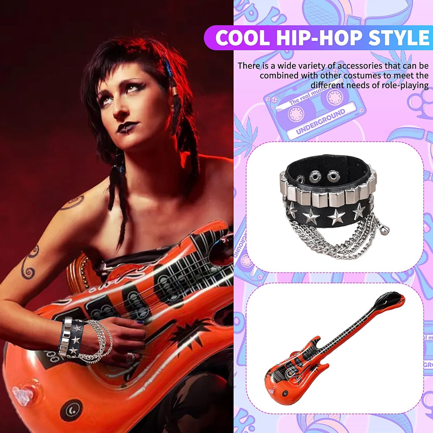 【Set Rock and Roll】Il pacchetto di parrucche rock da uomo include 1 capello lungo nero riccio, 1 paio di occhiali da sole, 1 paio di baffi, 1 bandana, 1 paio di guanti borchiati, 1 paio di guanti da tatuaggio, 1 chitarra gonfiabile e un braccialetto di stelle. 【Materiale di alta qualità】Il Parrucca Uomo Costumi Set è realizzato in nylon e poliestere, la dimensione può essere regolata per adattarsi alla maggior parte degli adulti. Le maniche, i guanti e le fasce sono tutti elasticizzati, quindi non c'è bisogno di preoccuparsi della differenza di dimensioni. 【Stile vintage】Parrucca rock da uomo per ricreare il design classico, retrò e alla moda, capelli lunghi e ricci con occhiali da sole, baffi, bandana rock, guanti, maniche e braccialetti tatuati e una chitarra a portata di mano per farti notare alla festa. 【Un'abbondanza di accessori】La scelta migliore per gli outfit 80s da uomo, con una vasta gamma di accessori che possono essere combinati con altri outfit per soddisfare le diverse esigenze del gioco di ruolo. 【Occasioni applicabili】Set di Accessori hippy per travestirsi per il rock, il punk, la discoteca, adatto anche per i vestiti in maschera, il carnevale, Halloween, il Natale, le feste hippie, i festival musicali e altri eventi.
