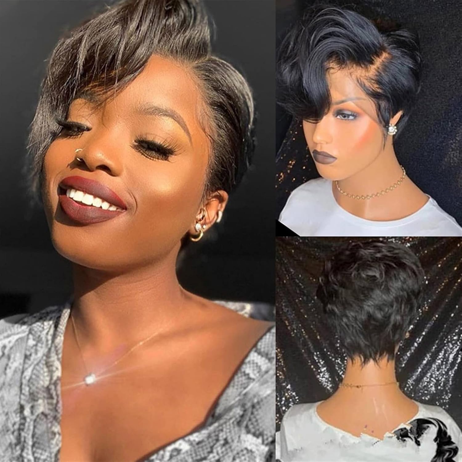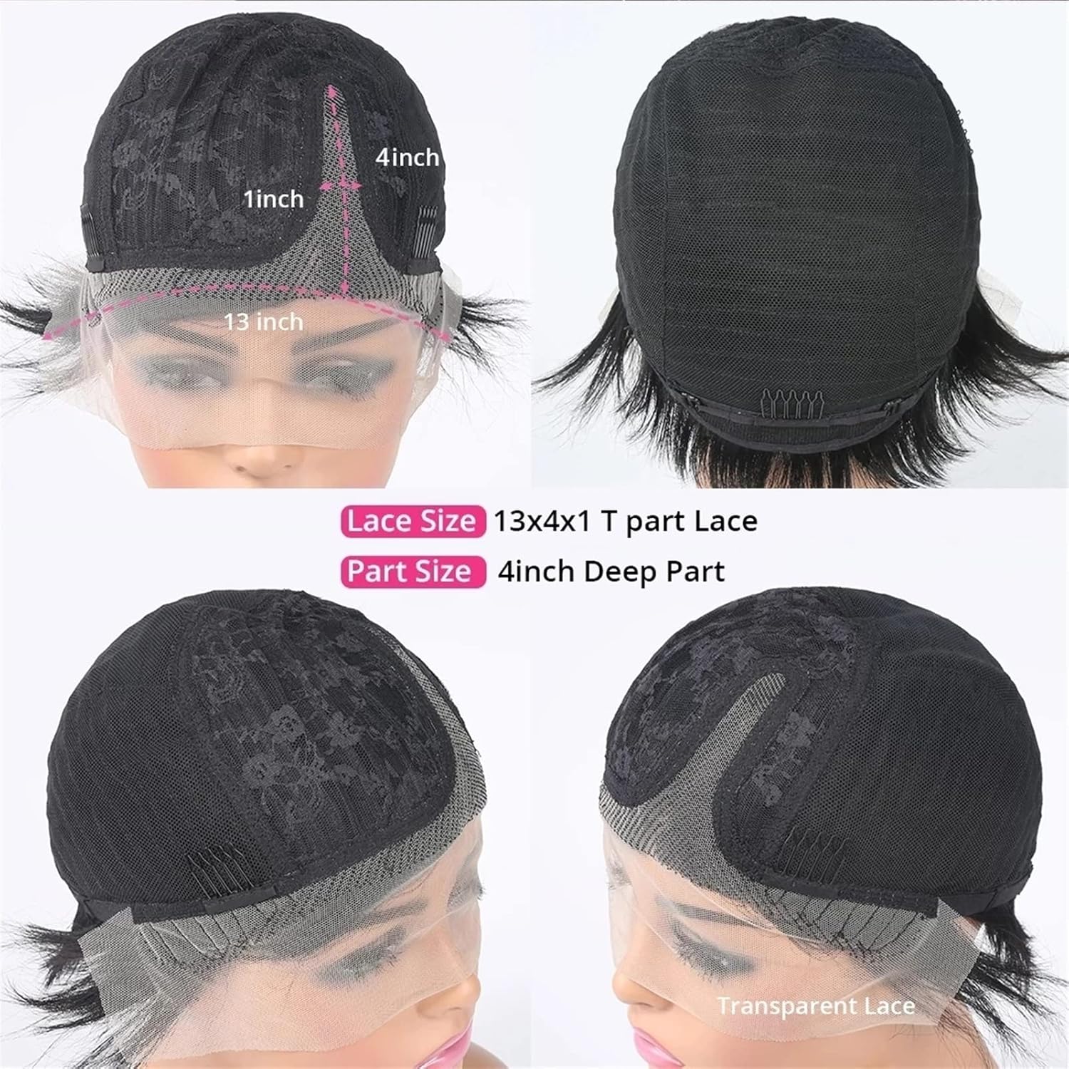 Stile di capelli lisci: parrucca corta e liscia stile folletto, aspetto naturale, facile da mantenere Materiale dei capelli: capelli umani al 100%, mantengono la cuticola completa, possono essere tinti, decolorati, arricciati, sani e morbidi Parrucca in pizzo a T: parrucca in pizzo a T 13×4×1 con riga centrale e attaccatura naturale. Adatta all'uso quotidiano femminile, può essere utilizzata anche per feste, sfilate di moda, appuntamenti e altre occasioni. Taglia del cappello: cappello medio (circonferenza 22,5 pollici) con 2 cinturini per regolare la taglia, adatto alla maggior parte delle taglie. Ci sono 3 pettini sul retro e 2 pettini sui lati, che possono essere usati per fissare bene la parrucca.