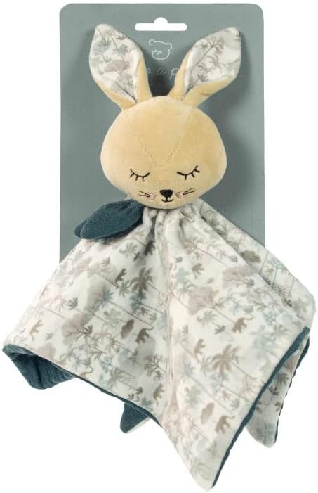 Doudou coniglio beige. Aiuta a rilassare il bambino toccandolo. Prodotto secondo le norme di sicurezza sui giocattoli EN-71. Dimensioni: 24 cm.