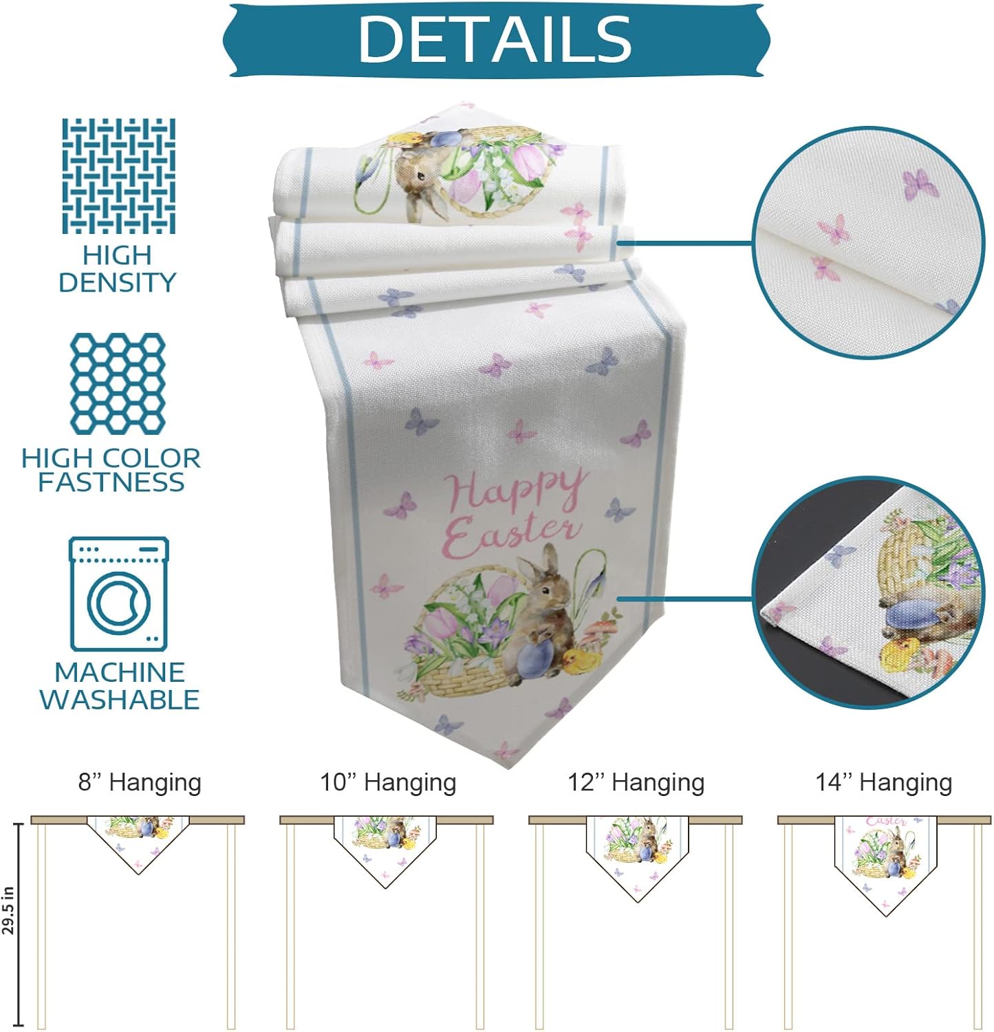 Struttura a forma di V a doppia faccia, artigianato squisito e tecnologia di cucito superba, linee lisce Materiale di poliestere di alta qualità, accuratamente selezionato per portare un tocco vivido al tavolo semplice, non facile da sbiadire, durevole e antiscivolo Protezione della tabella, evita le macchie che si rovesciano sul tavolo. Isolamento, evita i pasti caldi danneggiano il tavolo Perfetto per matrimoni, festa, evento speciale o uso quotidiano sia da pranzo informale che formale Istruzioni per la cura, lavabile in lavatrice, essiccabile, non sbiancabile. Ferro da stiro a basso se necessario, senza sbiadire e nessuna rugosità dopo il lavaggio