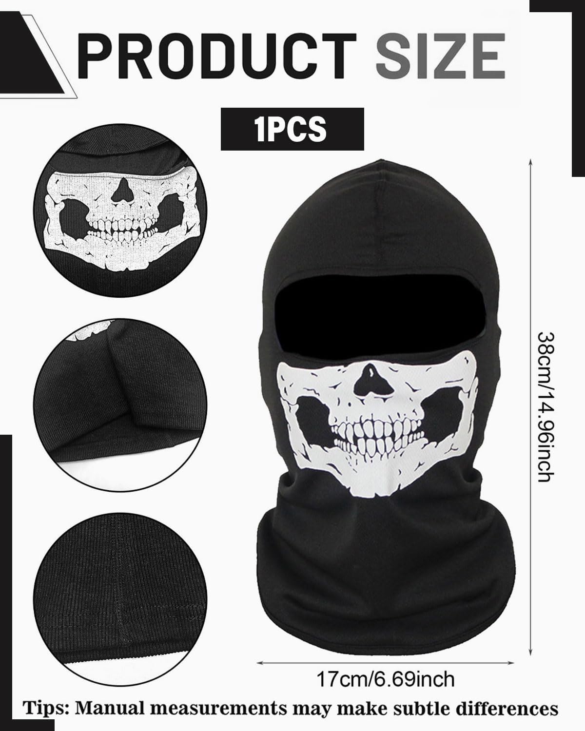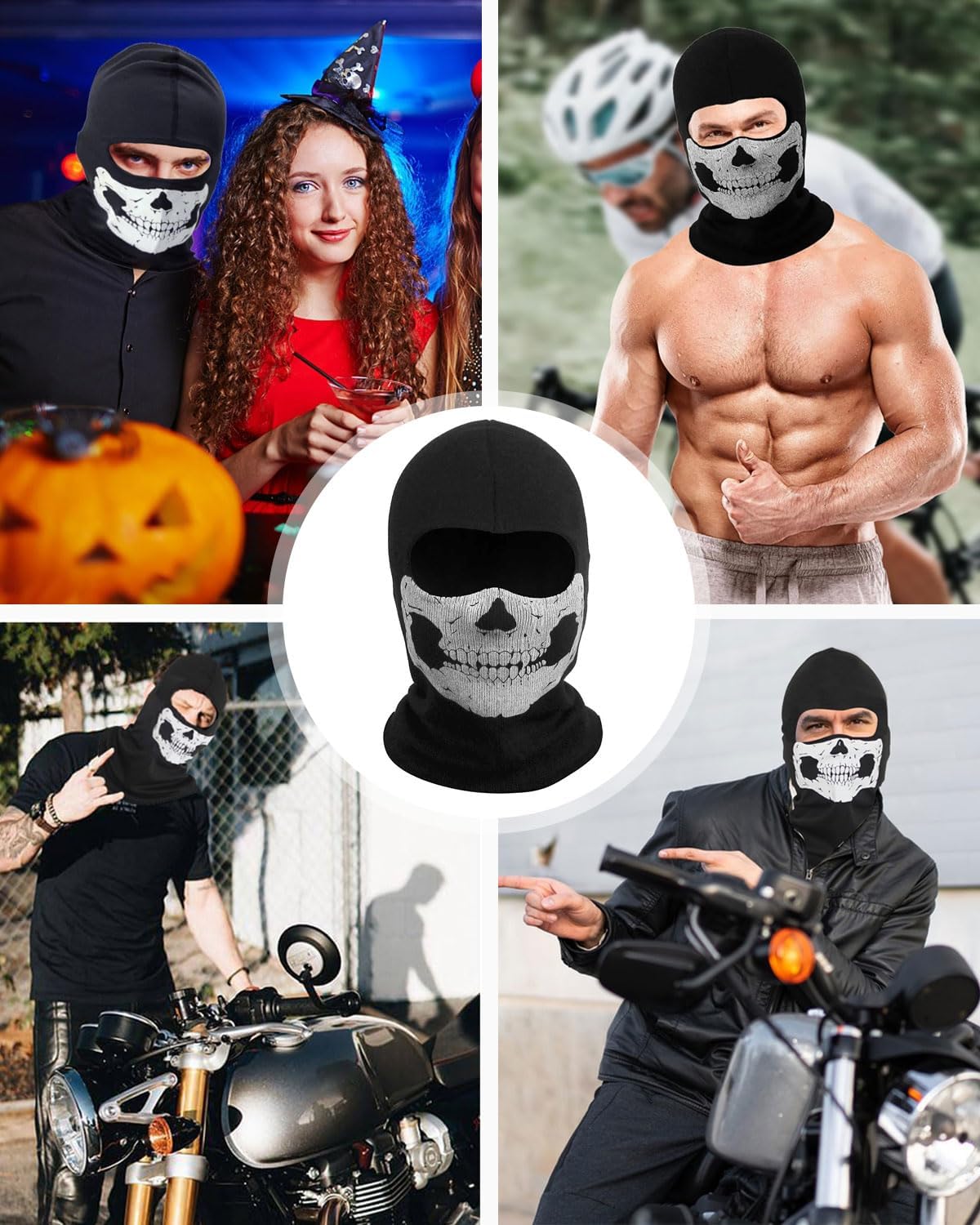 Questo cappello con teschio di Halloween è realizzato in tessuto di cotone morbido ed elastico che assorbe l'umidità, protegge dal vento e dal sudore e blocca efficacemente i raggi UV. Taglia unica adatta alla maggior parte degli uomini e delle donne. Maschera fantasma di Halloween: maschera fantasma con cappuccio, tessuto elastico, motivo teschio serigrafato, motivo teschio incrinato simile a un fantasma, più realistico, confortevole e caldo, adatto per l'uso esterno. Queste maschere divertenti e realistiche sono perfette per feste di Halloween, carnevali, feste horror, la notte dei morti viventi, balli in maschera, feste a tema, trucco da zombie, trucco da vampiro, trucco per cicatrici, trucco per ferite, trucco per morso di vampiro, accessori fotografici e accessori per costumi di Halloween. Questa maschera da scheletro di Halloween è perfetta per giochi di ruolo, motociclismo, escursionismo, ciclismo, corsa, caccia e campeggio. Questa maschera antivento può essere abbinata a vari costumi per aggiungere un tocco originale al tuo travestimento. La maschera da fantasma è ideale per Natale, Halloween e feste festive e porterà un effetto visivo spettrale al tuo ballo in maschera o alle attività all'aperto.