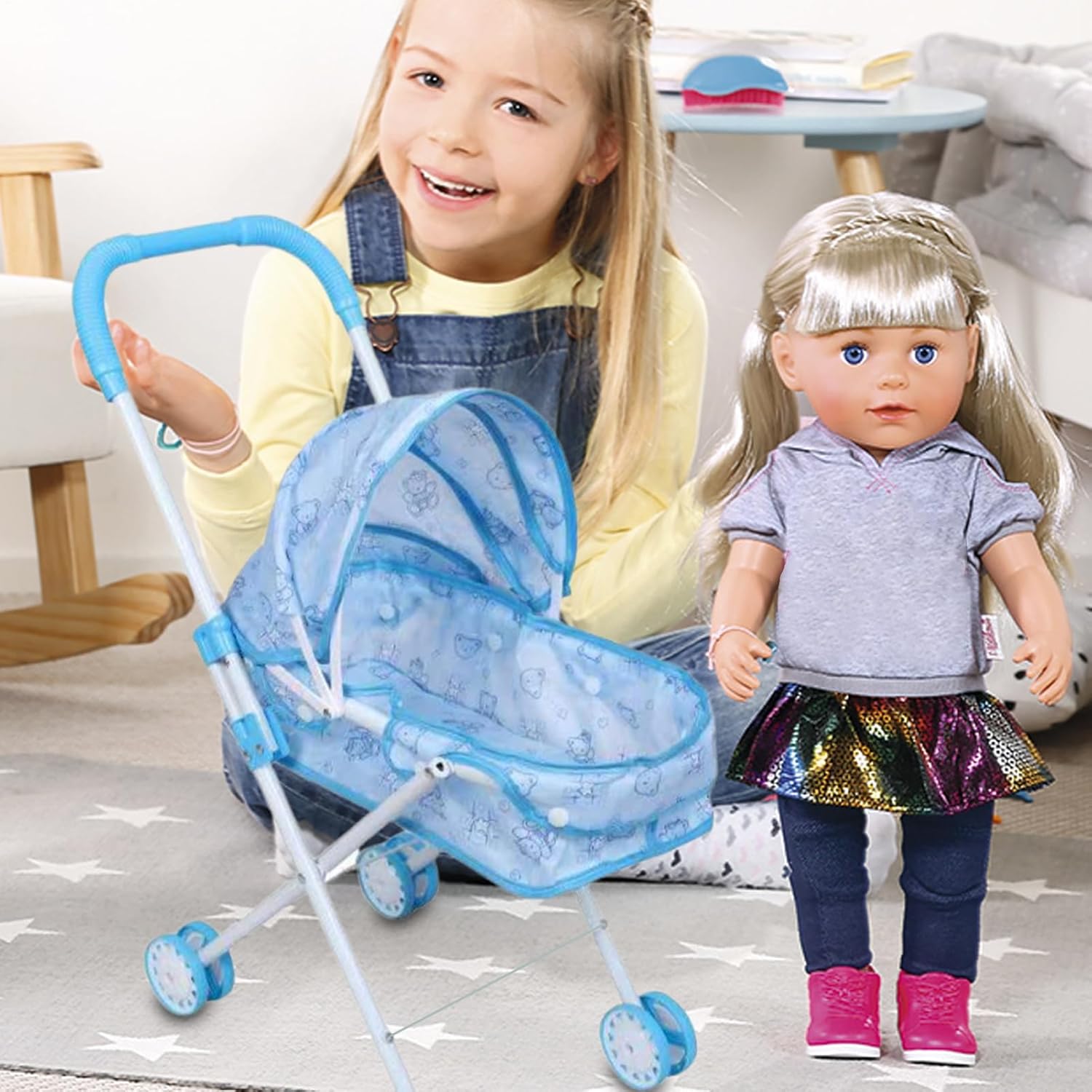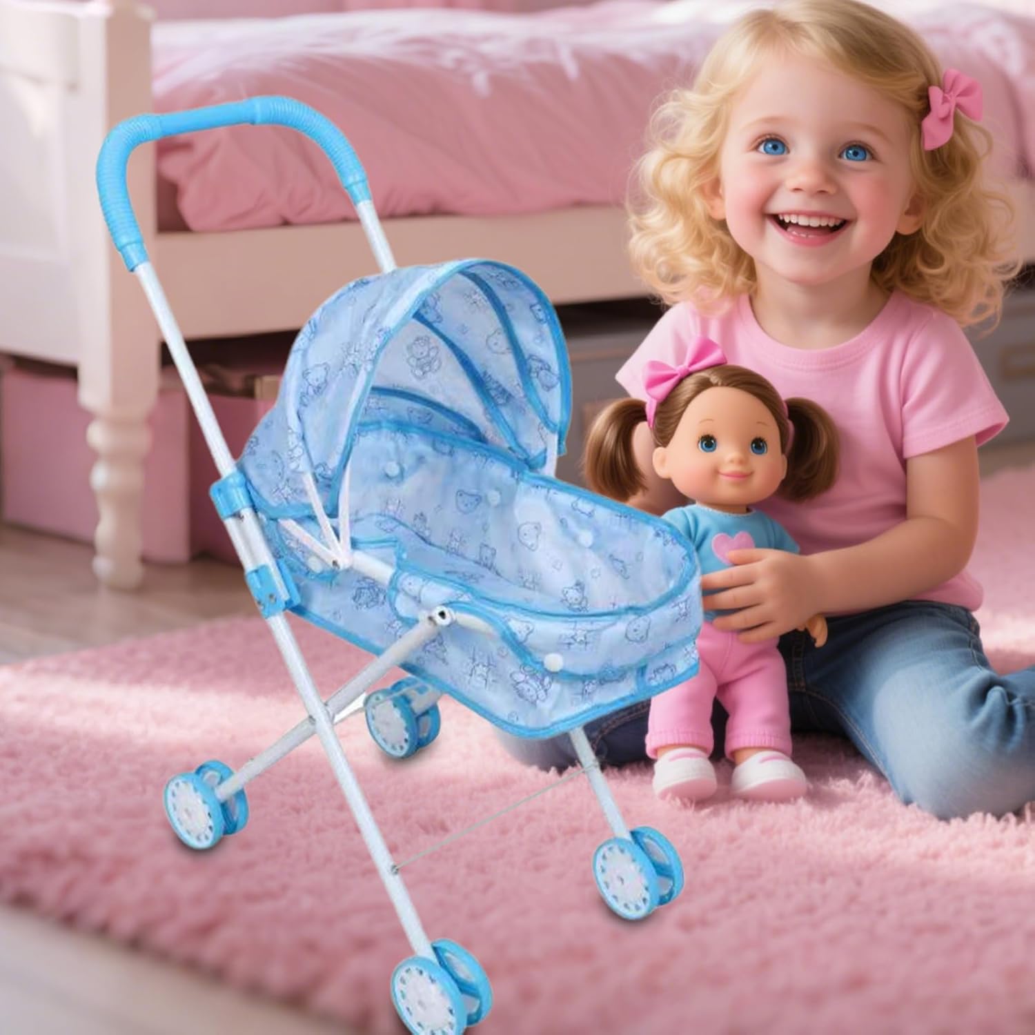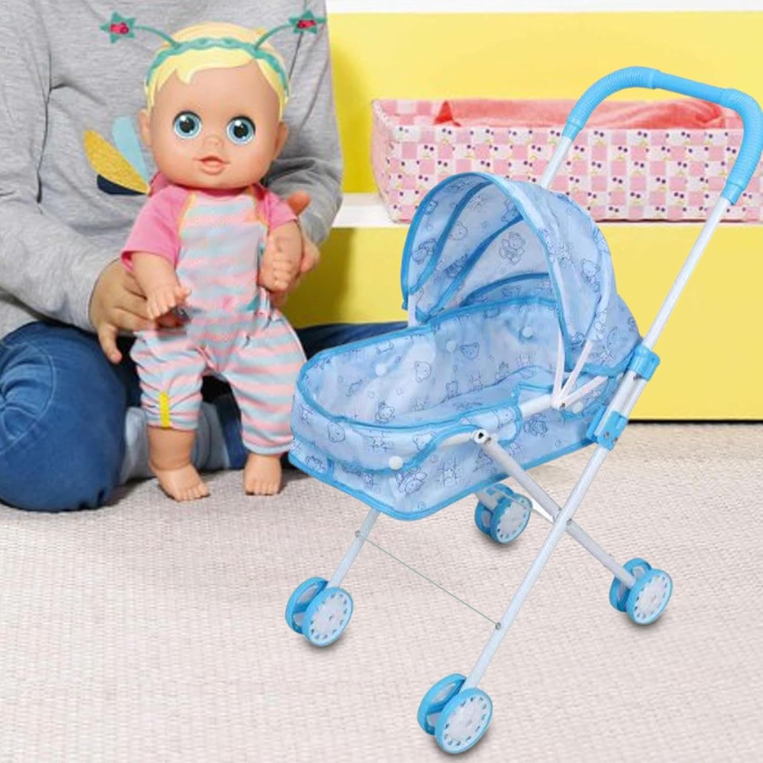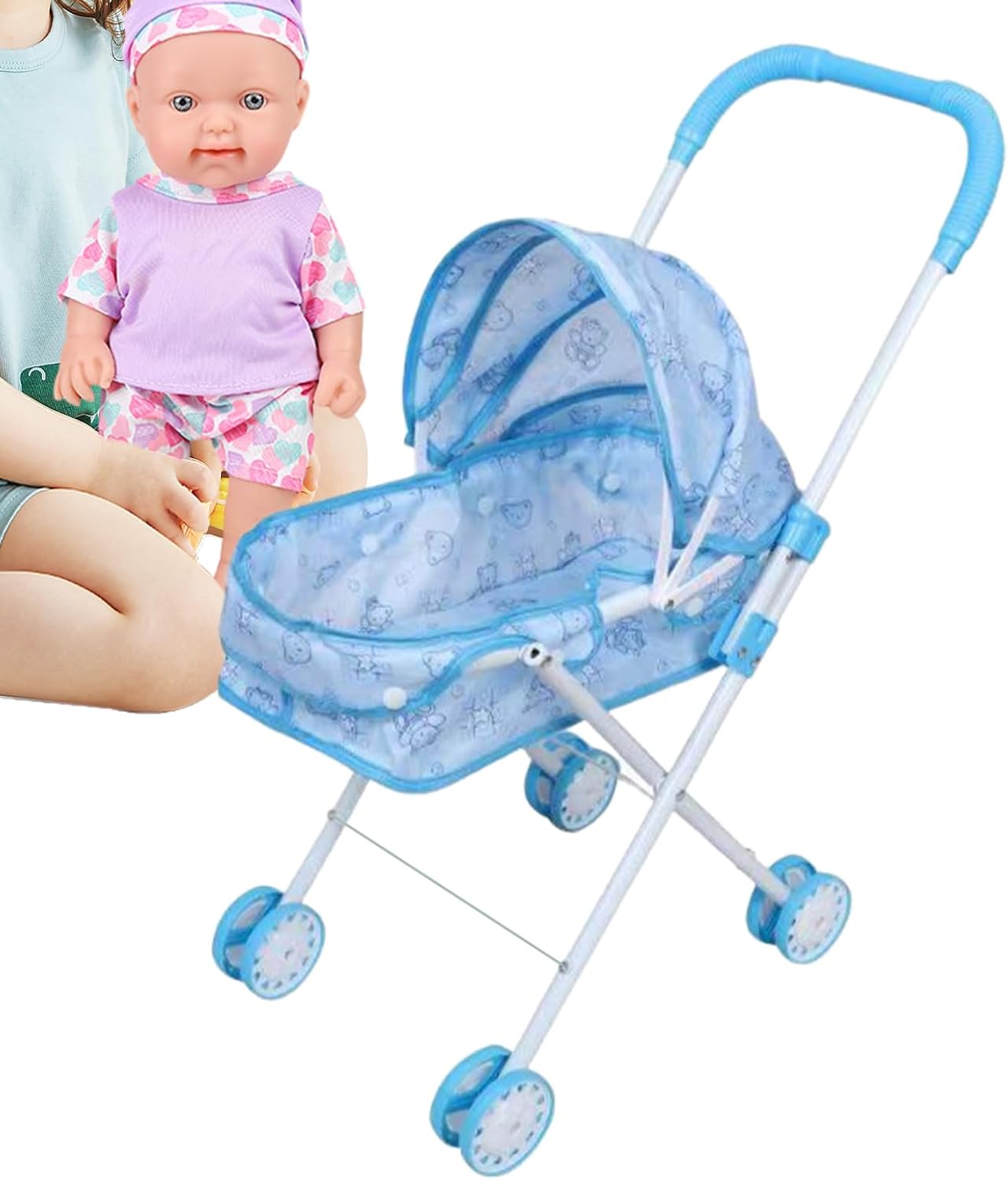 Durabilità assicurata: il passeggino per bambole è dotato di una struttura robusta realizzata in robusto PP e metallo che resiste alla flessione o alla deformazione, garantendo sicurezza a lungo termine per un uso prolungato durante allenamenti di gioco al chiuso o all'aperto, migliorando l'esperienza di gioco di ruolo fantasiosa dei bambini e fornendo tranquillità ai genitori. Leggero e portatile: progettato con una funzionalità pieghevole, il passeggino per bambole fornisce una soluzione organizzata che semplifica lo stoccaggio e il trasporto; la sua capacità di adattarsi al bagagliaio e agli armadietti dell'auto garantisce facilità d'uso durante i viaggi con la famiglia o a casa. Simulazione del ruolo di accudimento: progettato per coltivare l'empatia e la cura, il passeggino per bambole consente ai bambini di simulare compiti di accudimento, migliorando la loro comprensione della responsabilità e della compassione all'interno degli ambienti di gioco quotidiani, come giochi al chiuso o riunioni all'aperto con altri bambini. Ampiamente usato: il passeggino giocattolo migliora le celebrazioni a tema, le attività in classe e il tempo di legame familiare offrendo una soluzione di gioco versatile ideale per riunioni di compleanno e feste per bambini, creando gioiose ricordi e incoraggia l'esplorazione fantasiosa in varie ambientazioni Eccellente regalo: il passeggino giocattolo combina funzionalità e fascino, fungendo da regalo di vacanza per i bambini che non solo intrattiene ma crea anche ricordi duraturi, rendendolo la migliore aggiunta a qualsiasi occasione celebrativa