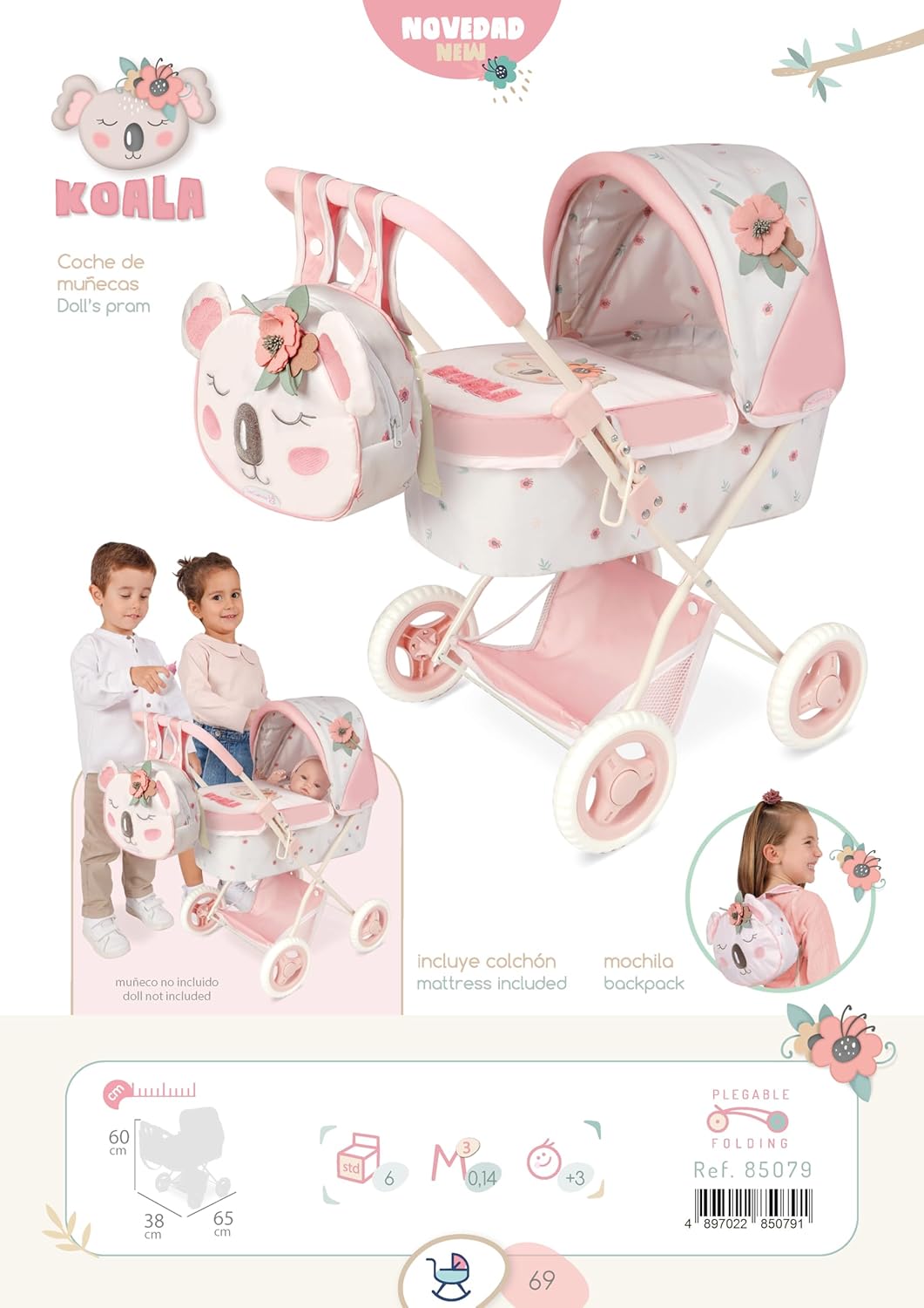 Passeggino per bambini con disegno speciale Koala con zaino abbinato. Carrello con struttura pieghevole. Il passeggino è alto 60 cm, largo 38 cm e lungo 65 cm. Include materasso speciale per la bambola Bebè. Ruote silenziose in schiuma.