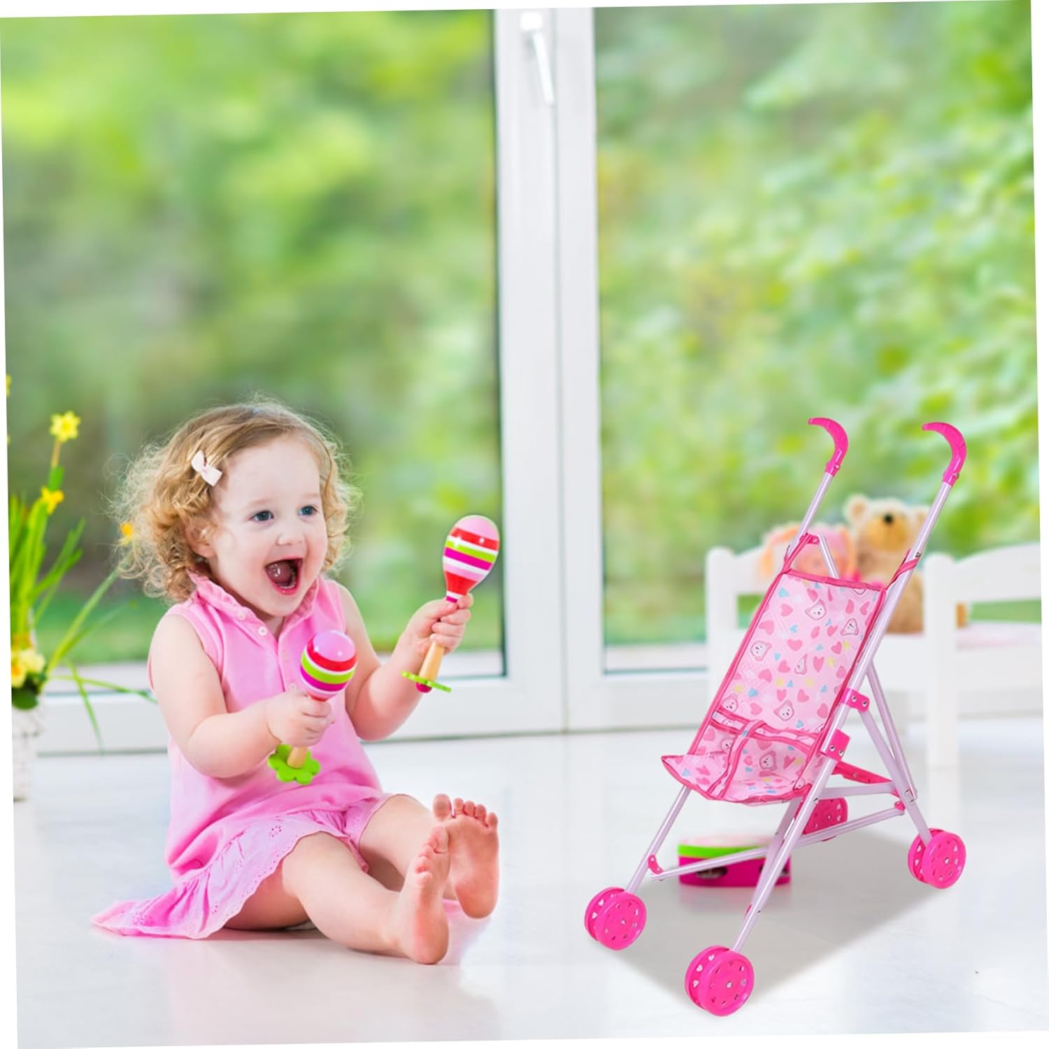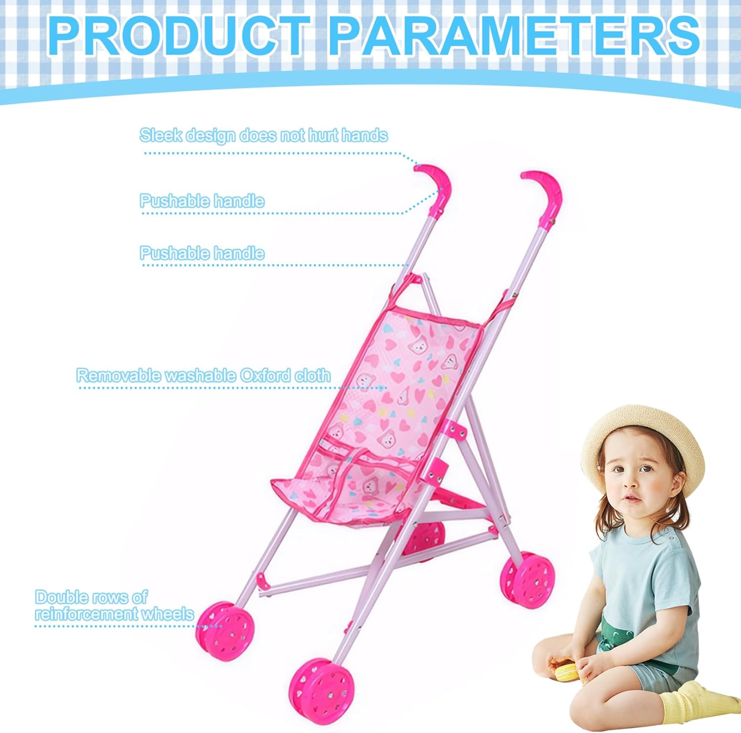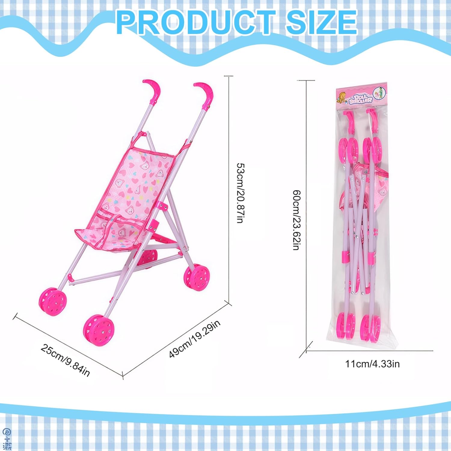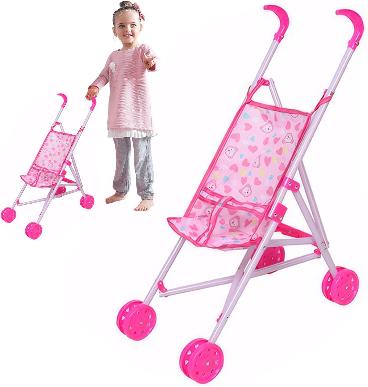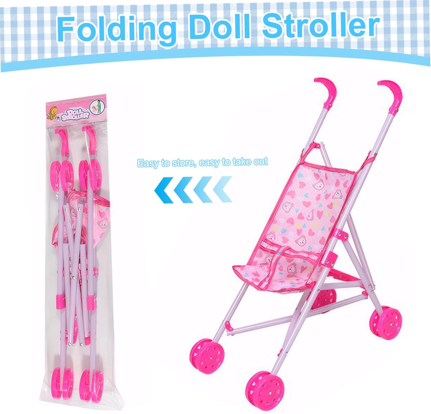 Piegabile per una facile memoria: una delle caratteristiche straordinarie di questo passeggino per bambole è il suo design pieghevole..Ciò consente una facile conservazione quando non è in uso, risparmiando spazio prezioso in casa. Frame robusto: il passeggino della bambola per bambini dispone di una cornice robusta che è abbastanza forte da resistere al gioco energico del tuo piccolo..Questo telaio di lunga durata garantisce la durata e l'uso esteso, permettendo ai bambini di godersi il loro giocattolo per molto tempo..Inoltre, il passeggino è dotato di una maniglia confortevole, perfettamente dimensionata per piccole mani, garantendo una presa sicura e una maneggevolezza. Sede morbido e sicuro con cintura di sicurezza: dotato di un sedile morbido e sicuro e cintura di sicurezza, il passeggino della bambola Sicurezza completa proprio come un vero passeggino per bambini..Le doppie ruote su tutte le gambe forniscono una maggiore stabilità e sicurezza, rendendo facile il controllo..Il panno in tessuto con stampa cartoni animati è staccabile, rendendo facile da pulire e mantenere. Design adorabile e realistico: il passeggino delle bambole per bambini vanta un design adorabile e realistico che imita un vero passeggino..Questa caratteristica promuove la creatività e le abilità sociali nei bambini, incoraggiando il gioco di ruolo e coltivando la loro capacità di sviluppare compassione. Dimensioni perfette per le bambole: misura 9.84x19.29x20.87 pollici, questo passeggino giocattolo è la dimensione ideale per trasportare bambole e animali ripieni..Questa dimensione perfetta garantisce che tuo figlio possa portare con sé il loro compagno preferito ovunque vadano, aggiungendo al divertimento e all'eccitazione del loro tempo di gioco.