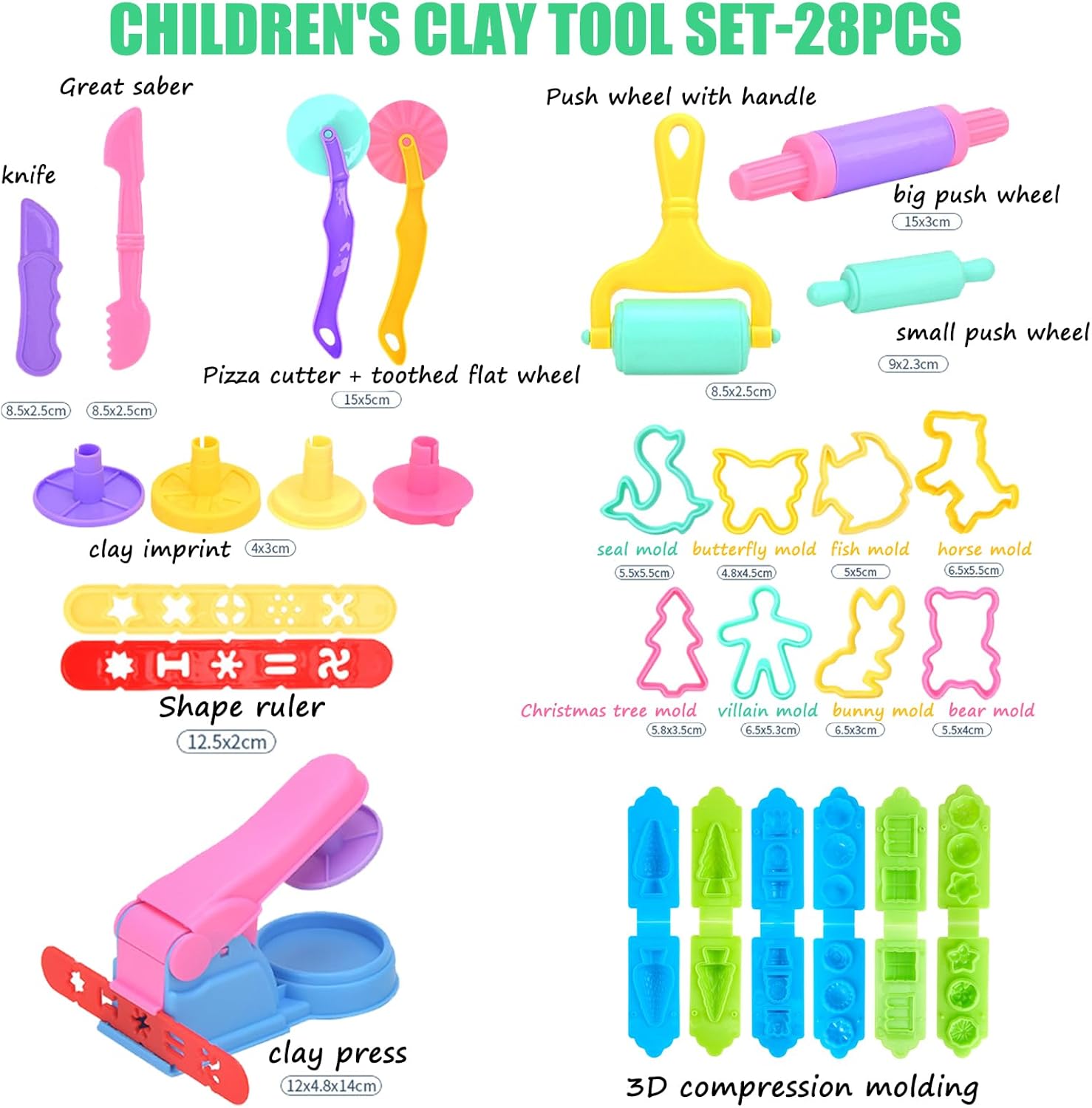 **Qualità Premium:** Questi accessori premium per plastilina offrono una durata eccezionale. La varietà è colorata e stimola continuamente l'immaginazione e la creatività dei bambini. **Design adatto ai bambini:** Gli strumenti in argilla sono dai colori vivaci, perfettamente dimensionati per le mani dei più piccoli. Si modella facilmente in qualsiasi forma. Coltivare l'abilità pratica dei bambini. Impara ed esplora nei giochi. **Varietà di accessori:** Questo kit comprende 28 accessori diversi come rulli e utensili da taglio, offrendo ai bambini l'opportunità di dare libero sfogo alla propria immaginazione e creare capolavori unici. **Facile da pulire:** Gli accessori sono progettati per essere facili da pulire, consentendo ai genitori di mantenere lo spazio di gioco pulito e ordinato dopo che i bambini hanno finito di giocare. **Gioco educativo:** Incoraggiando la creatività e le capacità motorie, questi accessori per plastiline aiutano i bambini a sviluppare le loro abilità divertendosi. Regala a tuo figlio il regalo perfetto per ore di gioco gratificante!