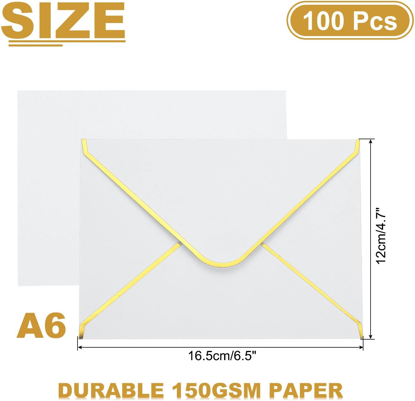 Materiale Carta Resistente 150gsm: Le nostre buste 4x6 hanno una superficie liscia e un colore vivace per attirare l'attenzione e aggiungere eleganza, sono anche più spesse, robuste e resistenti. Riceverai 100 pezzi di buste per diversi usi, come inviti o spedizioni. BORDO DORATO DI LUSSO - Il bordo in foglia d'oro sulle nostre buste è davvero qualcosa di cui parlare. Il design con aletta a V aggiunge un tocco di fascino e sofisticatezza a ogni evento, facendo risaltare i tuoi inviti. Che tu stia inviando inviti di nozze o corrispondenza aziendale, queste buste lasceranno un'impressione duratura. Sigillatura Forte: Il bordo è progettato con aletta gommata. Aggiungi un po' d'acqua al bordo gommato, premi per qualche secondo, e le buste saranno perfettamente sigillate per proteggere la tua privacy. Progetti Fai Da Te: Scegli il motivo che preferisci, stampalo sulla busta con una stampante, o decorala con fiori secchi, adesivi e francobolli per personalizzare una busta unica e originale. Applicazione: Aspetto elegante e di buona qualità, le nostre buste si distinguono. Ampiamente utilizzate per biglietti di auguri, inviti di nozze, inviti per feste di compleanno, laurea, cartoline, foto, lettere, spedizioni, ecc. Ideali per esprimere ringraziamenti o inviti a feste, come Natale, Ringraziamento e altre festività.