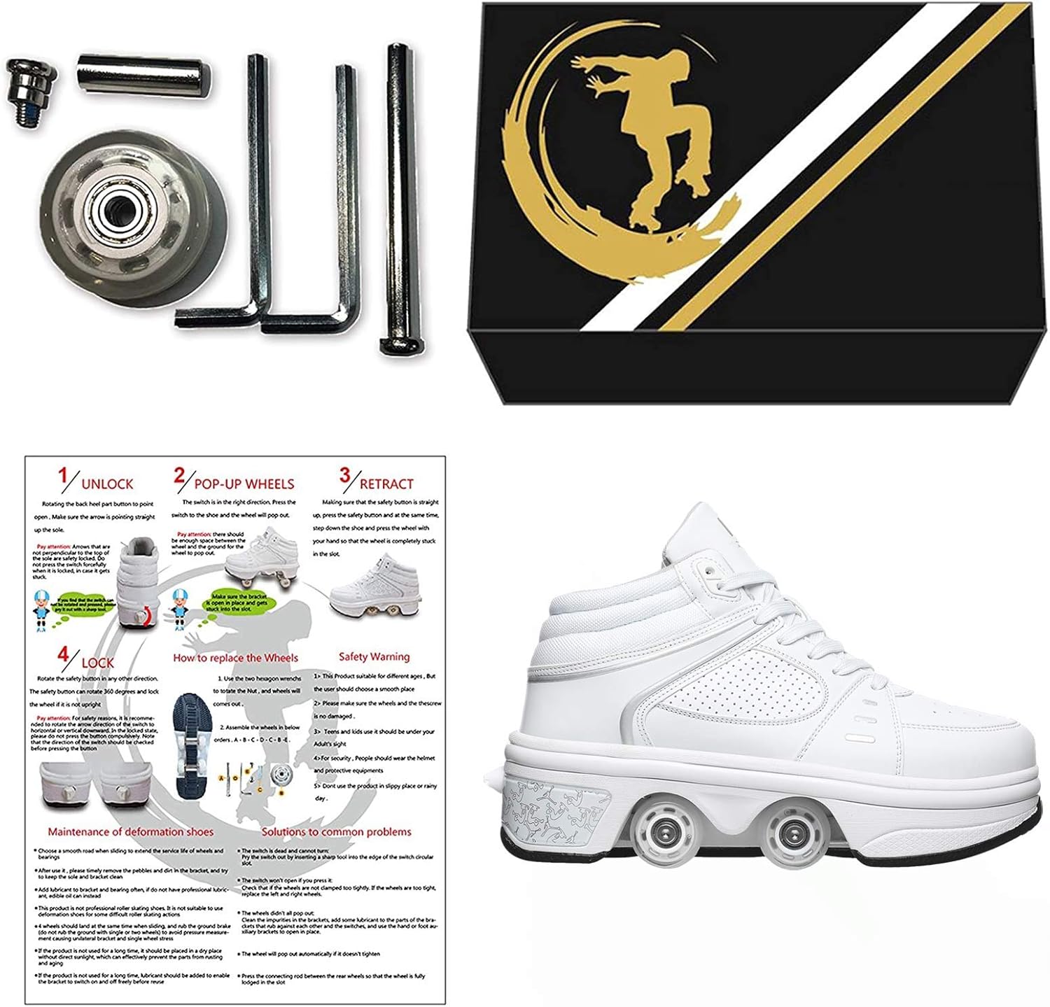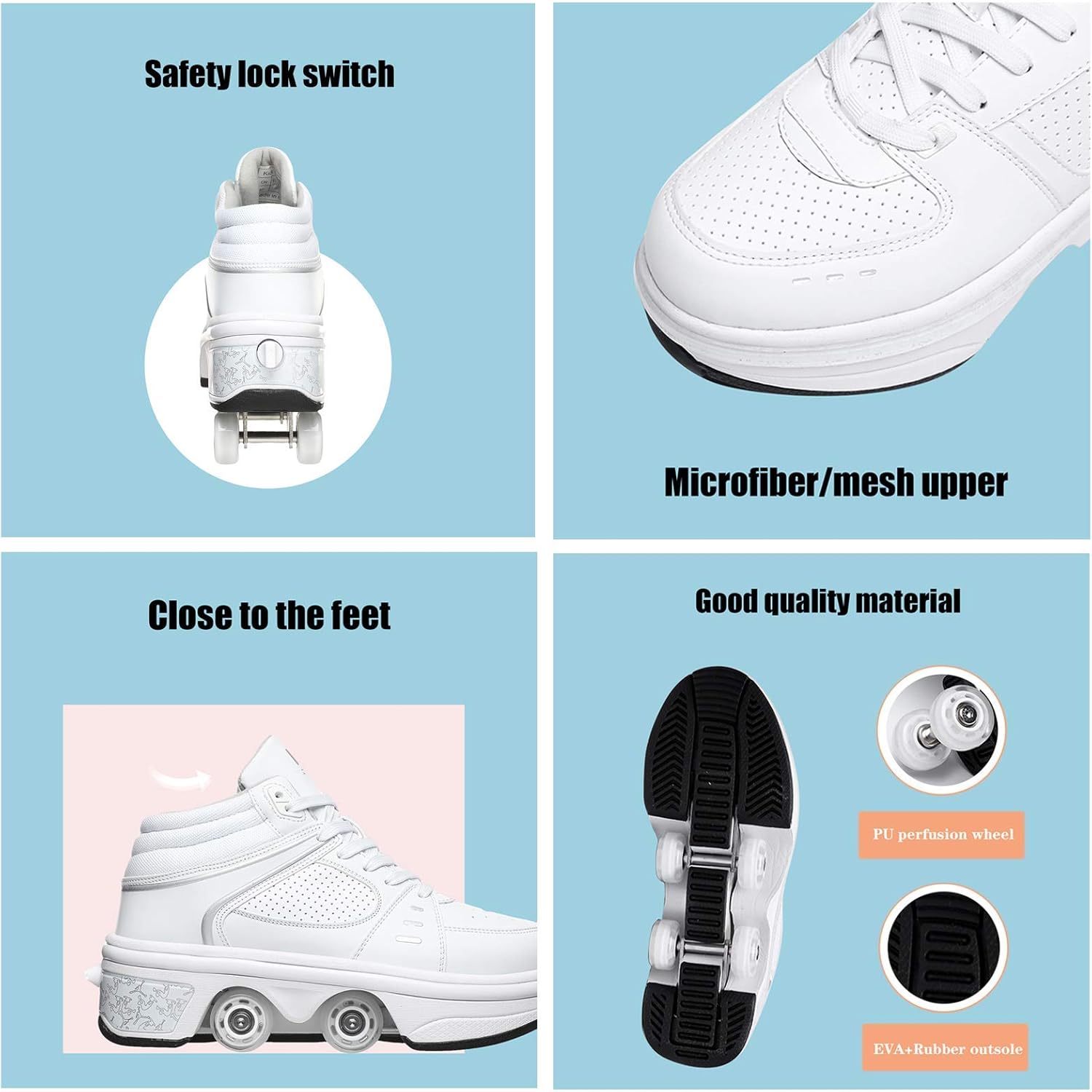 ★★★ Materiali di alta qualità: I pattini a rotelle regolabili multifunzionali sono realizzati in microfibra, suola in gomma e ruota in pu.Non dobbiamo solo prestare attenzione alla capacità portante della ruota, ma anche prestare attenzione alla selezione del materiale della tomaia per produrre pattini a rotelle di alta qualità, comodi e traspiranti sono la nostra garanzia. ★★★ Modalità colorata: Puoi goderti vari colori (totale 7 colori) luce led, cammini sulla strada, le scarpe si accendono. C'è un pulsante sul retro della scarpa, premilo e la ruota si aprirà. Premi e tieni premuto il pulsante per spingere il rullo nella piastra inferiore e rilasciarlo. ★★★ Test meccanico: I pattini a rotelle sono stati testati e rielaborati. A seconda del design meccanico, il supporto del tallone fornisce uno smorzamento aggiuntivo e un elevato fattore di sicurezza, rendendolo ideale per i principianti. ★★★ Pattini a rotelle quadrupli 2-In-1: i pattini multiuso regolabili sono diversi dai pattini a rotelle tradizionali sul mercato. Le ruote nascoste possono essere nascoste come normali scarpe da ginnastica, puoi aggiungere queste scarpe uniche alla squadra di volo del tuo amico! ★★★ Regali speciali: I pattini a rotelle multifunzionali sono adatti per amici di tutte le età e sport unisex, puoi giocare con i tuoi amici o bambini nei fine settimana.