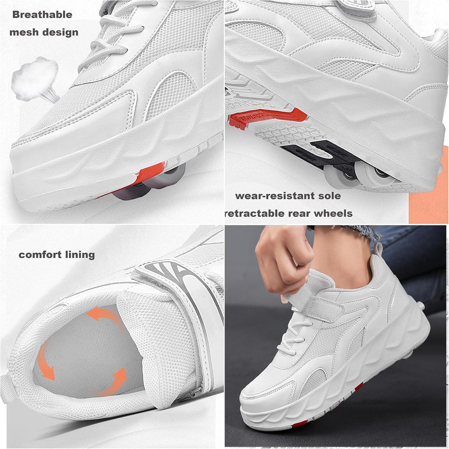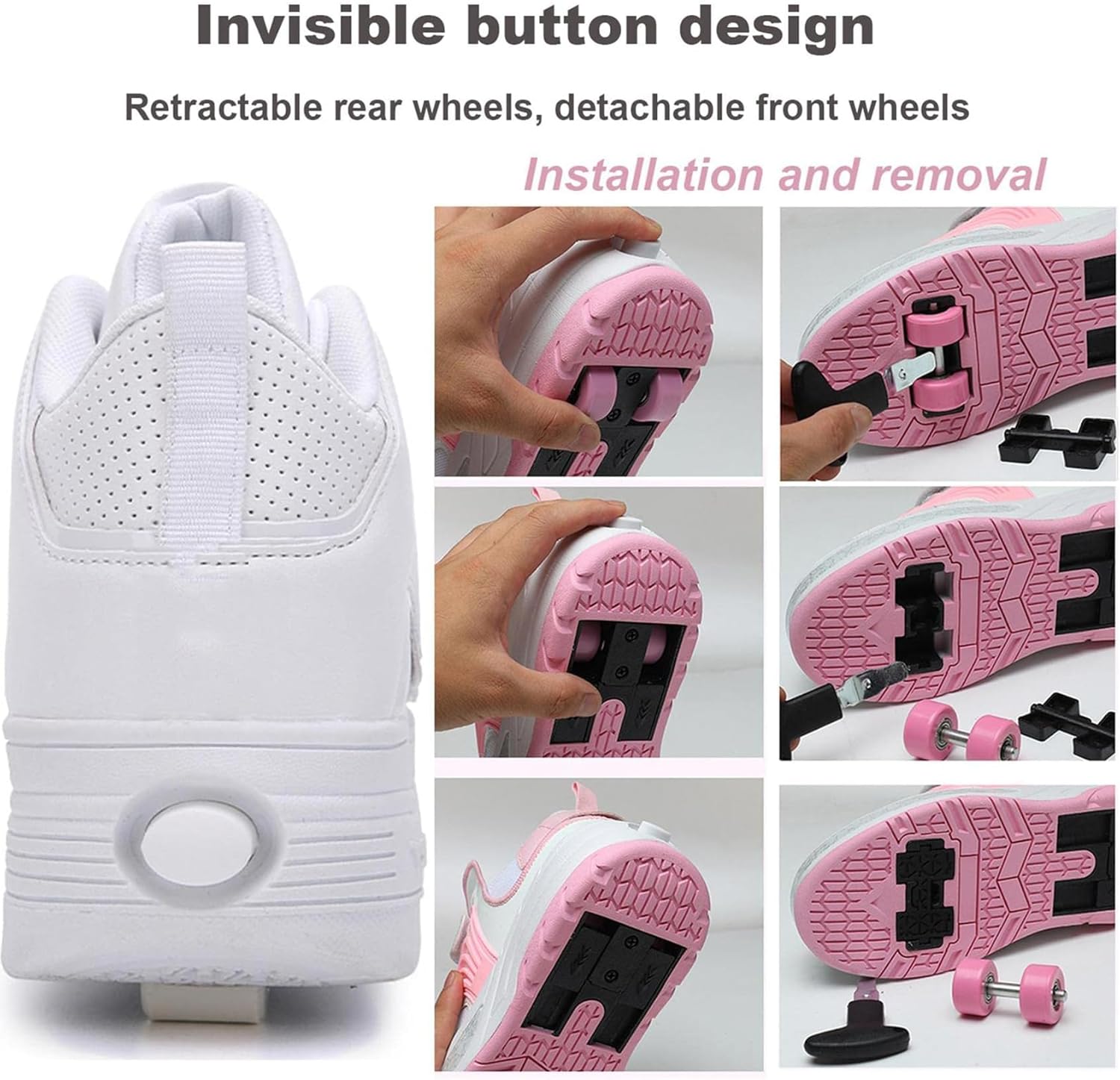 【Scarpe 2 in 1】 I pattini a rotelle non sono solo un paio di pattini a rotelle, ma anche un paio di scarpe da ginnastica le cui ruote sono nascoste nella suola. Materiali durevoli: i pattini regolabili multifunzionali sono realizzati con suole in gomma e ruote in PU. La nostra tomaia/suola è realizzata in materiale resistente all'usura, le ruote hanno un'ottima capacità di carico, comfort, traspirabilità e durata sono le nostre caratteristiche. Buon equilibrio, facile da controllare, baricentro, sicuro da usare. 【Scarpe sportive multifunzionali】 Ha anche molte funzioni come escursionismo, pattinaggio a rotelle, sport, ecc. Ruota posteriore retrattile, scorrevole sempre e ovunque. Regalo novità: questi pattini a rotelle sono belli ed eleganti, adatti per gli sport all'aria aperta. Sono facili da imparare e sono il regalo ideale per i compleanni dei bambini e per Natale. Suggerimento: selezione della taglia: per garantire una vestibilità comoda, scegliere la taglia corretta in base alla "lunghezza interna (lunghezza del piede)" nella tabella delle taglie. Le nostre scarpe sono adatte a bambini, ragazzi, ragazze e adolescenti.