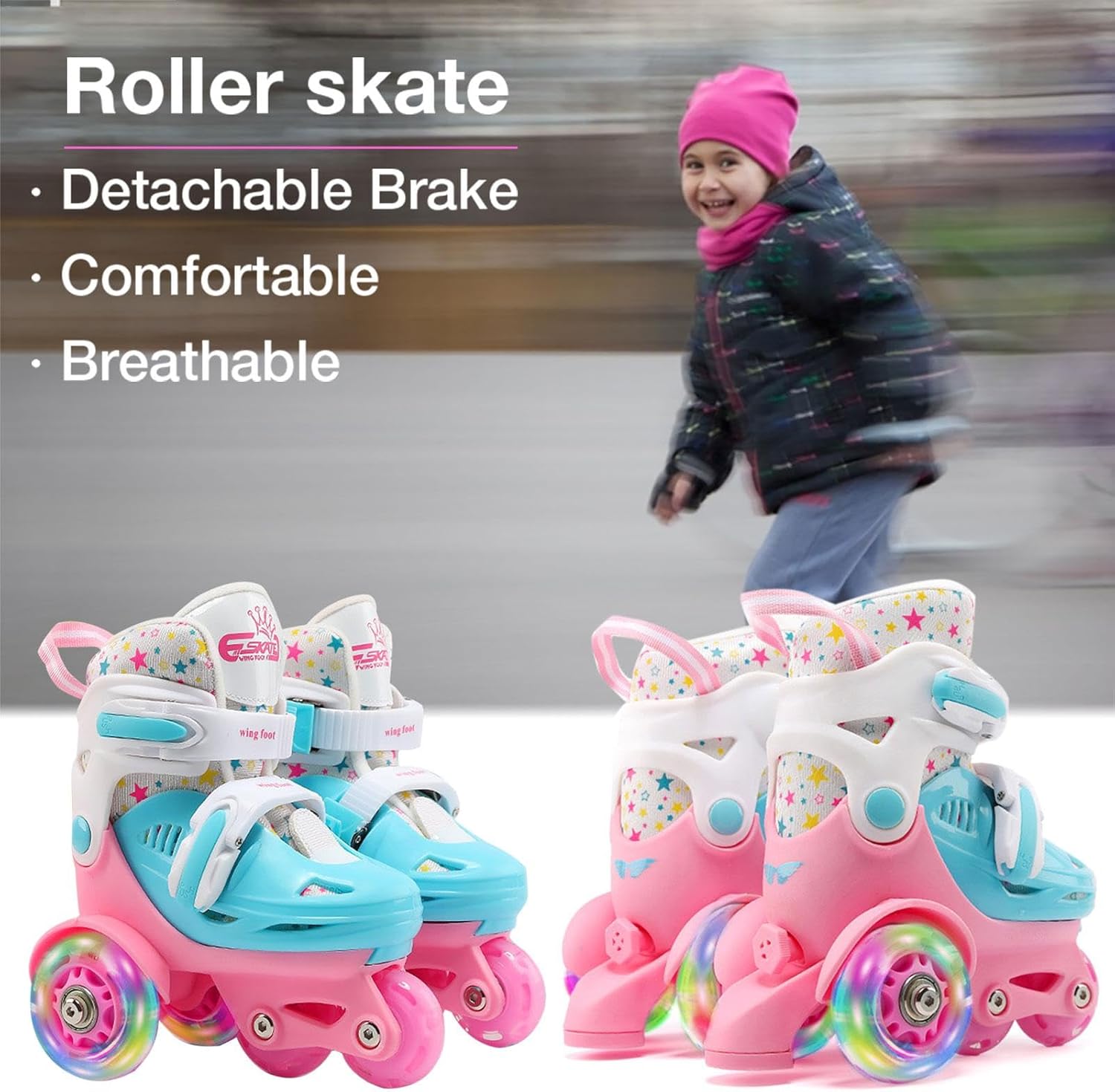 Facile da modificare Dimensioni Pattini a rotelle per ragazze Le scarpe da pattinaggio a rotelle sono pattini a rotelle in linea regolabili, controlla la nostra tabella delle taglie per vedere i pattini a rotelle adatti per i piedi del tuo bambino, adottano un design di dimensioni regolabili, più adatti per bambini in crescita, adatti per bambini di età compresa tra 2 e 8 anni. Maggiore comfort di utilizzo Utilizzando cuscinetti silenziosi ABEC-7 in acciaio cromato per godere di una guida sicura, fluida e silenziosa su un telaio in alluminio rinforzato, il pattino a rotelle per bambini è comodo e sicuro, con un morbido e confortevole, traspirante e interno. I pattini a rotelle regolabili multiuso consentono ai bambini di godersi il divertimento dello sport e aiutarli a esercitare articolazioni e muscoli forti, i bambini che si esercitano regolarmente hanno un sonno migliore e un'immunità più forte e hanno molte funzioni. I pattini a rotelle per esterni sono dotati di un freno a doppia scarpa in PVC, sicuro e con un alto fattore di sicurezza di frenata per ottenere una migliore usura e una velocità moderata, tra cui un sistema di fibbia di sicurezza a serraggio rapido e ruote ausiliarie a fila per garantire la sicurezza dei bambini. Regalo ideale adatto per compleanni, Natale, Ringraziamento e altri giorni speciali, i pattini a rotelle per ragazze sono dotati di un cuscinetto spesso per proteggere le dita dei piedi sulla parte esterna della testa dello stivale, il regalo migliore e più premuroso per i bambini.