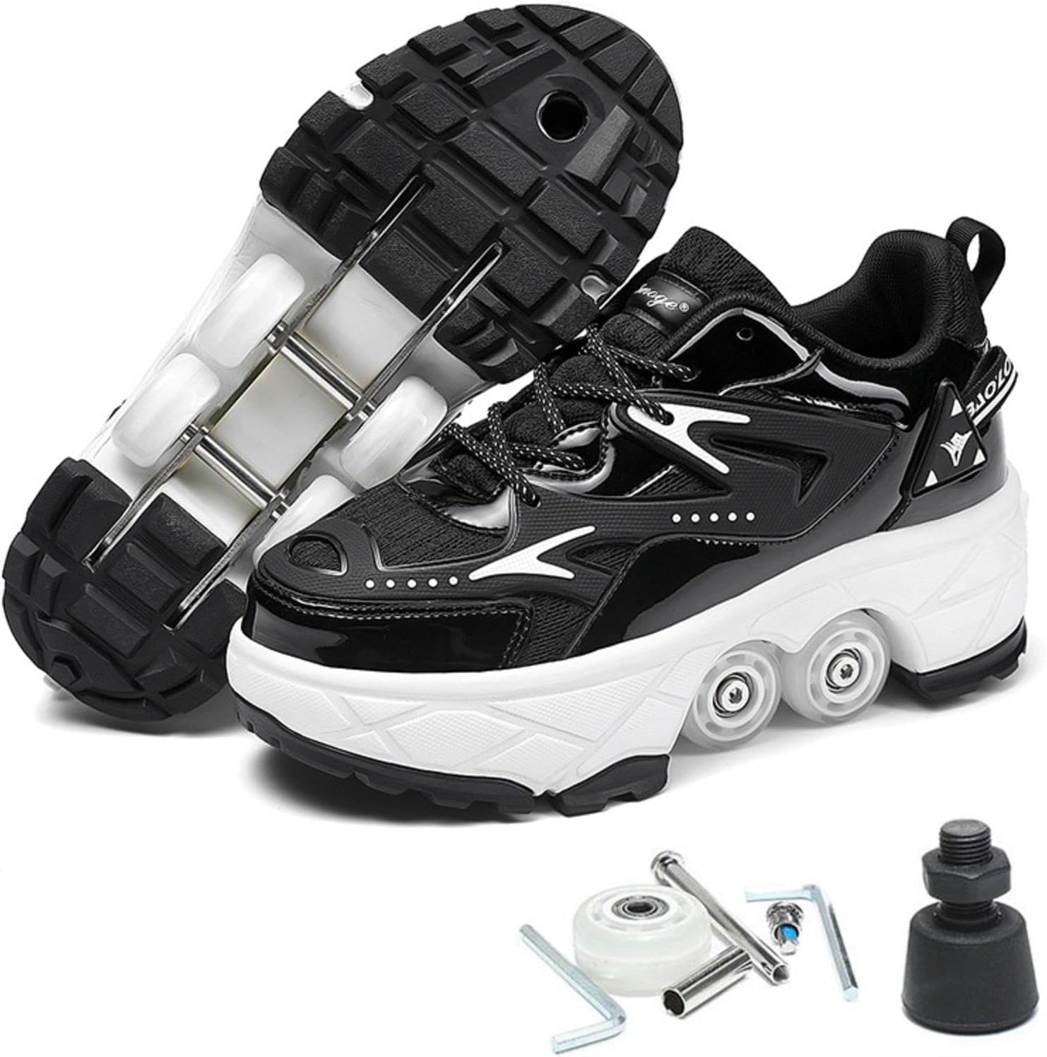 I pattini a rotelle sono realizzati in microfibra, la suola è in gomma e le ruote sono in PU Suola confortevole e traspirante, resistente all'usura, buona elasticità Pattini a rotelle 2 in 1, questa scarpa è diversa dai normali pattini a rotelle sul mercato. Non solo può essere utilizzato per il pattinaggio a rotelle, ma può anche essere calpestato. Forte freno anteriore, molto stabile e facile da imparare , Puoi sollevare e nascondere il rullo con un pulsante sul tallone. Usa i lacci tradizionali, puoi regolare i lacci per scegliere la sensazione più comoda. I pattini a rotelle regolabili multifunzionali sono adatti ad amici di tutte le età , Adatto a varie occasioni: viaggi di vacanza, all'aperto, uscire da un ospite, Campus Study.