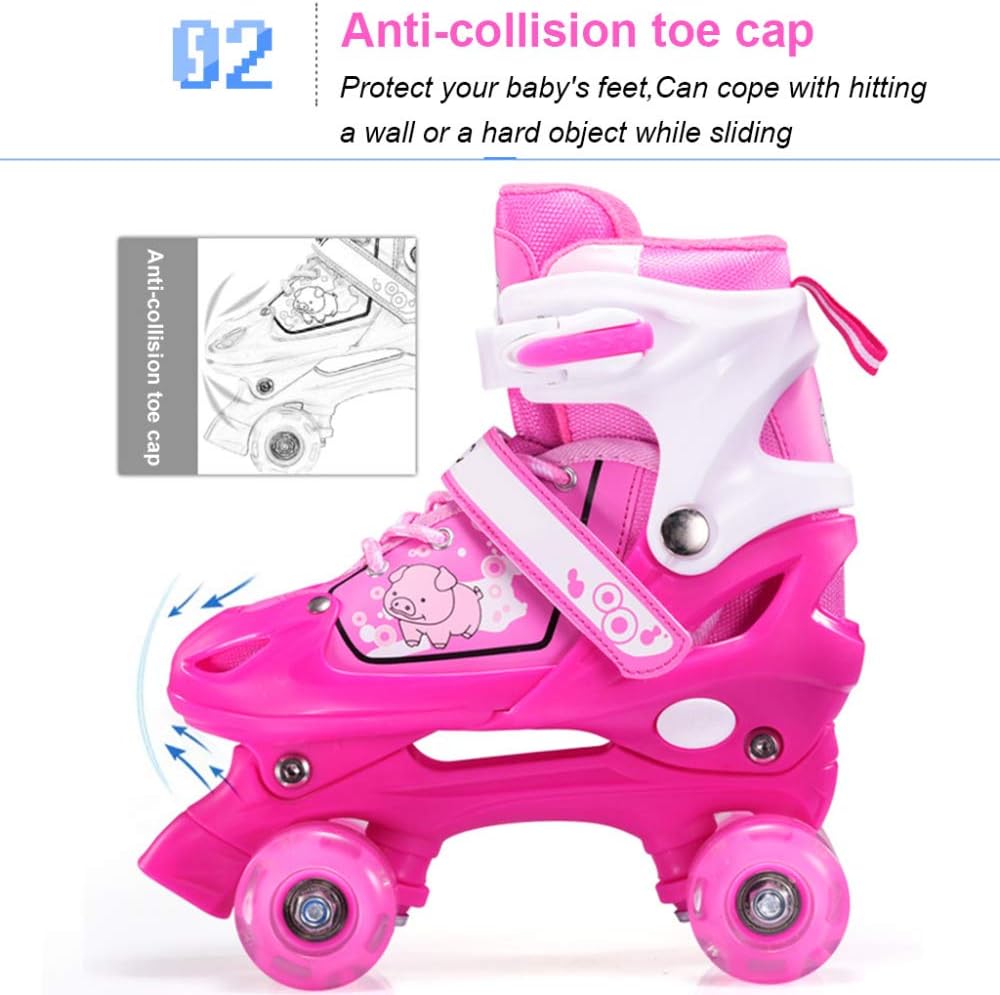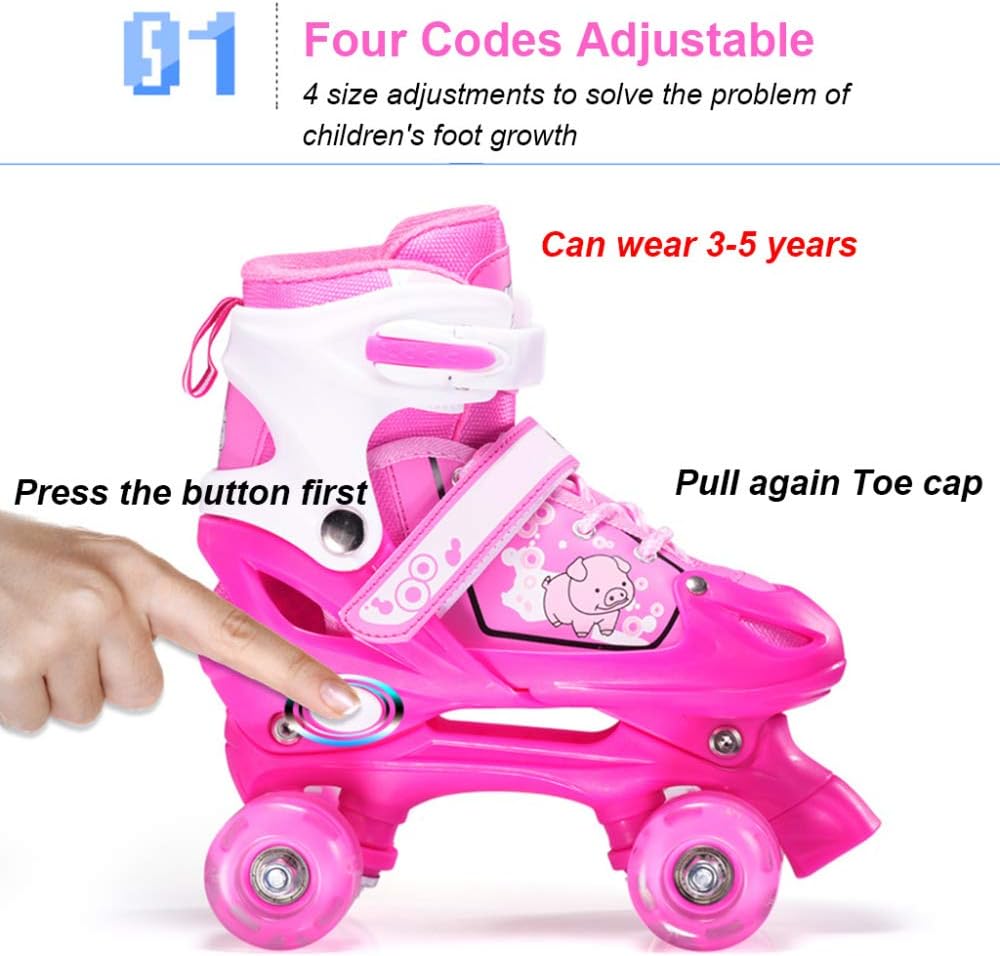● Pattini a rotelle quad: sono pattini a rotelle in stile classico, pattini a rotelle a doppia fila realizzati con ruote in PVC e rotolamento semplice. Ciò riduce efficacemente gli urti e ottiene buone prestazioni stabili. ● Puntale anti-collisione: il puntale anti-collisione può essere utilizzato per proteggere i piedi del bambino quando colpisce un muro o un oggetto duro durante lo scivolamento. ● Regolabile a tre codici: può essere indossato per 3-5 anni, regolabile in qualsiasi momento per risolvere il problema della crescita del piede. ● Tre taglie: codice S (26-33), lunghezza scarpa 18-21,5 cm, codice M (33-37), lunghezza scarpa 21,5-24,5 cm, codice L (37-42), lunghezza scarpa 24,5-27 cm. ● Freno a due gambe: scarpe da skate a doppia fila. Entrambi hanno i freni. Mantieni il tuo bambino più sicuro e più stabile.