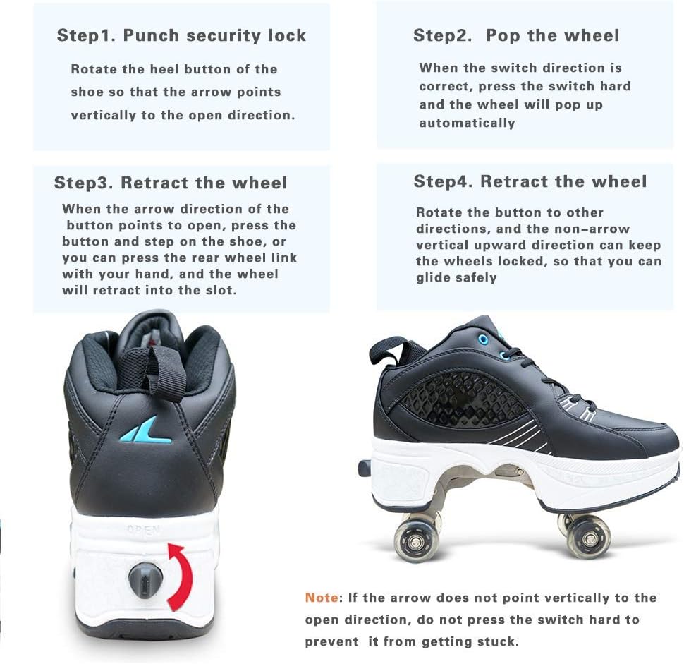 Comfort: il design del materiale Hsinchu interno rende le scarpe più comode da indossare e protegge i tuoi piedi. Tempo libero: apri il pulsante sul retro della scarpa, premi e apri la ruota, oppure premi il pulsante per premere la ruota nel terreno, quindi rilasciala per diventare una scarpa da corsa. Materiale: tessuto traspirante, deodorante, ruote regolabili, impermeabile. Regali creativi: ruote luminose, adatte per pattinaggio, festa, discoteca, danza, compleanno, Natale. Taglia: scegli la taglia appropriata in base alla tabella delle taglie.