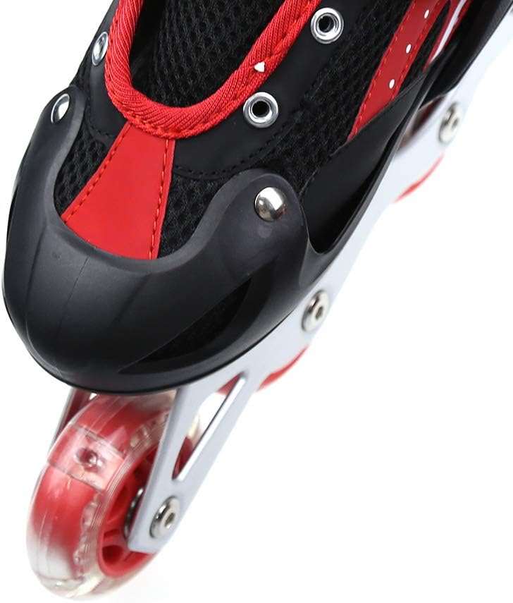【Pattini a rotelle traspiranti】La tomaia di questo paio di pattini a rotelle per bambini è composta da un materiale semi-morbido e traspirante e una rete sandwich, che può impedire ai piedi del bambino di sudare e mantenerlo traspirante. 【Ruote luminose】8 cuscinetti a ruote allineate permettono al bambino di scivolare liberamente come il vento. Allo stesso tempo, la ruota anteriore brilla, che è più evidente di notte. Ruota singola in PVC, senza elasticità. 【Dimensioni regolabili】C'è un pulsante sul supporto. Tienilo mentre tira o stringi la scarpa per regolare la taglia. Le S/M corrispondono rispettivamente alle taglie 31-34 e 35-38. Questo dipende principalmente dalle dimensioni del bambino e il bambino crescerà molto rapidamente, si prega di controllare la tabella delle taglie prima dell'acquisto. 【Alta Sicurezza】Il supporto in lega di alluminio ad alta resistenza in due parti e il freno sensibile garantiscono la morbidezza e la sicurezza dei pattini in linea. Protezione della caviglia: l'imbottitura interna è super imbottita con una protezione aggiuntiva intorno alla parte superiore della scarpa per pattini che protegge le caviglie dei bambini.