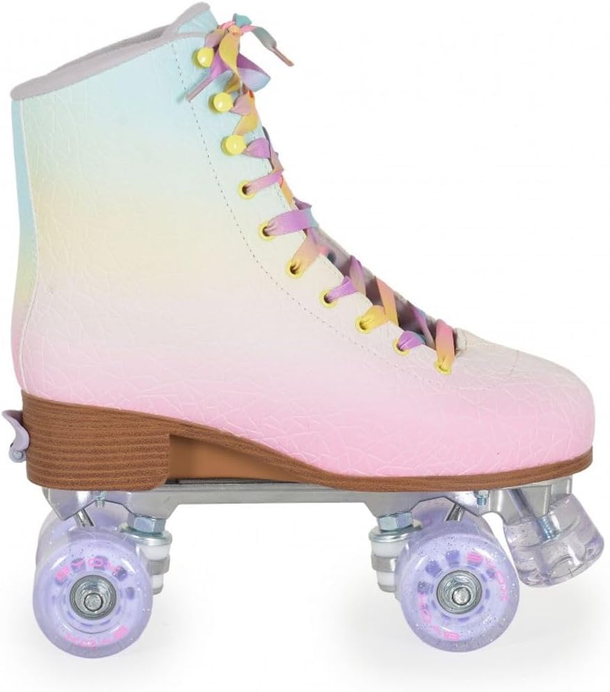 Pattini a rotelle a partire da 5 anni con borsa di trasporto Peso minimo: 20 kg Peso massimo: 60 kg pattini regolabili con ruote glitterate, broccato trasparente in PU taglia S scarpa 31 - 34, taglia M scarpa 35 - 38, taglia L scarpa 39 - 42 Dimensioni delle ruote 54 x 32 mm, cuscinetti a sfera ABEC-5, fissaggio con lacci nei colori dell'arcobaleno Base e supporti in alluminio, freni glitterati in broccato PU, cuscino in PU, tomaia in pelle arcobaleno PVC, adatto a principianti e pattinatori esperti