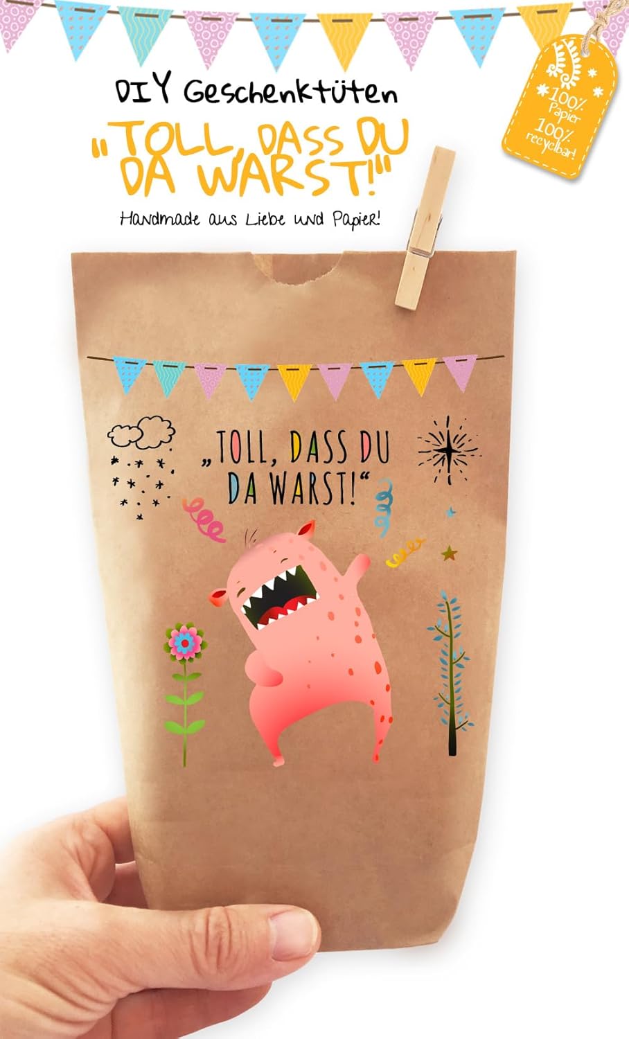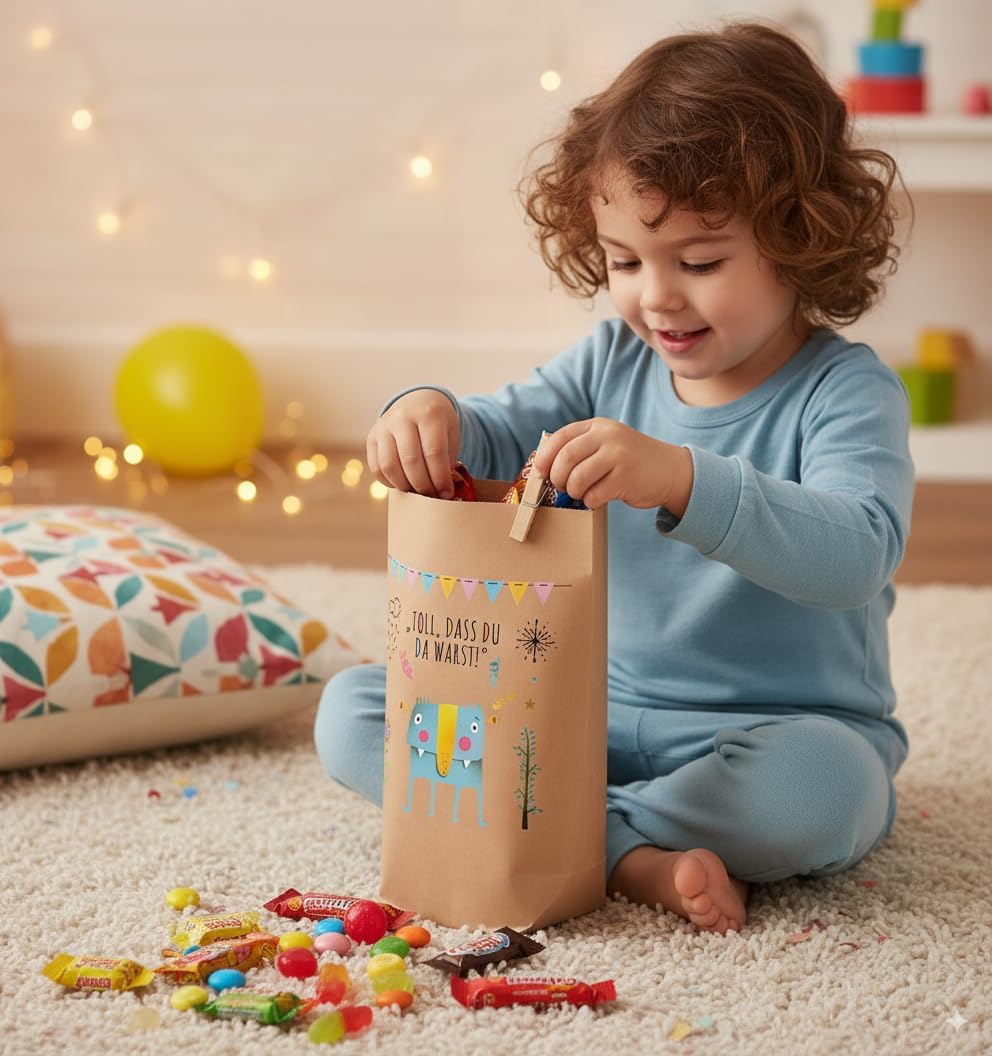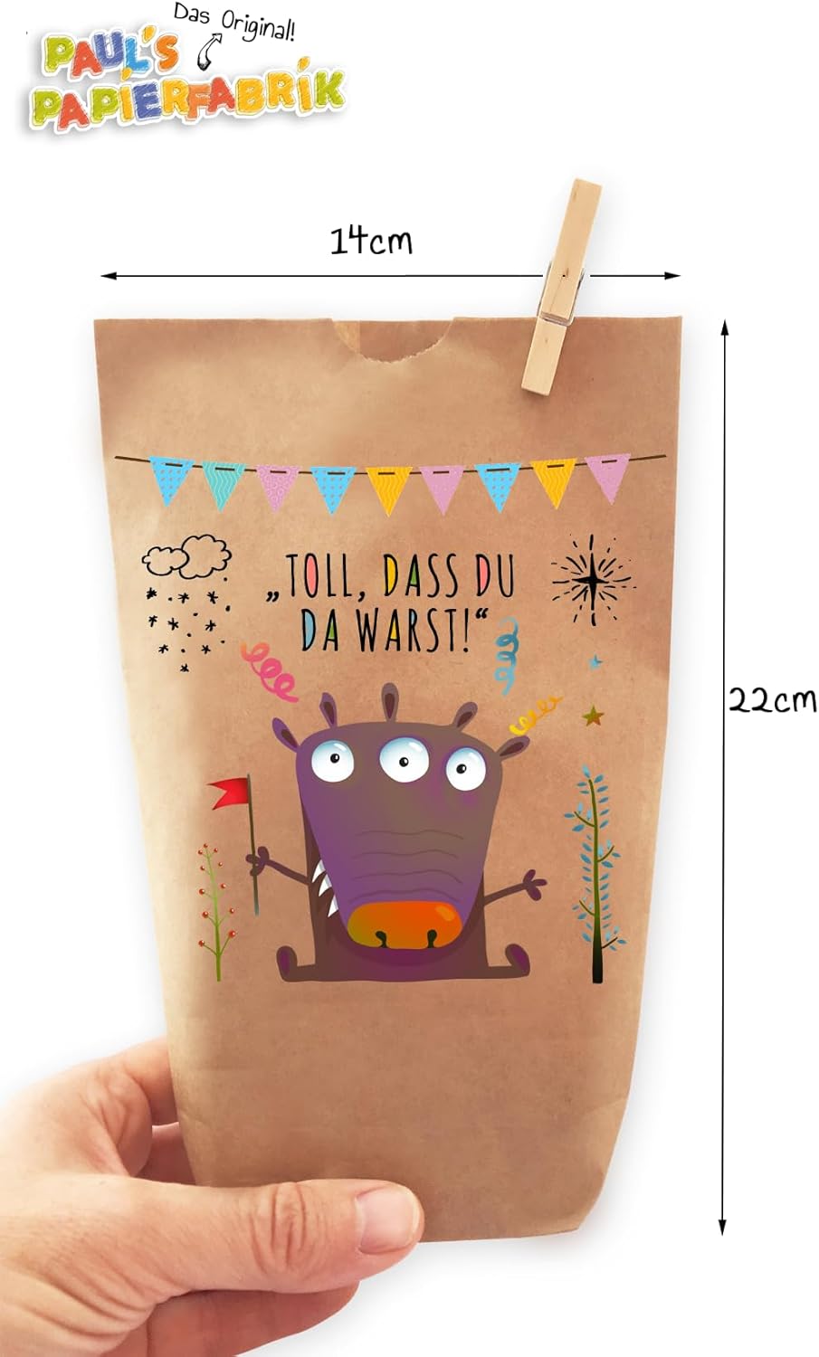 6 bellissimi sacchetti regalo "È fantastico che TU fossi lì!" ORIGINALE Prodotto in Germania, non in Cina! - stampata individualmente con amore, ogni borsa è un pezzo unico, comprese clip di legno, borse in carta kraft marrone naturale, dimensioni 14 x 22 cm - profondità della base ca. Sacchetti di carta Kraft da 5,4 cm per confezionare regali, per lavori manuali o per realizzare calendari dell'Avvento fai da te. Adatto per matrimoni, compleanni e tutte le altre celebrazioni. Paul's Papierfabrik sviluppa e progetta tutti i suoi prodotti in Germania. Realizzato con qualità eccezionale con amore e carta! Per amore, rispetto e preoccupazione per il nostro ambiente, non utilizziamo imballaggi in plastica: cartone o carta riciclabili al 100%! Clicca su PAUL'S PAPER FACTORY qui sopra e troverai molte altre bellissime borse della nostra cartiera.