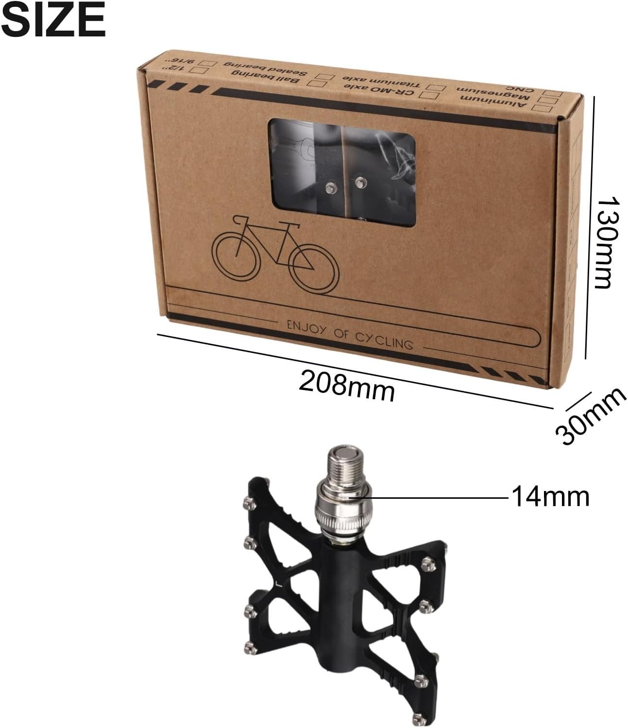 [Leggeri e funzionali] Con un peso di soli 94 x 114 mm, questi pedali sono leggeri ma robusti, il che li rende perfetti per biciclette pieghevoli, mountain bike e bici da strada. [Tecnologia dei cuscinetti sigillati DU] Dotato di cuscinetti sigillati DU che riducono l'attrito e migliorano le prestazioni mantenendo efficacemente lontana polvere e umidità. [Meccanismo di sgancio rapido] La funzione di sgancio rapido consente di rimuovere i pedali senza sforzo, rendendoli comodi per lo stoccaggio o il trasporto. Design delle unghie antiscivolo: progettato con chiodi antiscivolo per una migliore trazione, rimane sicuro e stabile durante le corse. [Promemoria dimensioni] Compatibile con un diametro di installazione di 14 mm; controlla le specifiche della tua bici prima dell'acquisto.
