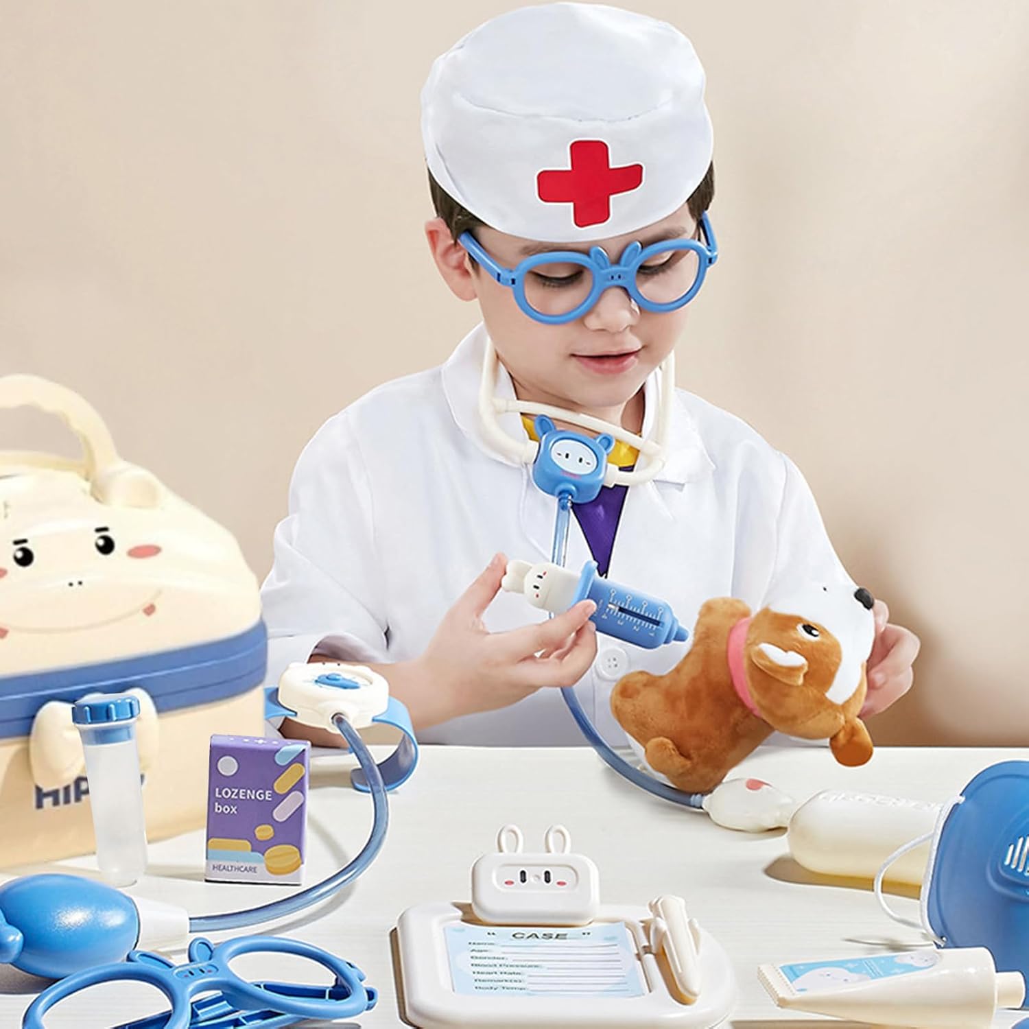 Kit multifunzionale: sviluppa l'empatia e la responsabilità del tuo bambino giocando con il kit di giocattoli multifunzionali per il medico. Lascia che studiino vari ruoli, tra cui stetoscopio, strumenti per denti, farmaci e altro ancora con la loro conoscenza di strumenti e procedure in crescita. Eccellente artigianato: questa splendida versione di Children's Doctor Toy Set è realizzata con squisita fattura e lavorazione eccellente per garantire che non si ferisca alla mano o sbavature sulle superfici. Pratico portatile: lascia che i tuoi bambini giochino ovunque con questo medico giocattolo. Con una comoda valigia, non è un carico per portarsi in giro ed è perfetto per l'uso interno ed esterno. Con il suo design a valigetta, i vostri bambini possono afferrare e camminare senza sforzo per più ore di diver Regalo eccellente: questo set di giocattoli per pediatri è un modo fantastico per promuovere il gioco immaginativo e la creatività nei bambini. È un ottimo regalo per il Ringraziamento, Natale, compleanni o qualsiasi vacanza speciale per sorprendere e deliziare i giovani. Esperienza di novità: questo giocattolo per siringhe simula una vera siringa e consente al bambino di superare l'ansia e divertirsi allo stesso tempo. È dotato di una molla incorporata che può essere recuperata automaticamente quando viene premuta, rendendola facile e sicura.