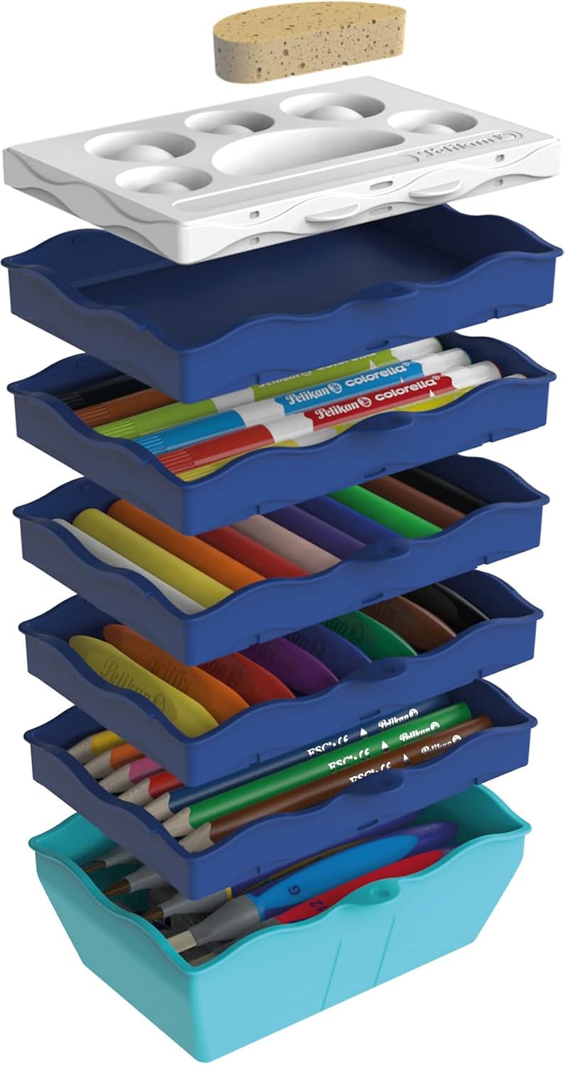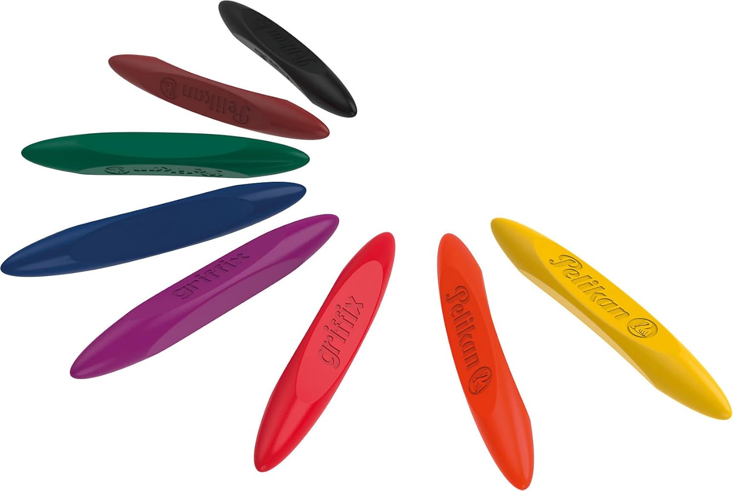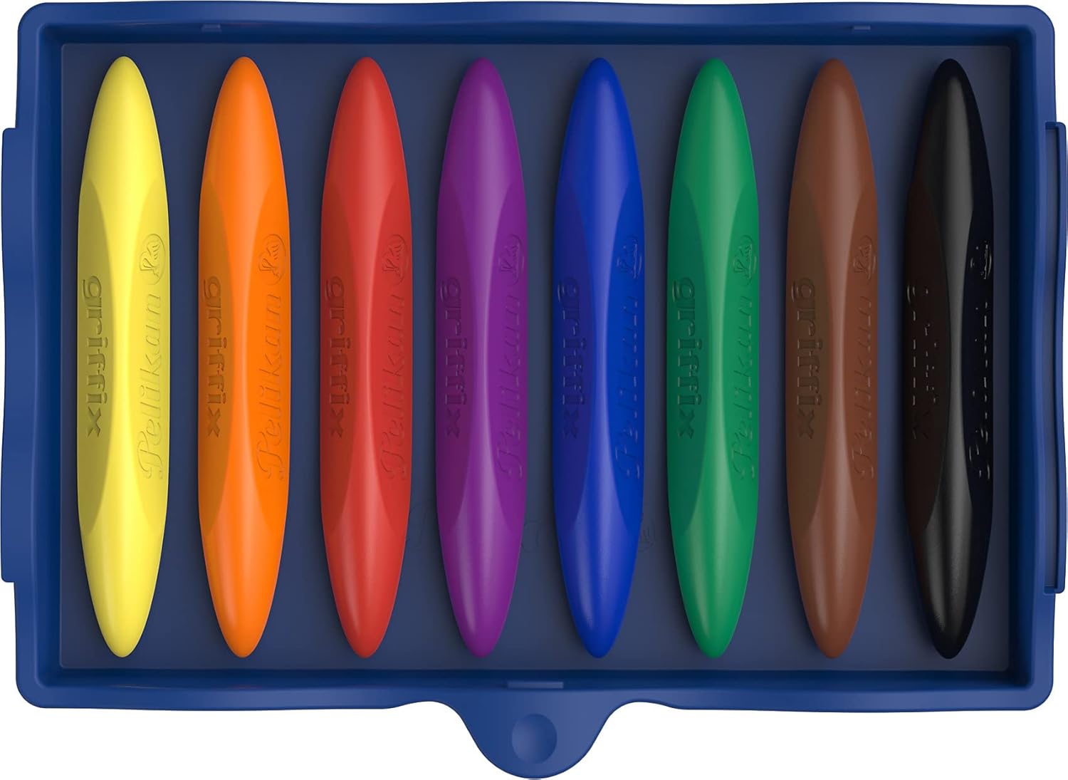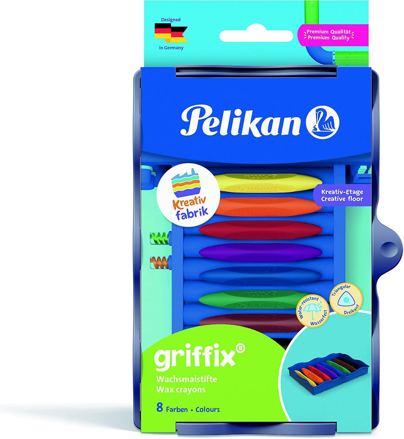 8 pastelli a cera Griffix impermeabili e infrangibili, con una leggera applicazione di colore, con foglio adesivo per indicare e scrivere il nome La forma triangolare adatta ai bambini supporta le capacità motorie dei bambini, universale per destrorsi e mancini In pratico vassoio universale per riporlo facilmente, complemento ideale per la fabbrica creativa e combinabile con altri piani creativi della fabbrica Pelikan Kreativfabrik 8 colori brillanti intensi come giallo, arancione, rosso, viola, blu, verde, marrone, nero 1 pezzo